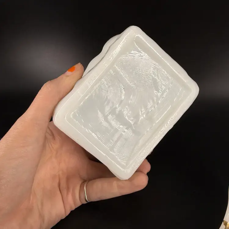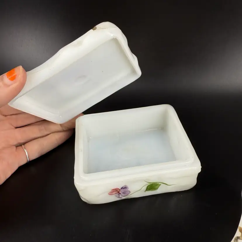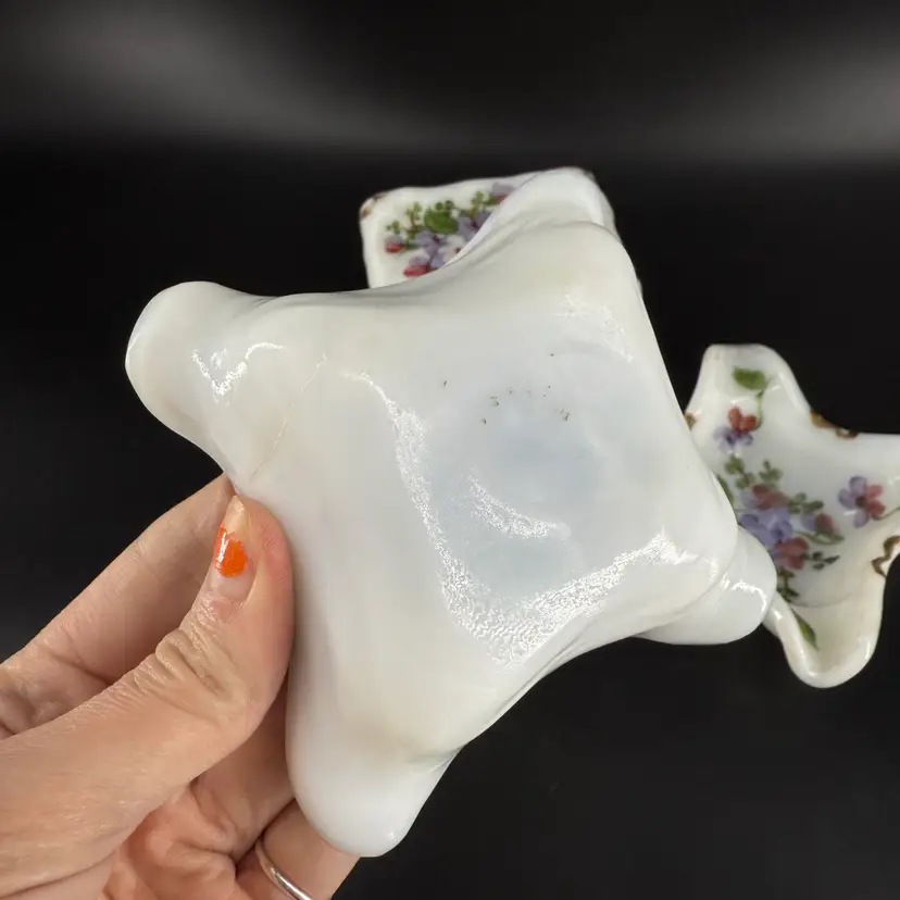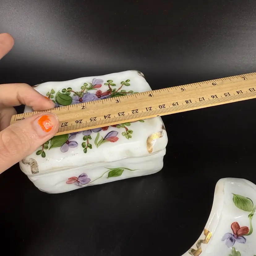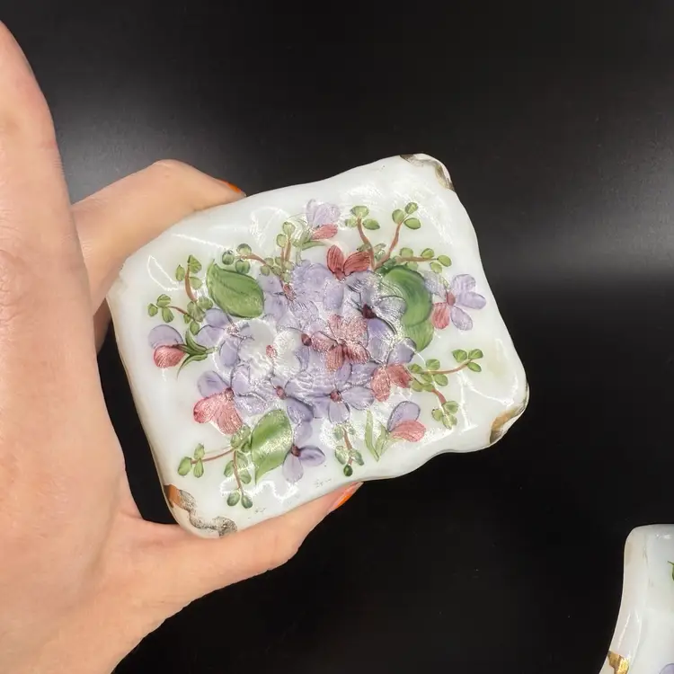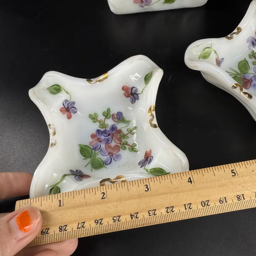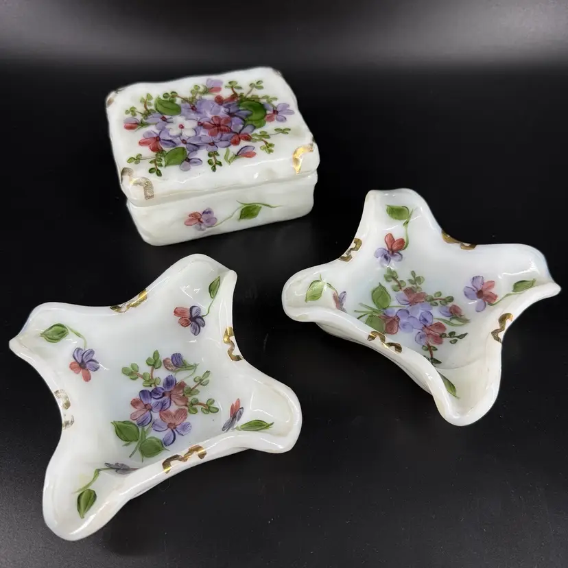 This set includes two ashtrays and a cigarette box. The box and ashtrays measure 4" wide. There are no chips or cracks.