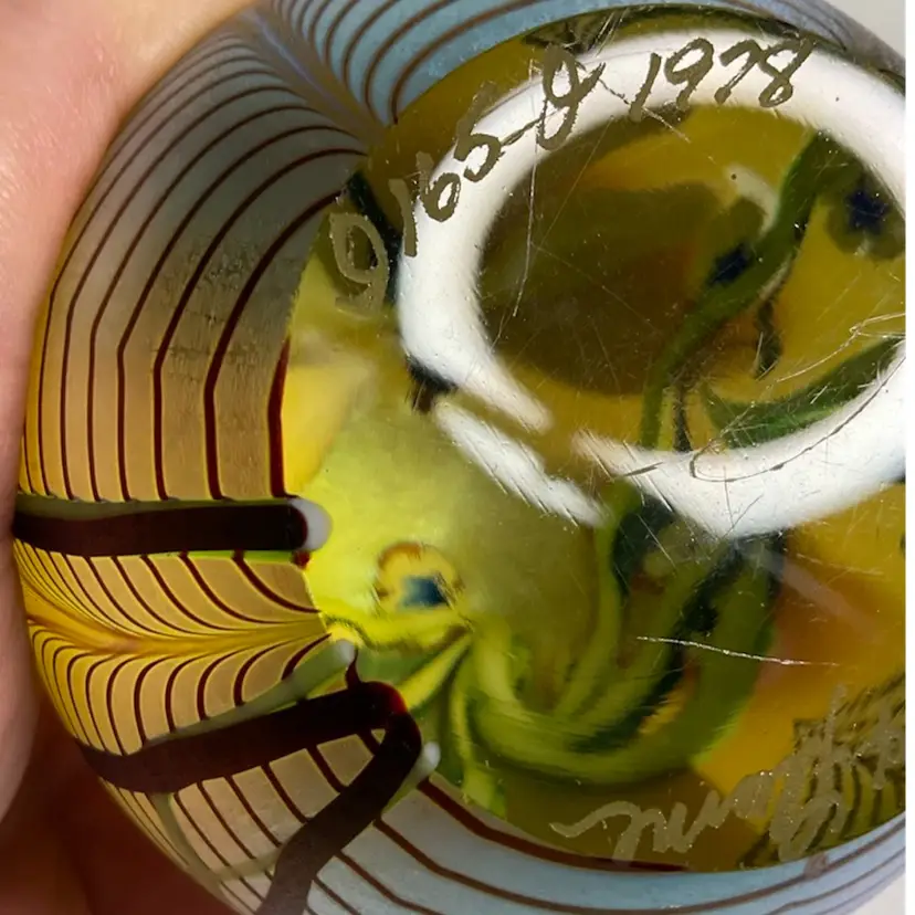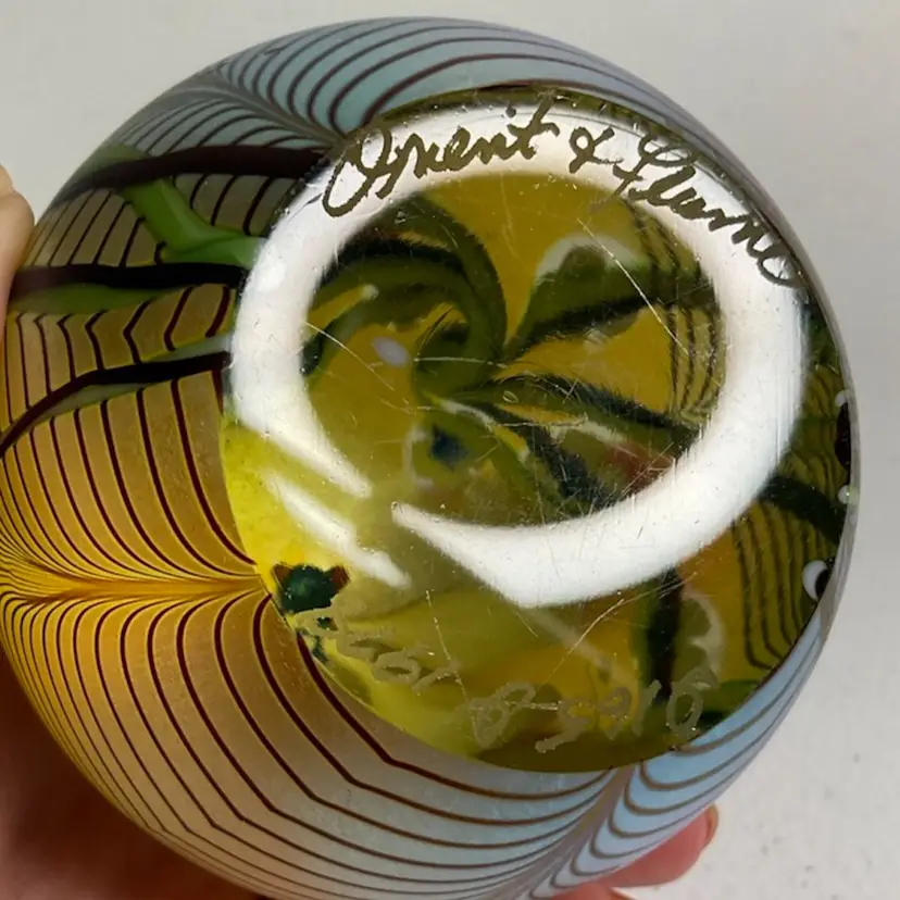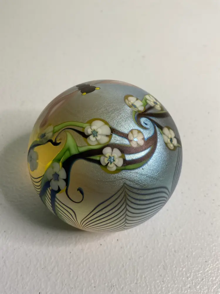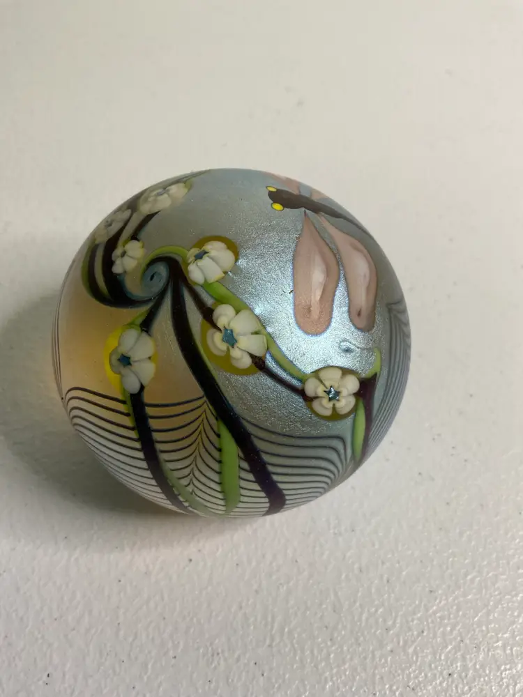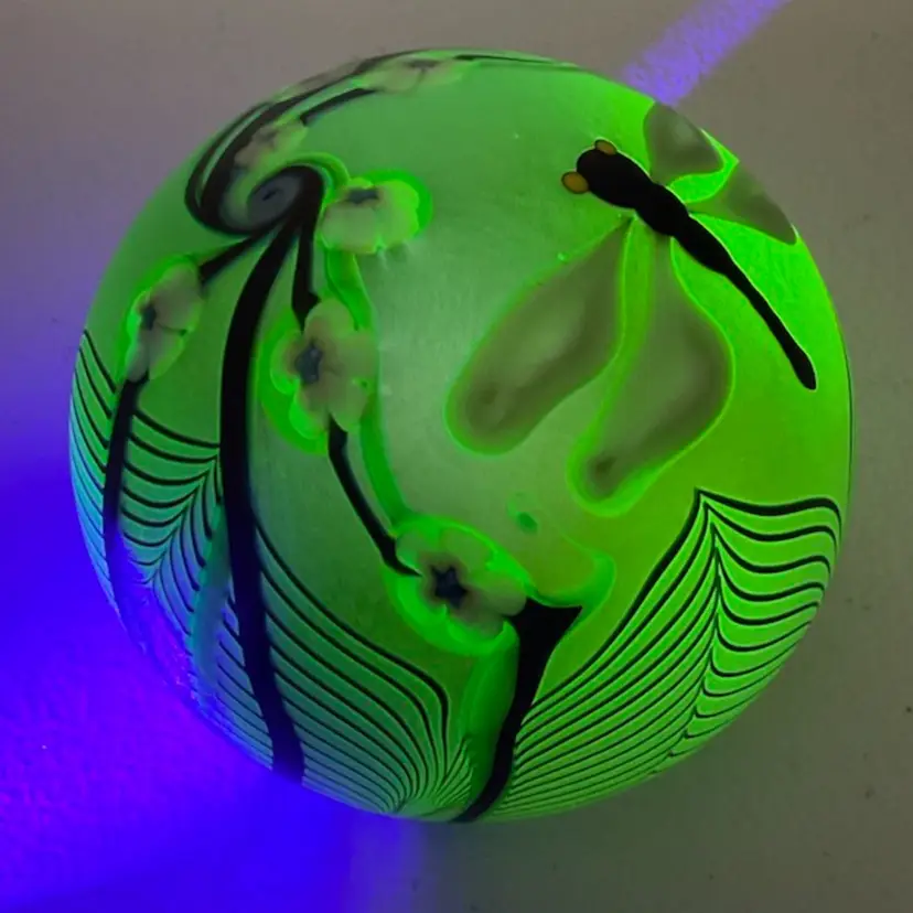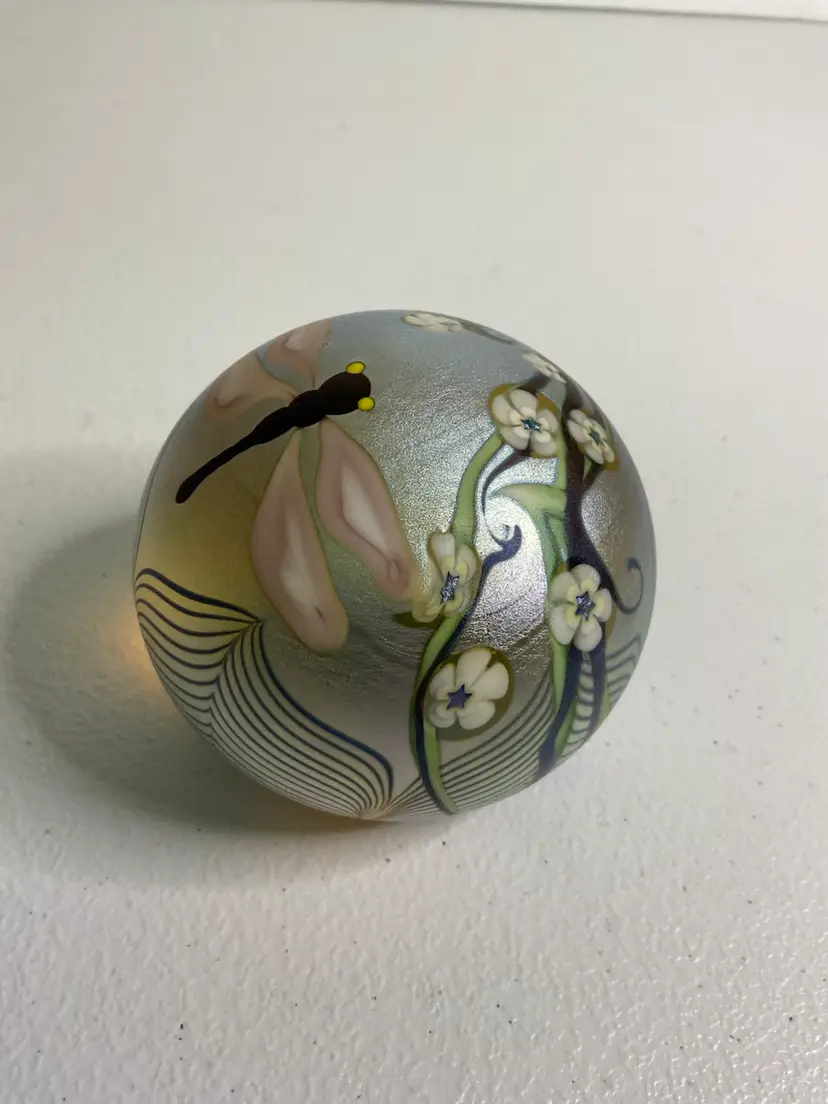 As shown. Beautiful iridescent floral and dragonfly motif glows brightly