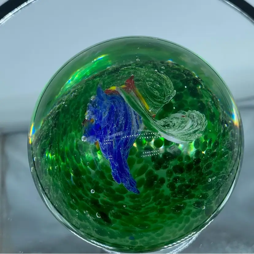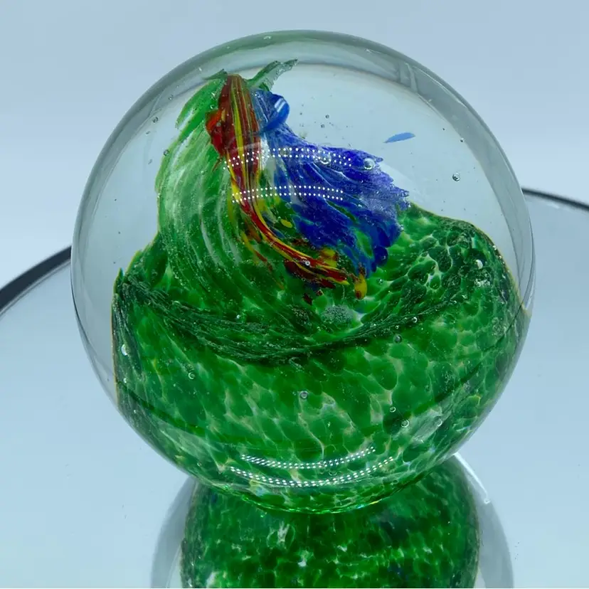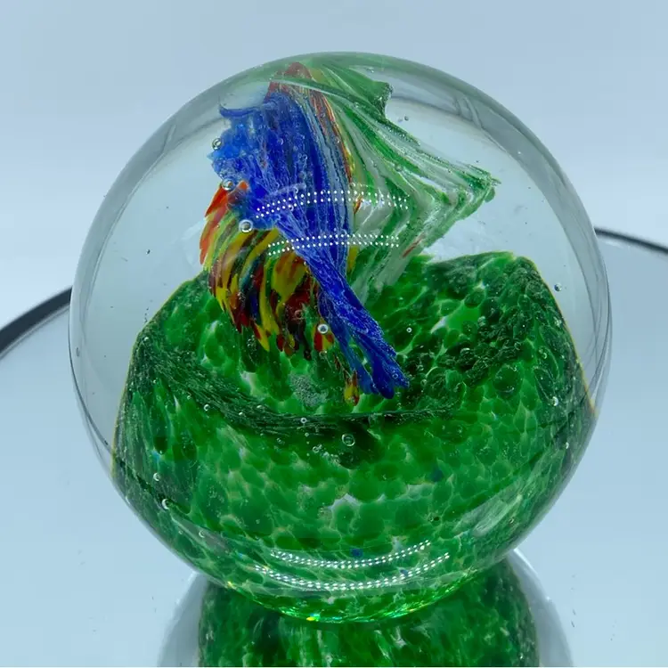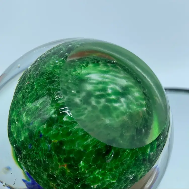 While the exact origin of this particular paperweight is difficult to determine without a maker's mark, its design and craftsmanship suggest it was likely produced in the late 20th or early 21st century. Modern art glass paperweights continue to be popular among collectors, with many contemporary artists creating unique and innovative designs.