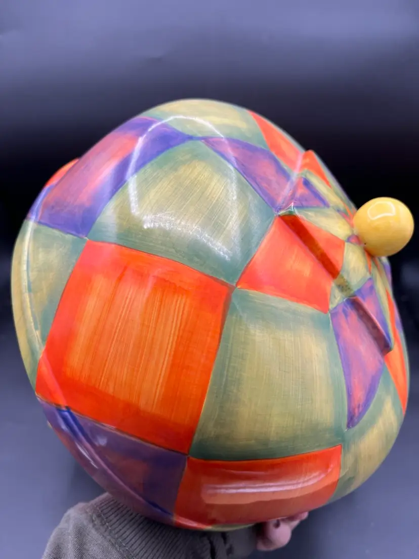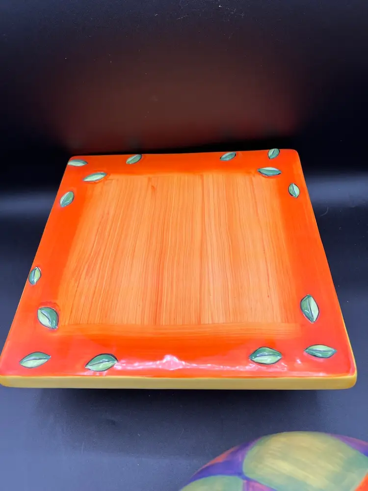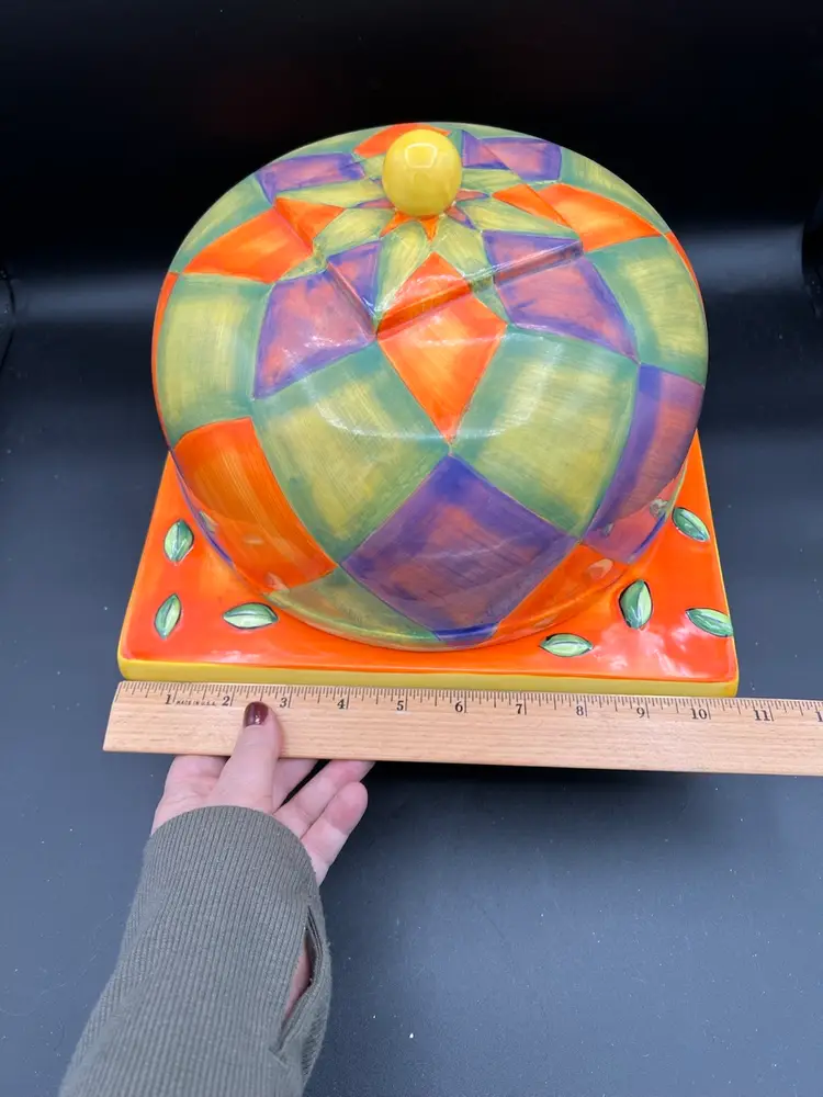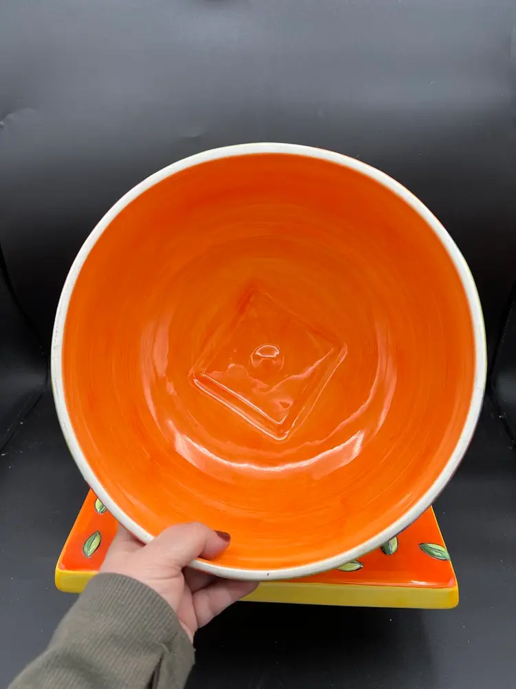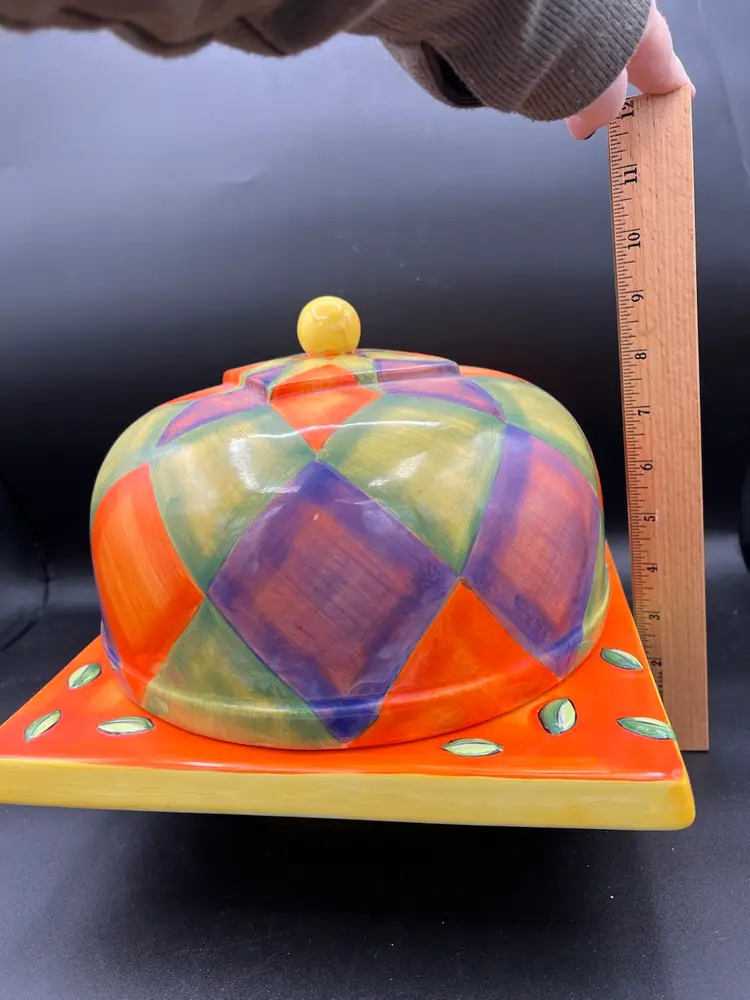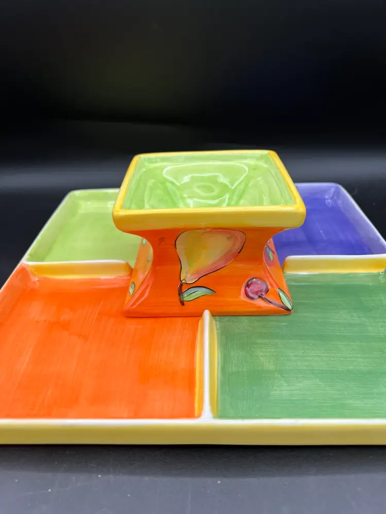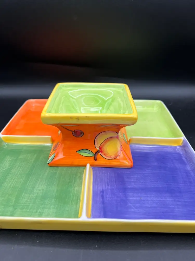 What a fun piece! You can use it as a cake stand or you can flip the base and it becomes an appetizer plate with a center bowl for a dip. Very good condition.