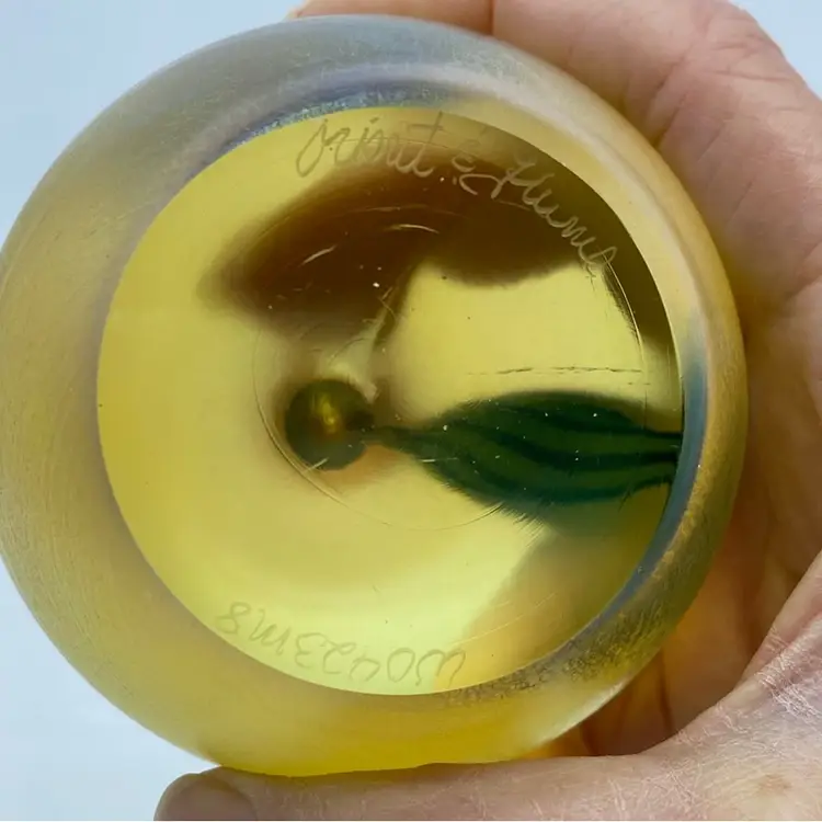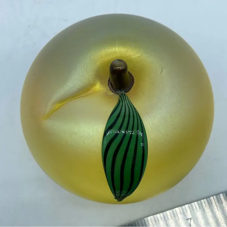 This particular apple paperweight exemplifies the studio's mastery of glassblowing and decorative techniques. The iridescent golden hue, combined with the detailed leaf and stem, showcases the artistry involved in its creation. Such pieces were often made as decorative desk accessories or collectible art objects, reflecting the era's appreciation for fine craftsmanship and unique home decor. The presence of the leaf and stem adds a touch of realism and charm, making it a desirable item for collectors of studio art glass.