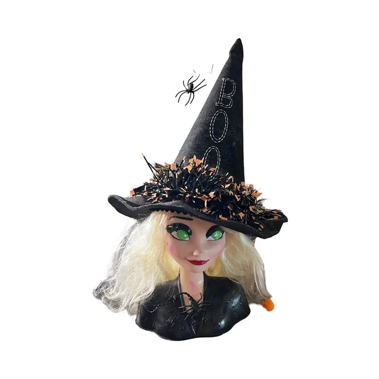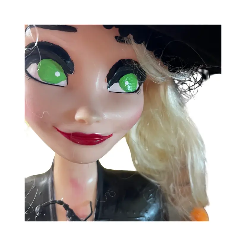 Up cycled and hand painted by me. The hat is not attached so that she could be shipped properly. She is approximately with the hat on 16 inches tall.