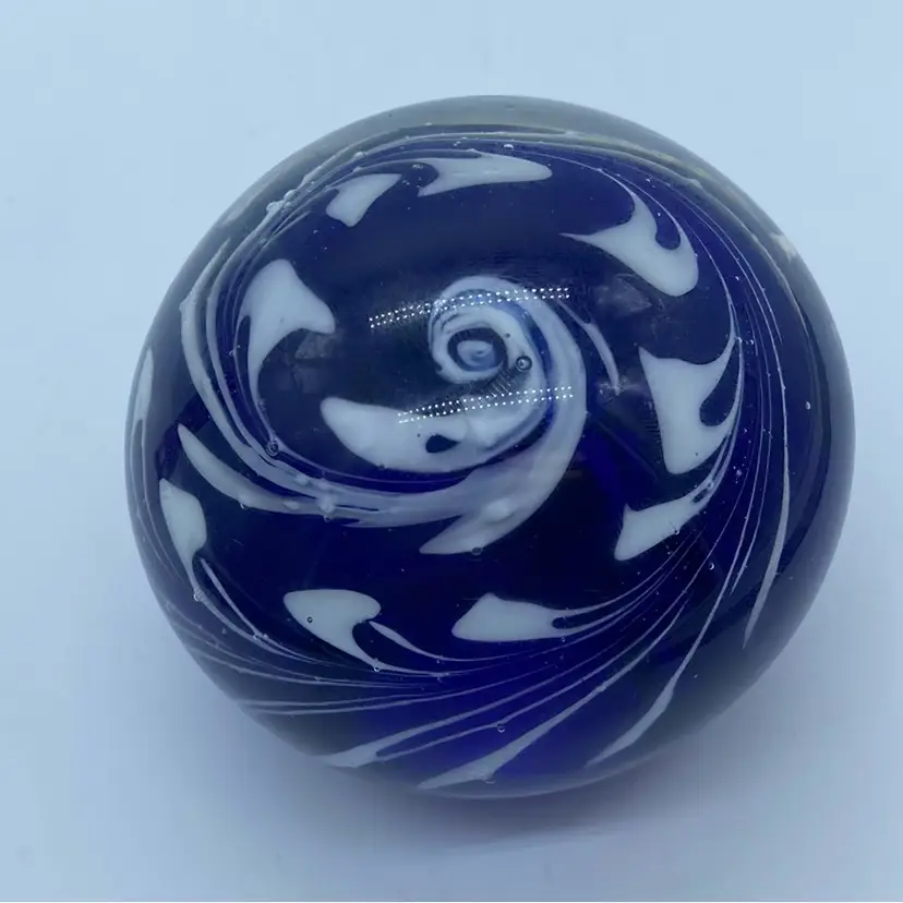 This particular style, with its swirling patterns within a solid glass sphere, is a common motif in contemporary art glass. The vibrant cobalt blue and contrasting white create a visually striking effect, often achieved through controlled heating and manipulation of molten glass. Such pieces are popular as decorative accents and collectibles, appreciated for their craftsmanship and aesthetic appeal.