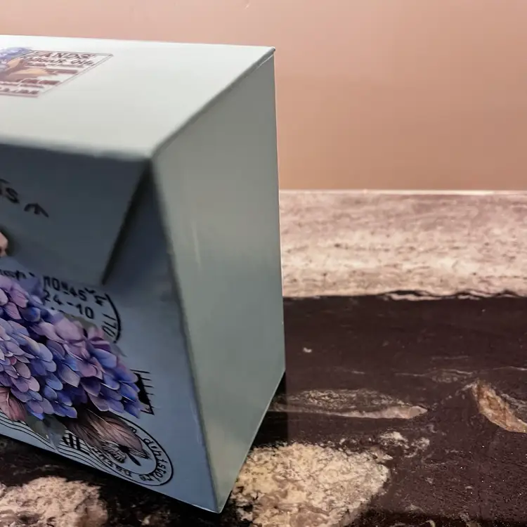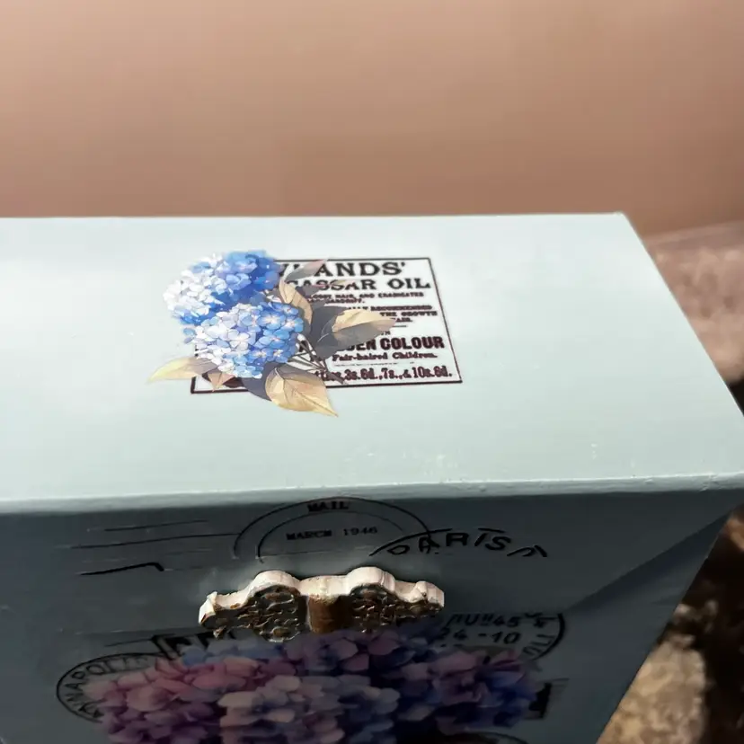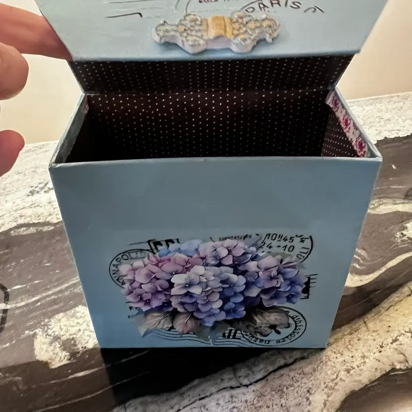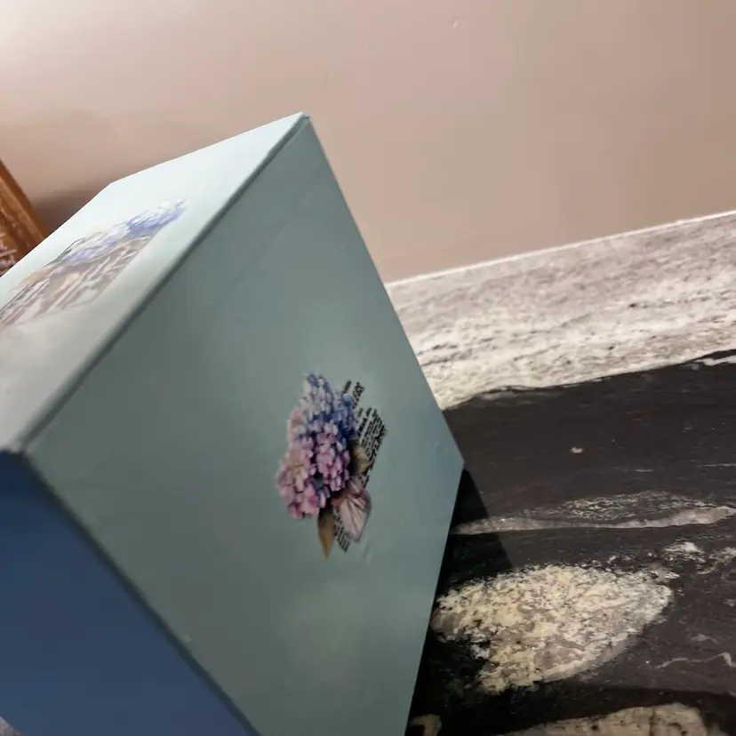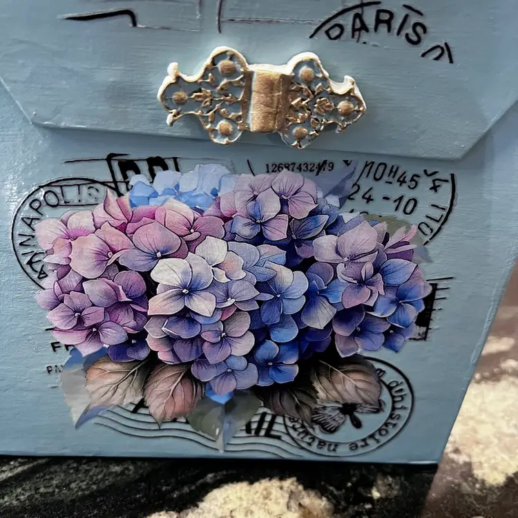 Hand painted by me I also did the transfer. It has been sealed approximately 6 1/2 inches long 7 1/2 inches tall has a magnetic closure. It is made of a really hard like cardboard.