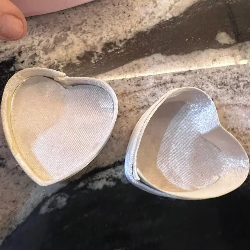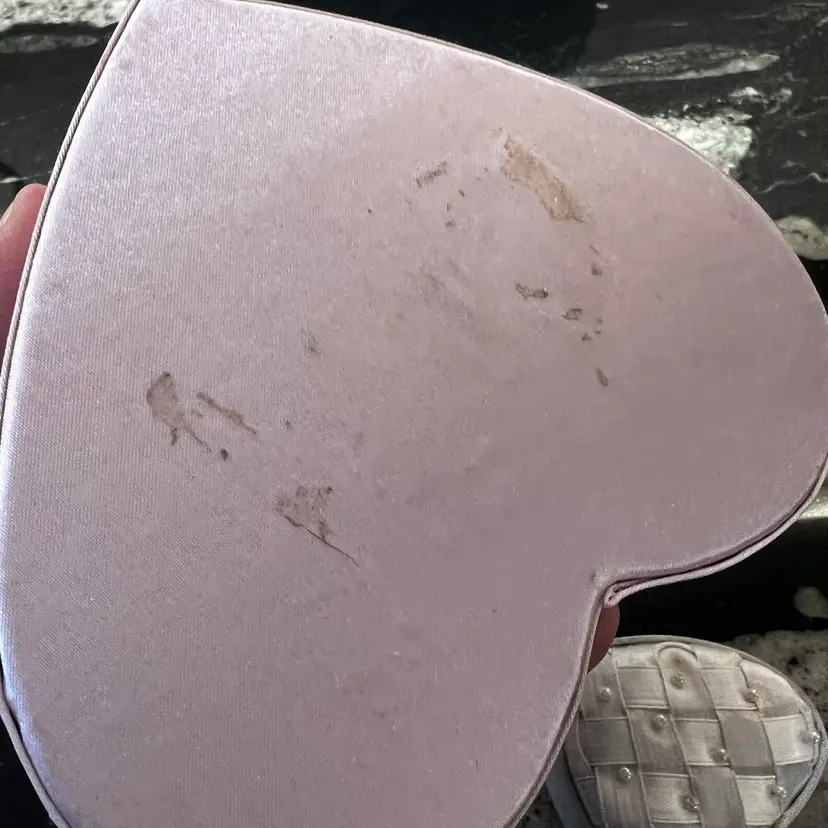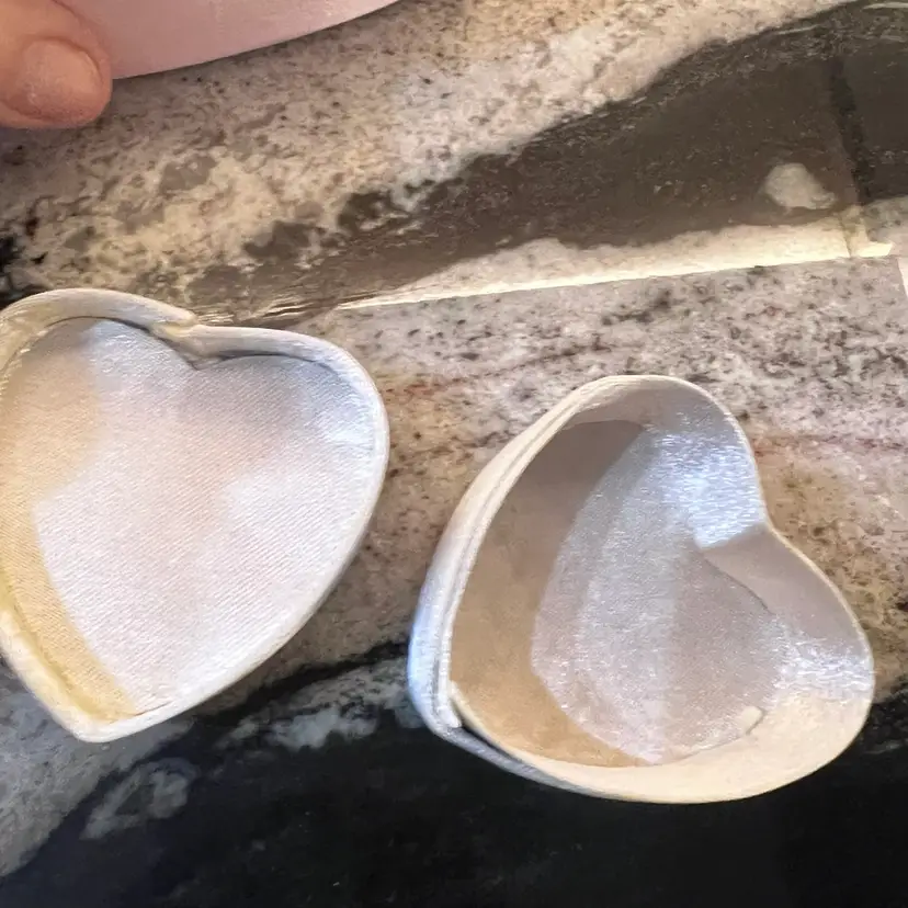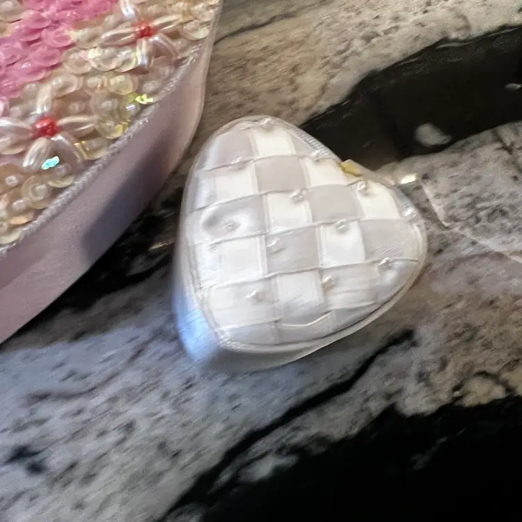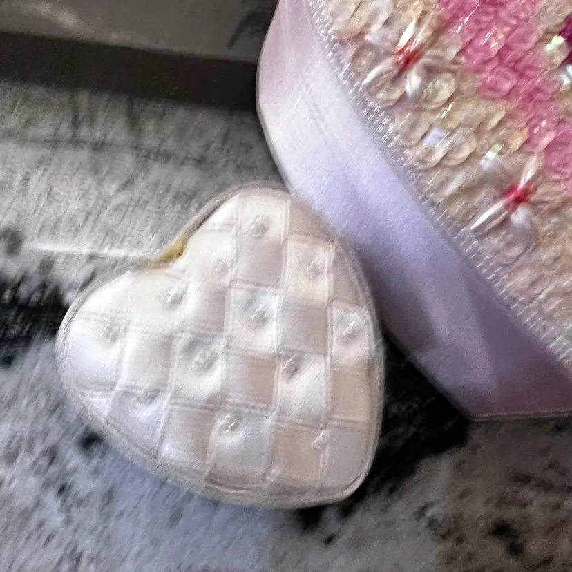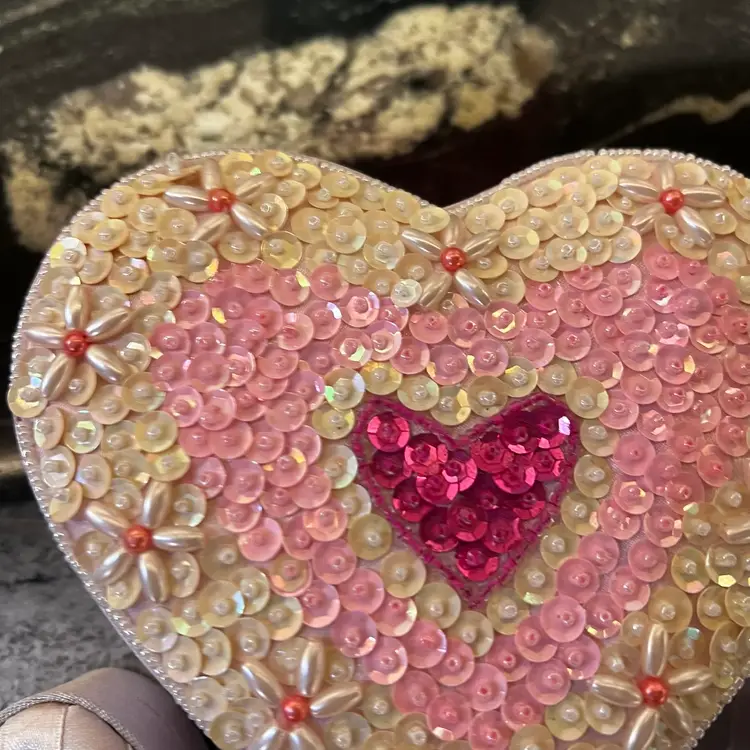 The pink heart has beautiful sequins all over it. It is approximately 5 inches across there are two smaller white ones with little pearls on them on the inside. Those are about 2 inches across the pink one does have some marks on the back as shown.
