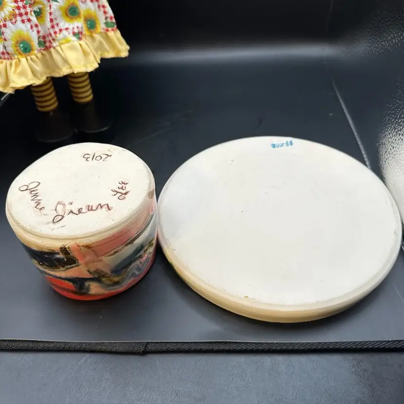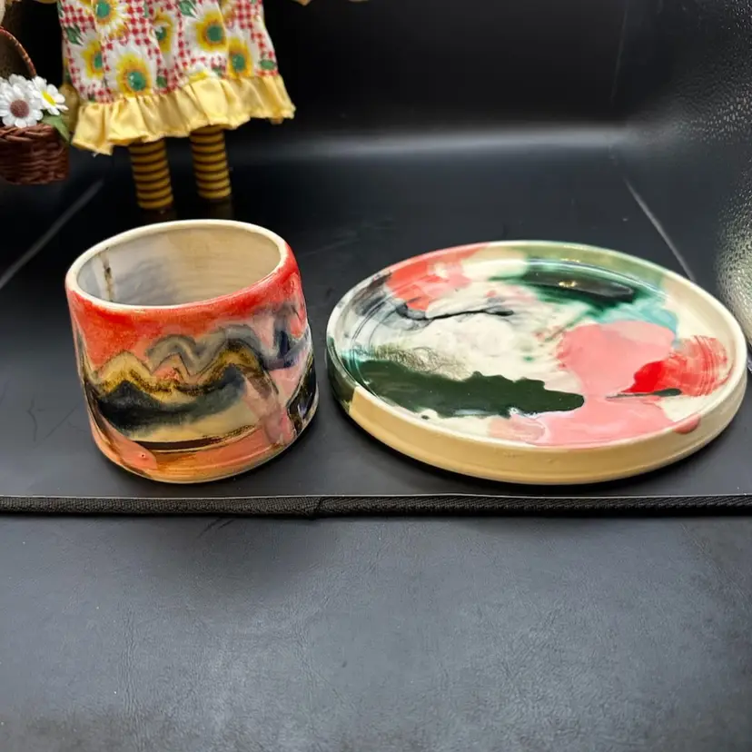 A 3 inch tall 3 inch wide cup and a 7 inch wide plate or small serving platter, featuring abstract, colorful glazes.