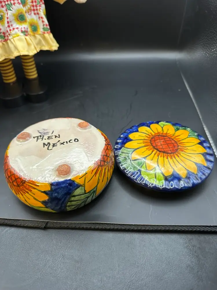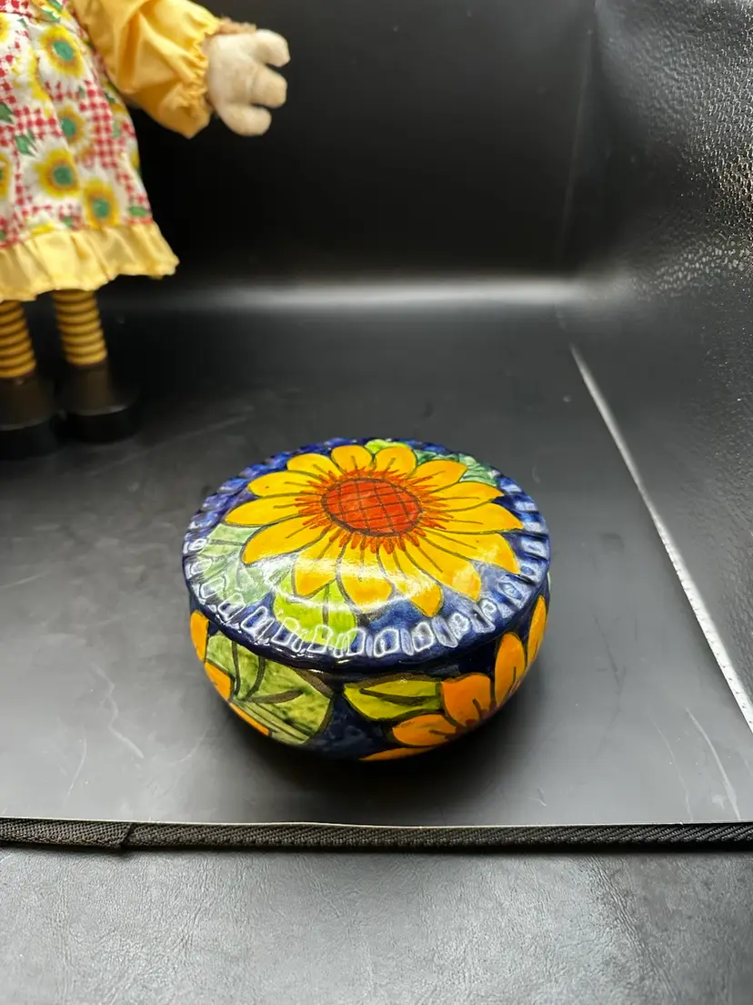Talavera pottery box with golden yellow sunflowers against a dark blue background.