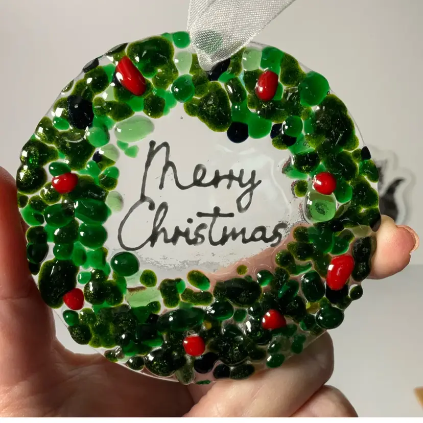 Fused glass wreath ornament/sun catcher from Pam Peter’s in North Wales, UK