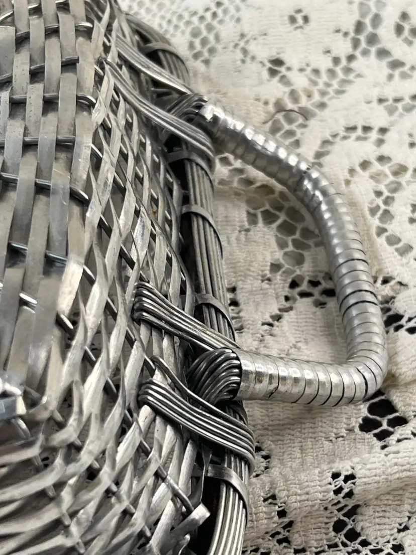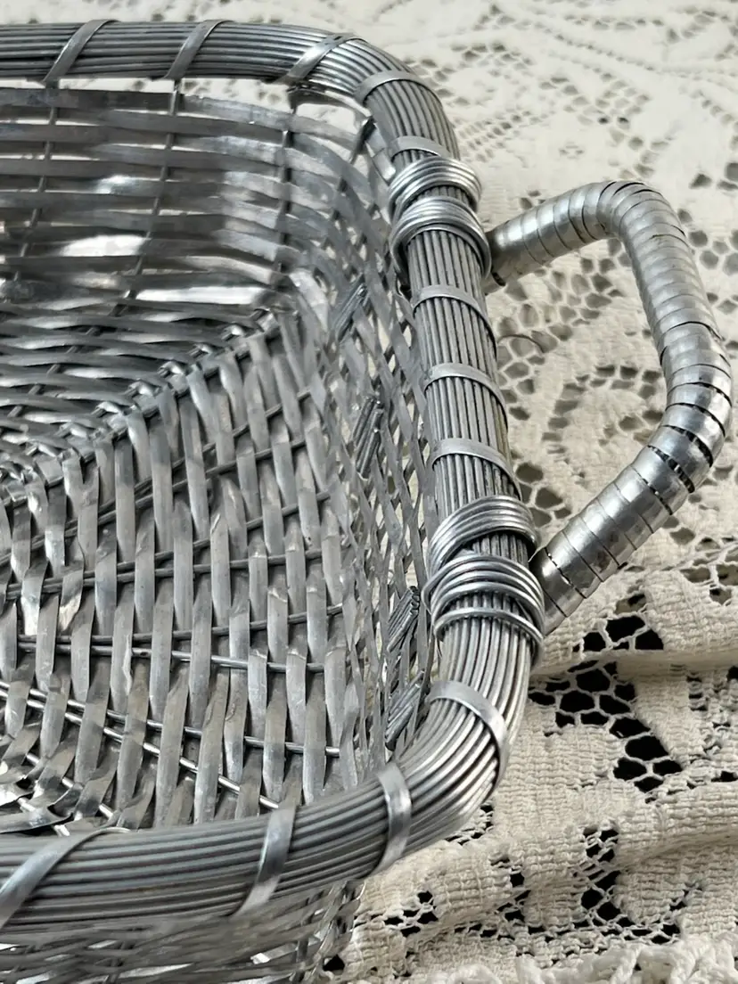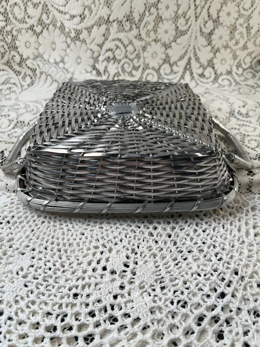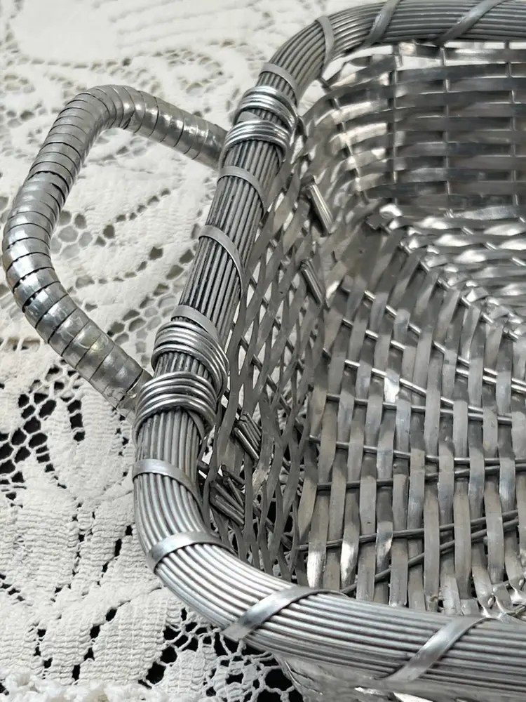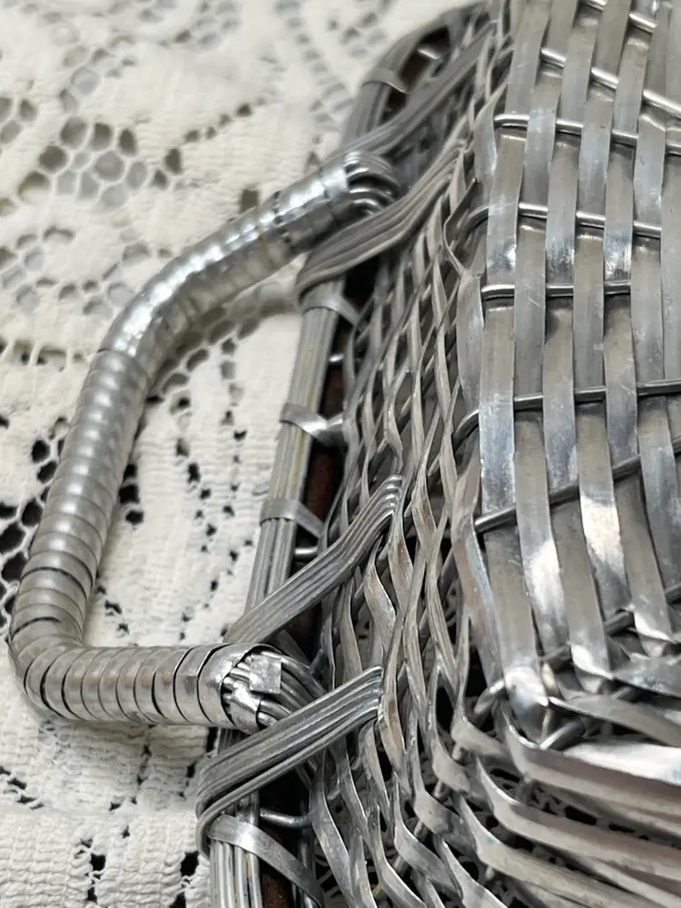 011 French Style Aluminum Or Silver Plate Strips Woven Handled Basket MCM 60S 12.75 X 9.5 X 3.25"