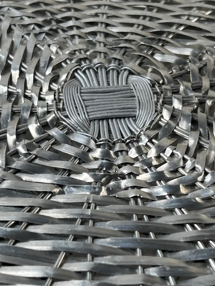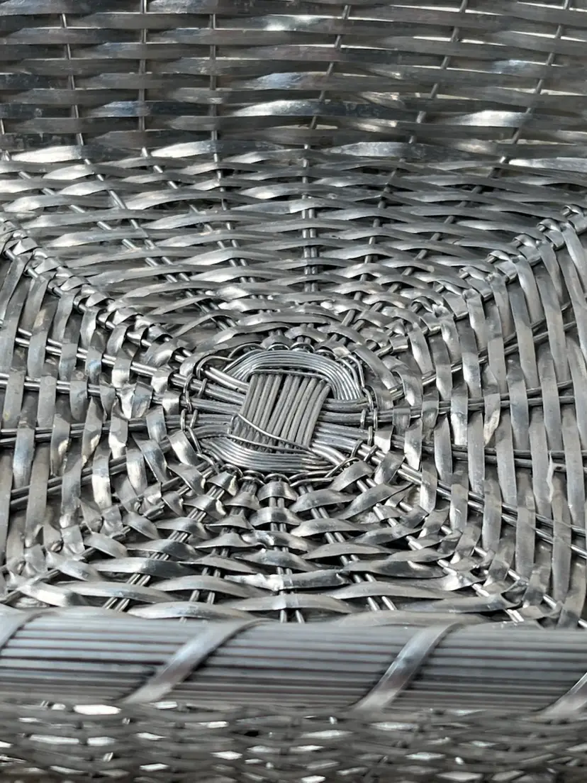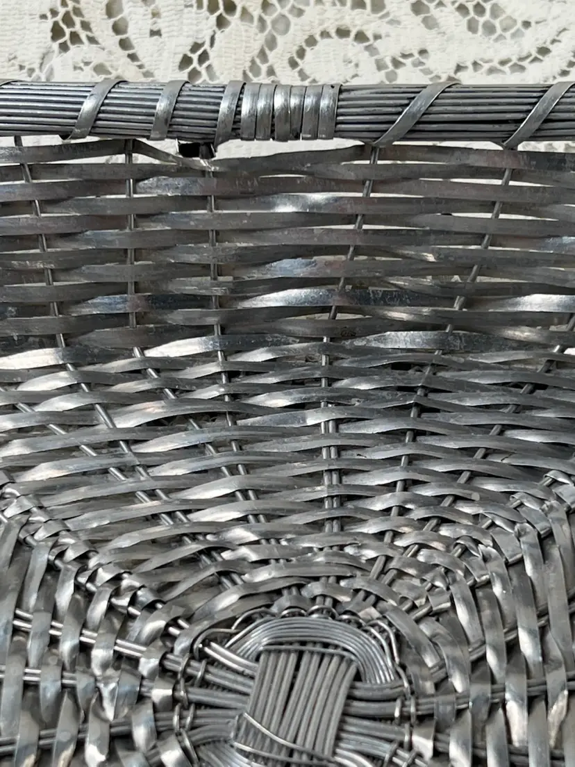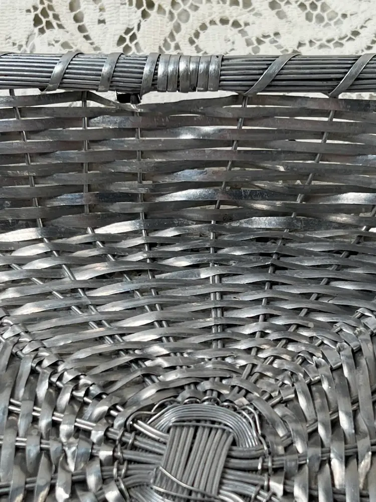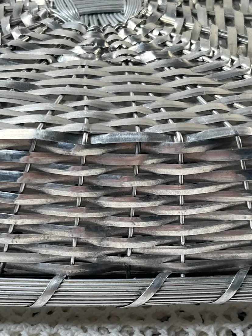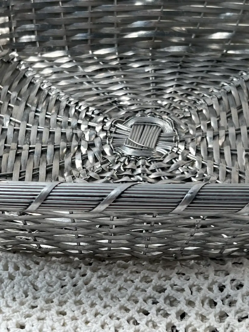 011 French Style Aluminum Or Silver Plate Strips Woven Handled Basket MCM 60S 12.75 X 9.5 X 3.25"