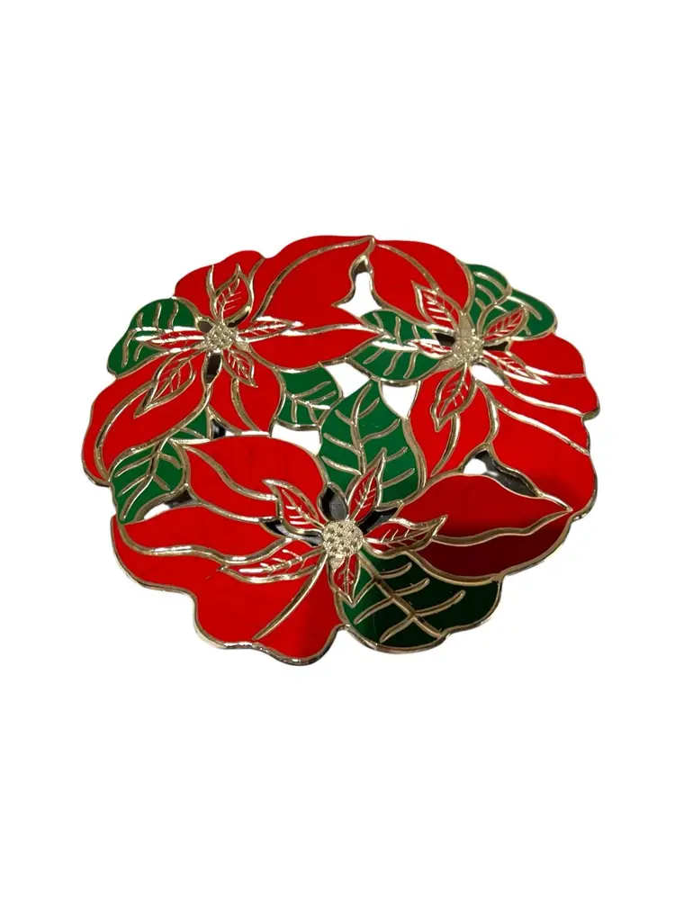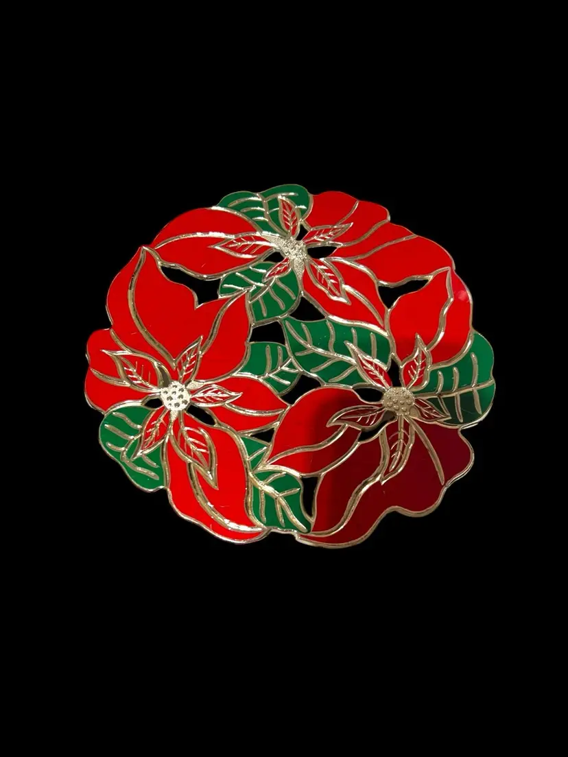 Vintage Tarnish Resistant Reticulated Enamel Metal Poinsettia With 4 Feet Trivet