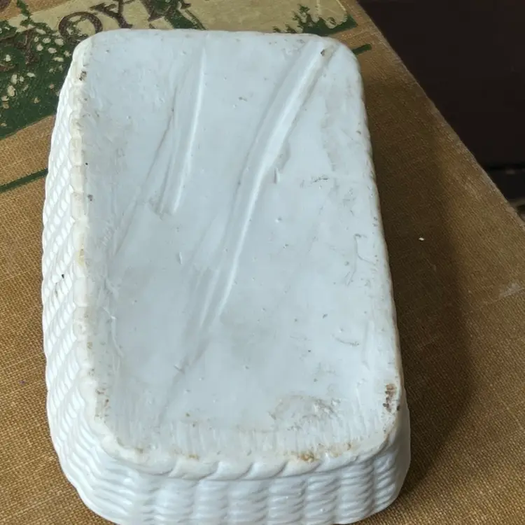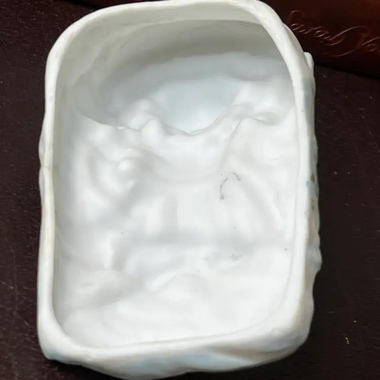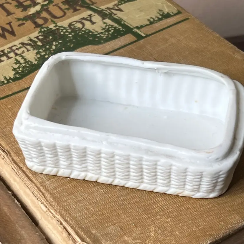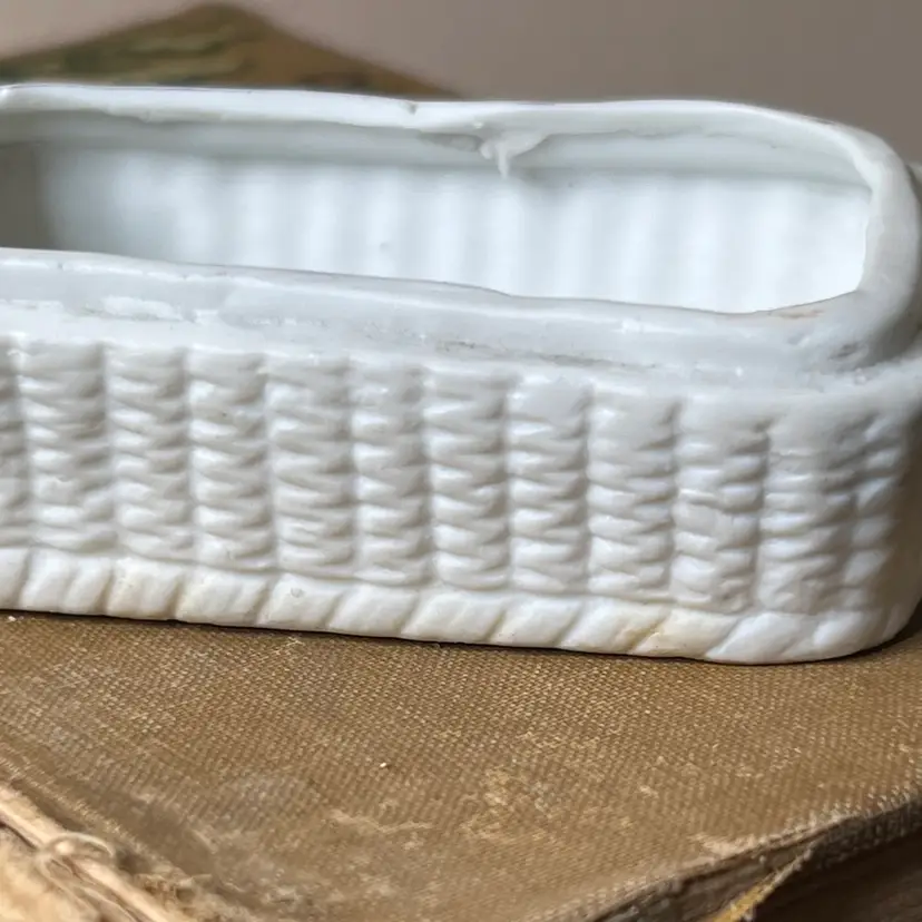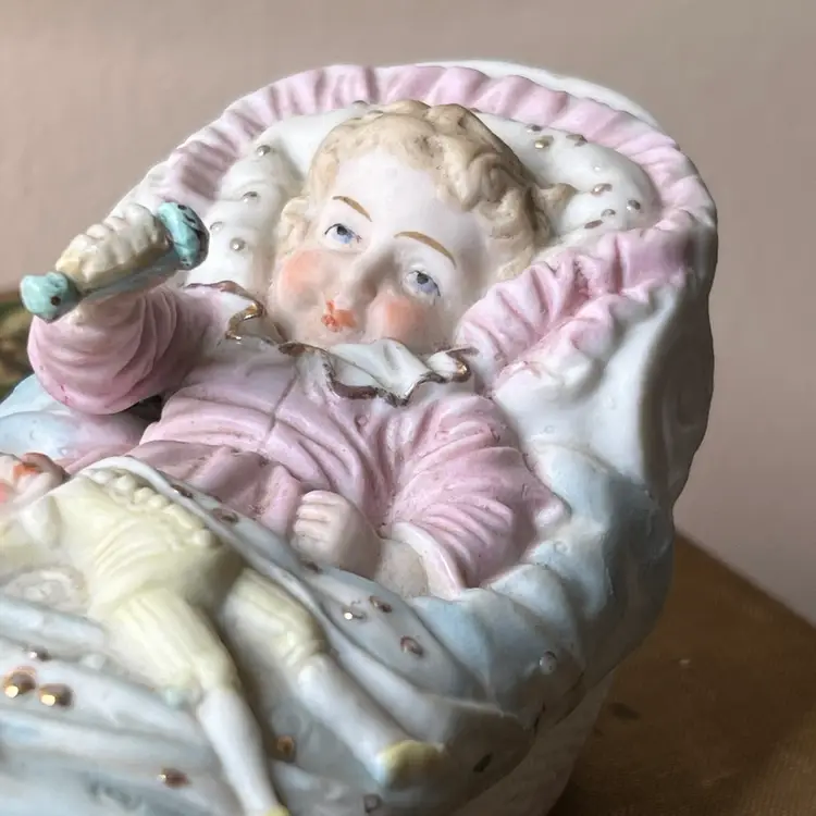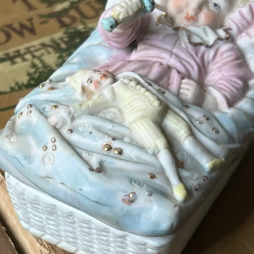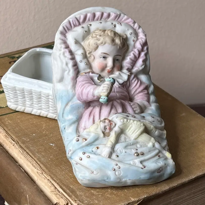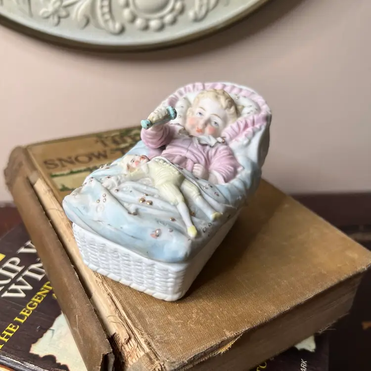 015 Antique German Fairing Trinket Box Bisque Ceramic Baby In A Woven Bassinet 4.5" X 2.5" X 2.5"