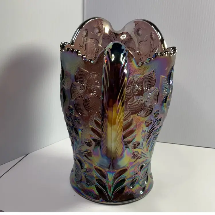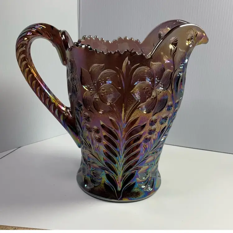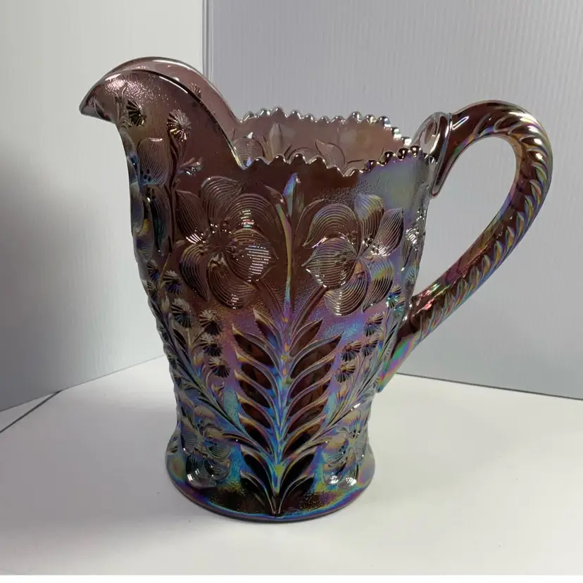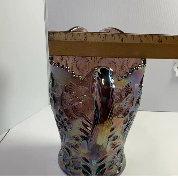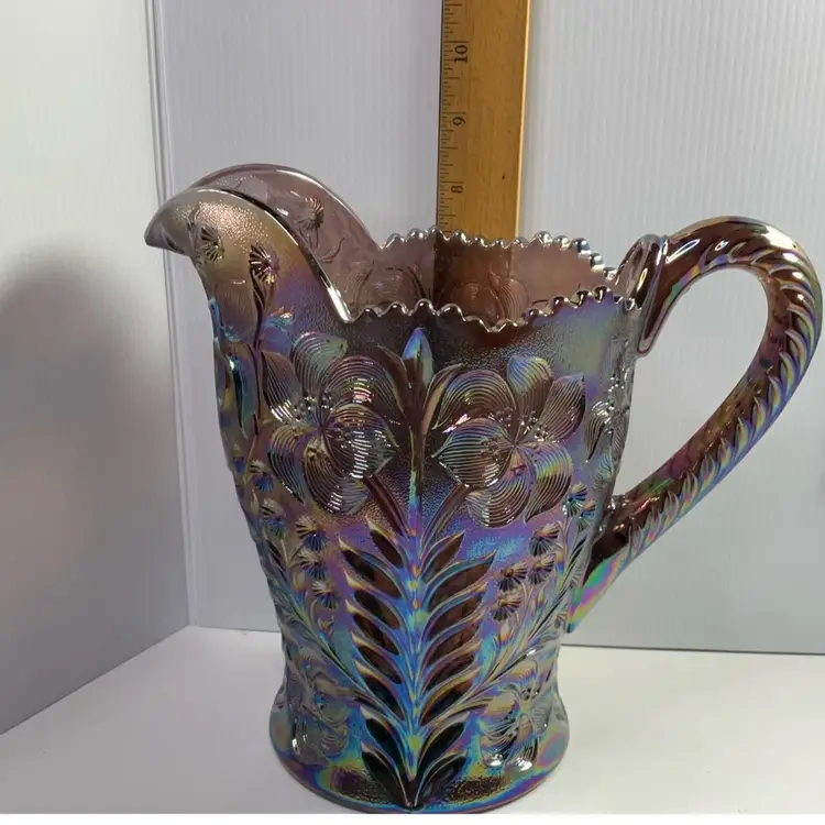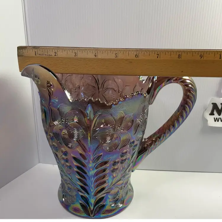 As shown. No chips or cracks. May show straw marks. 7.5 inches deep. 8 inches tall to top of spout. 5 inches across.