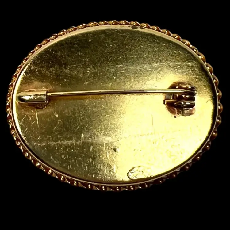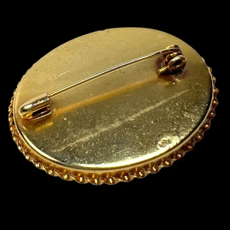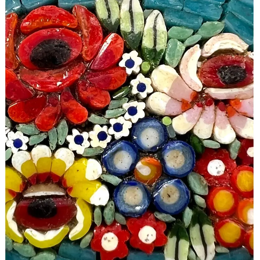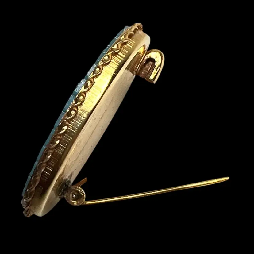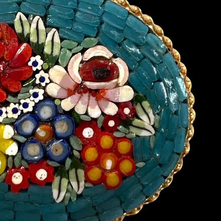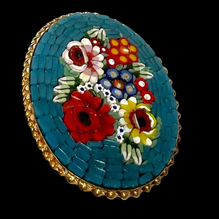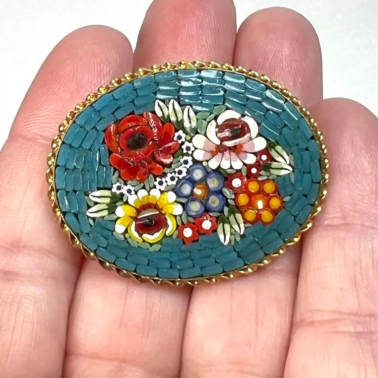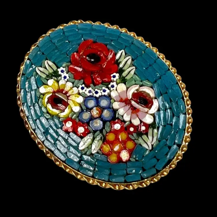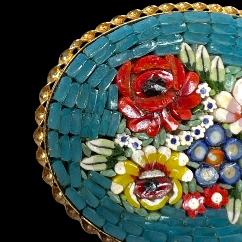 Oval Flower Micro Mosaic Brooch Gold-tone with Sturdy Hinge & C-clasp Tiny glass tiles form a floral scene of red, yellow pink, white, and blue flower bouquet with greenery Beautiful cerulean-turquoise blue tile background color Not marked 1-1/2” Length x 1-1/4” Height Lightweight < 1 ounce Condition: No missing tiles! Bright shiny golden metal.