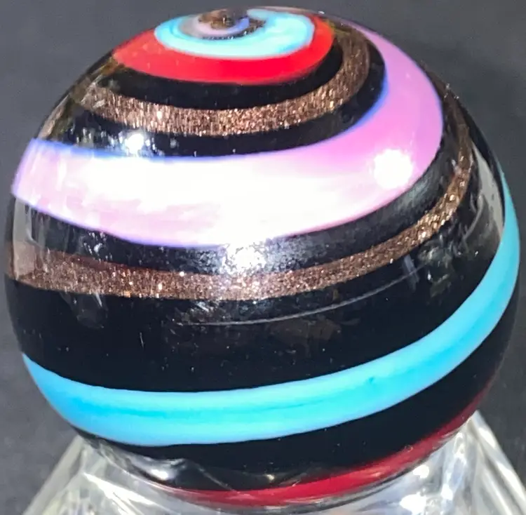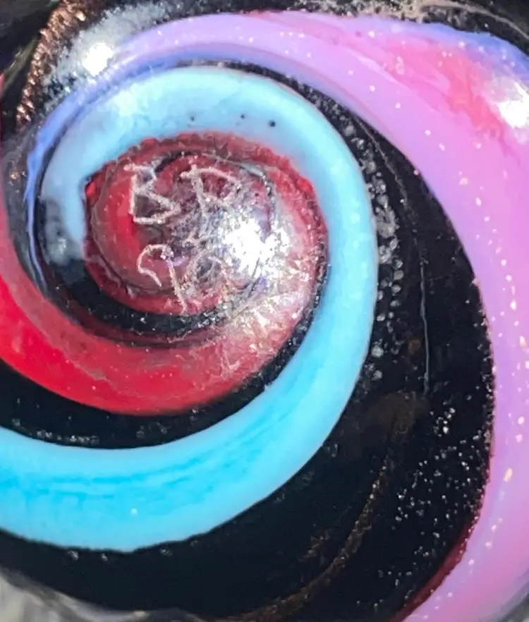 SALE- 25% Off 1 1/8" Signed Red Lavender Blue Black Gold Corkscrew Marble Front And Back Photos (was $28)