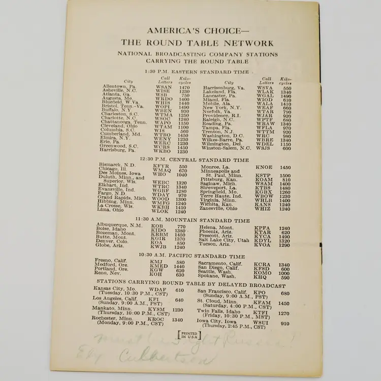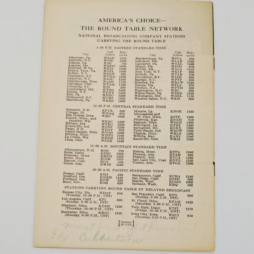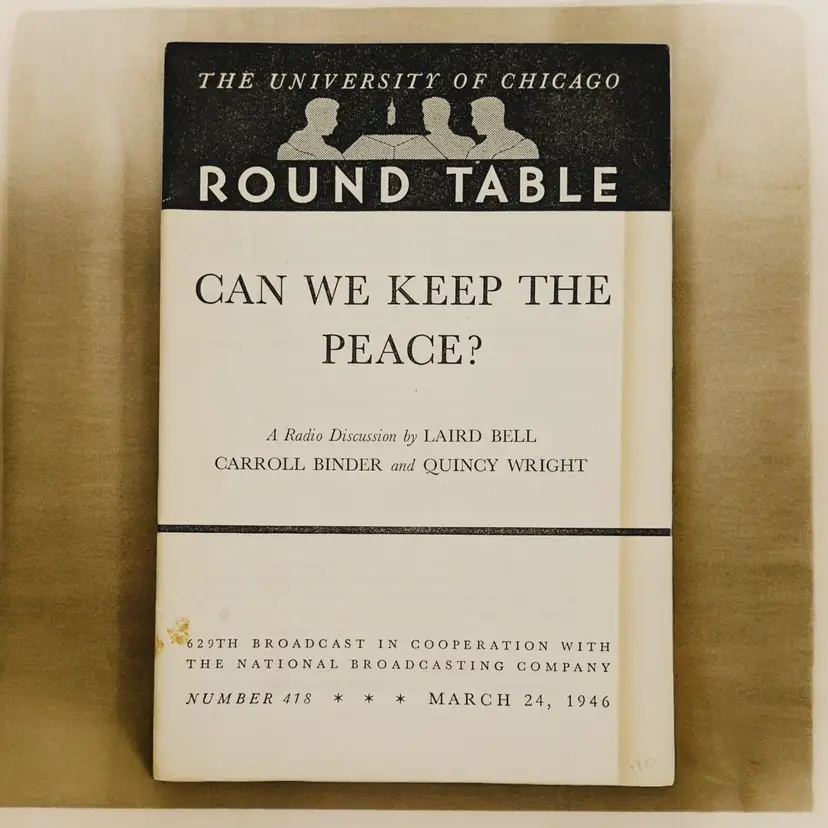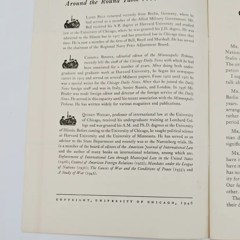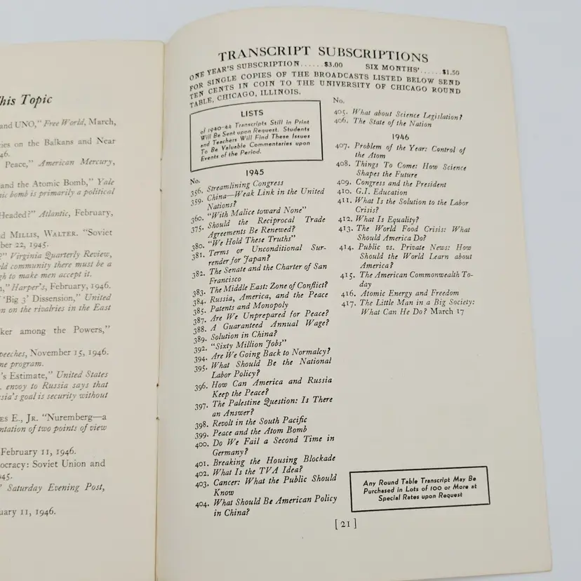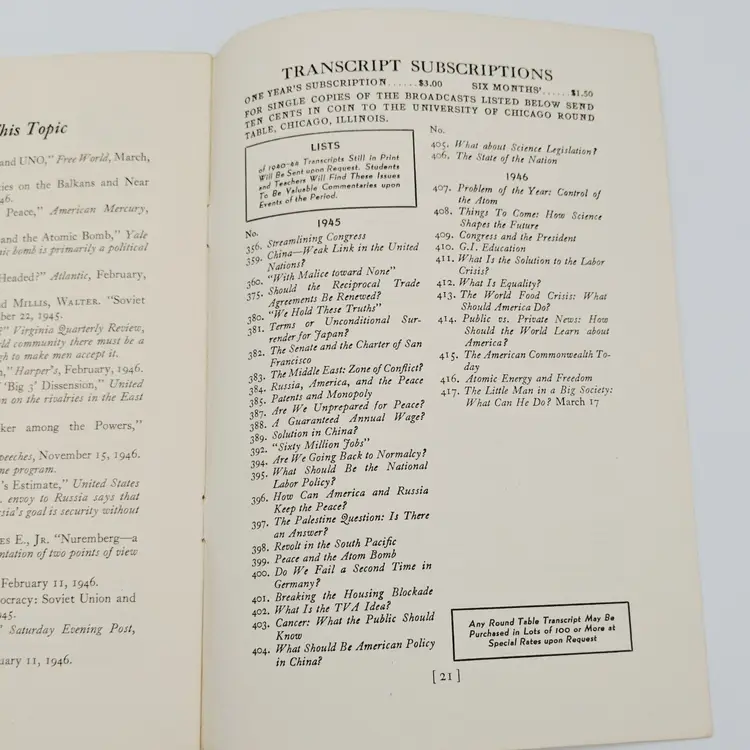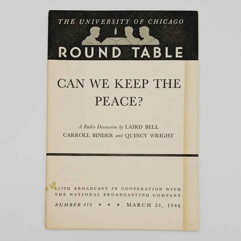 Binding: Stapled Paper Pamphlet-script Place of Publication: Chicago Publisher: University of Chicago Press Year Printed: 1946 Special Attributes: Radio Transcript Discussion Topic: World Country/Region of Manufacture: United States