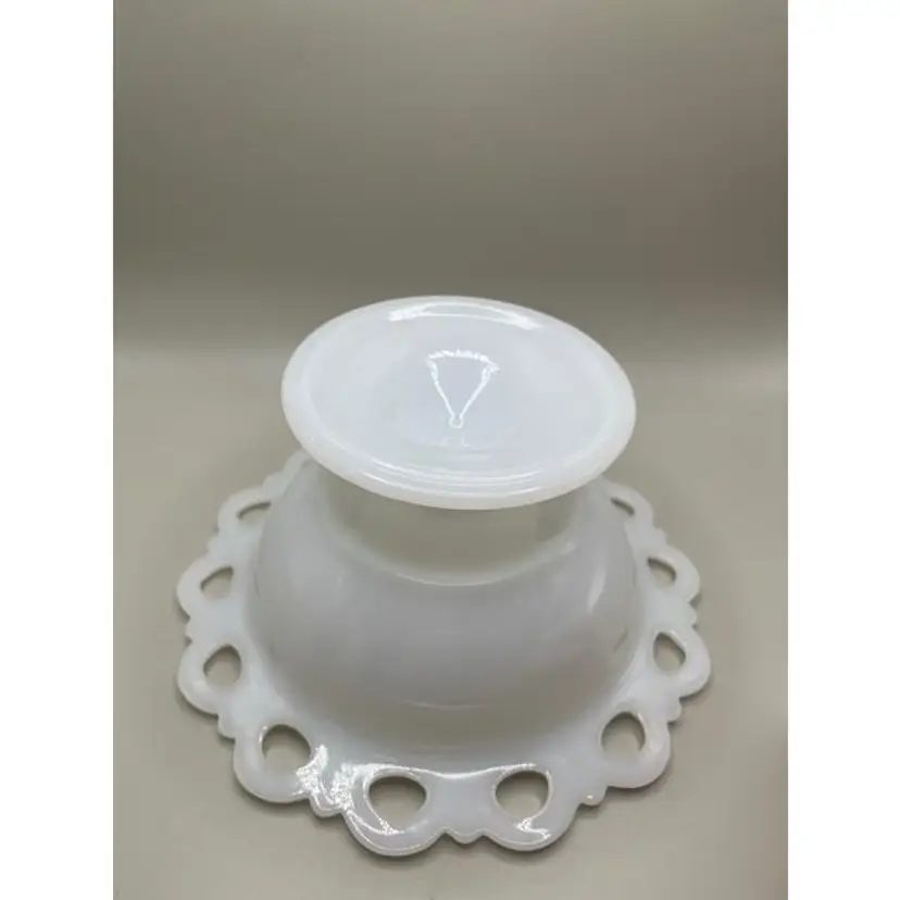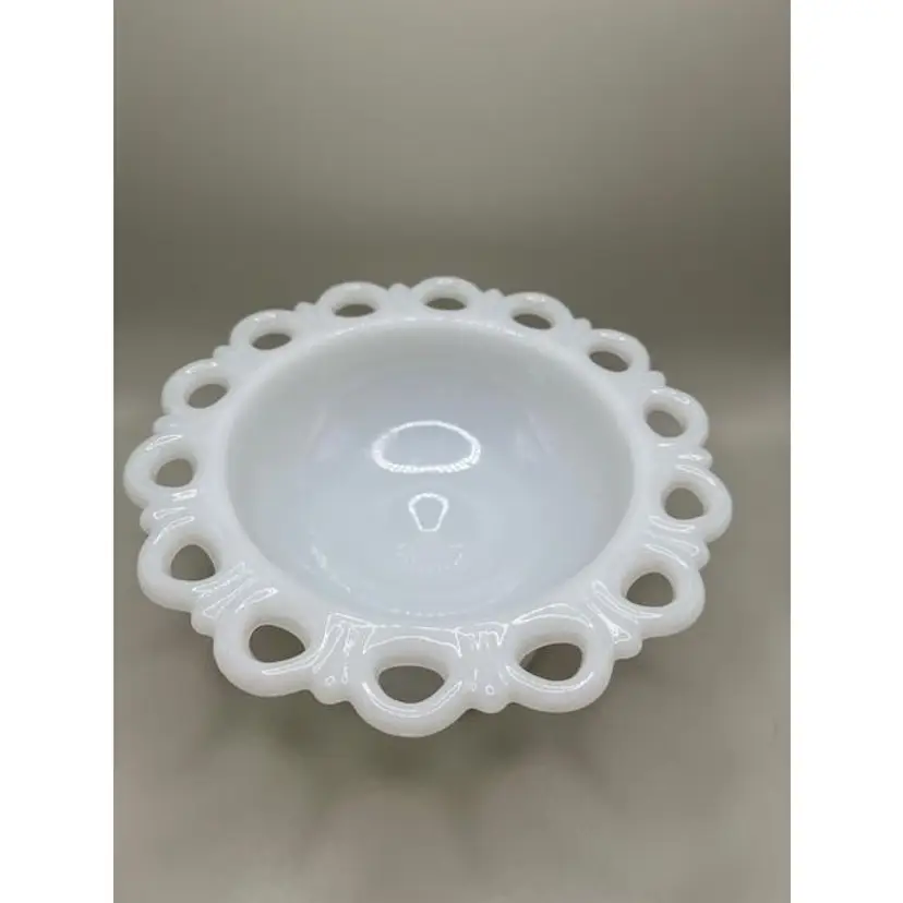 This elegant vintage milk glass compote bowl features a charming scalloped edge, perfect for adding a touch of classic style to your home decor. Ideal for serving or as a decorative centerpiece.