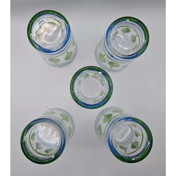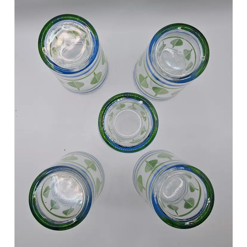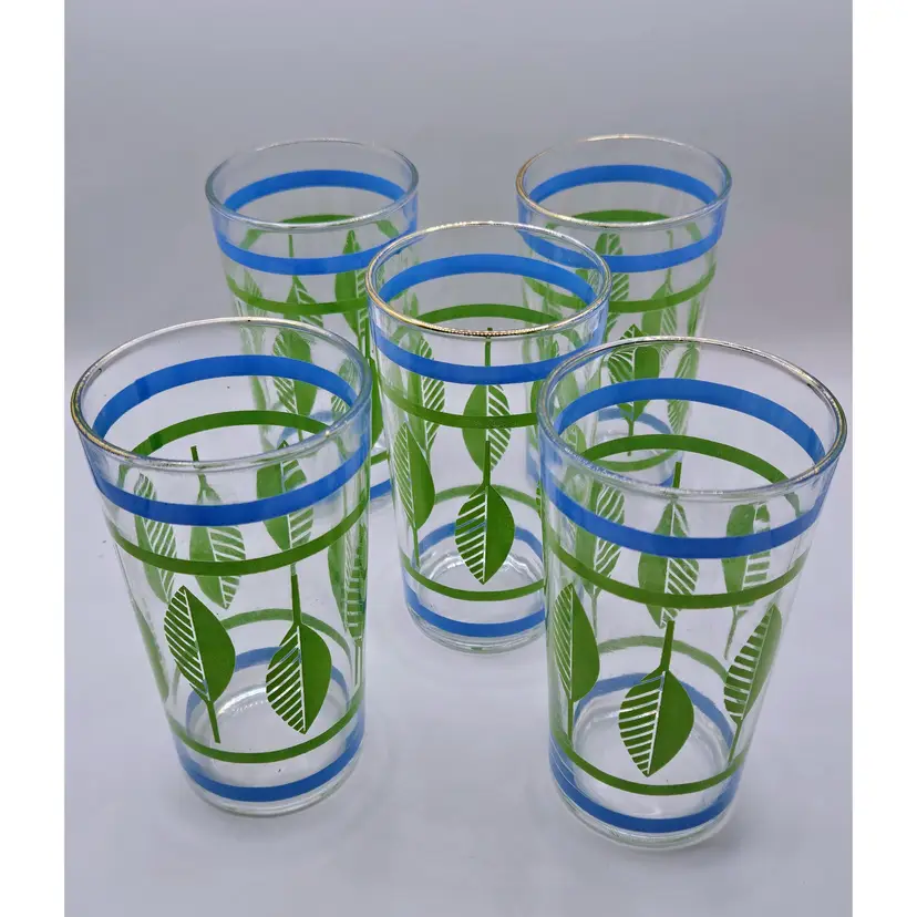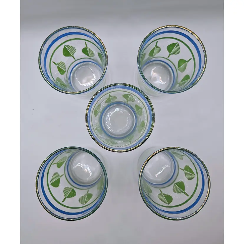 Beautiful set of midcentury drinking glasses, in good condition, most of gold on rims intact. No chips or cracks.