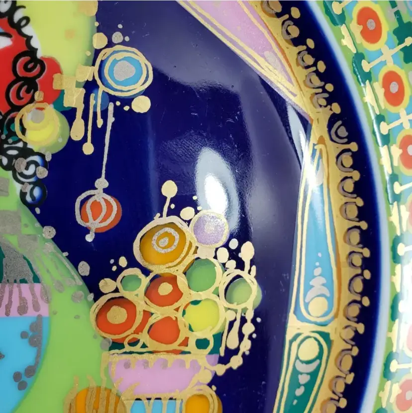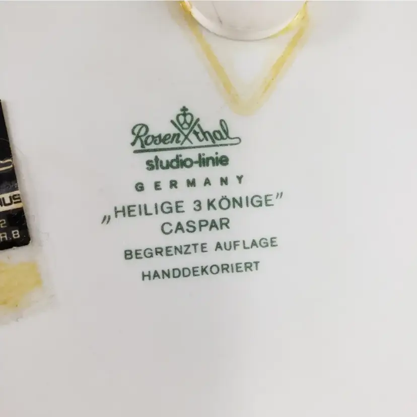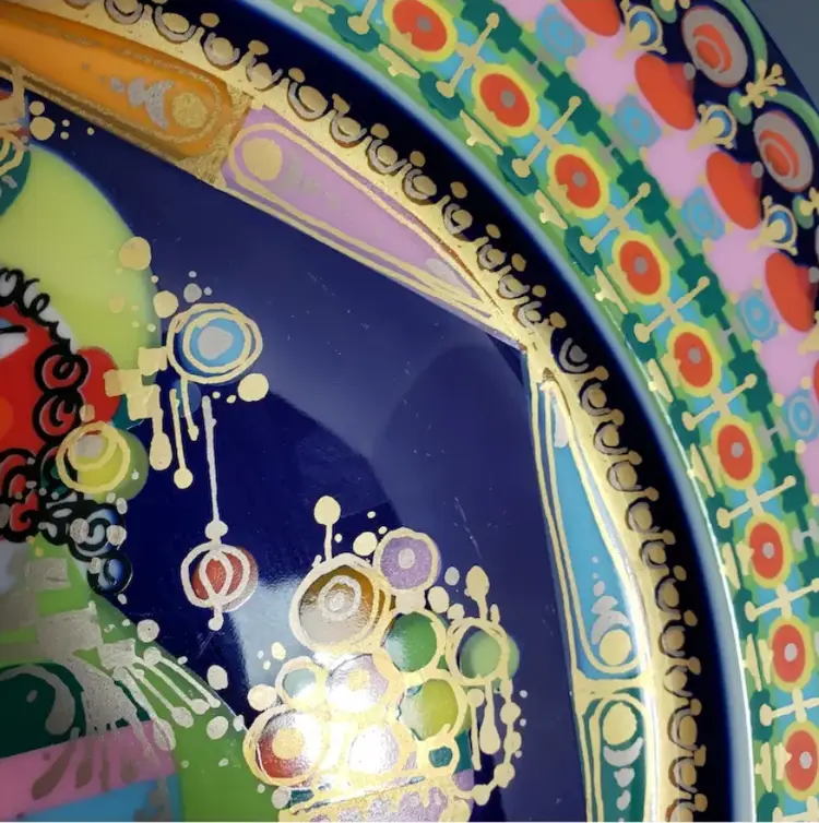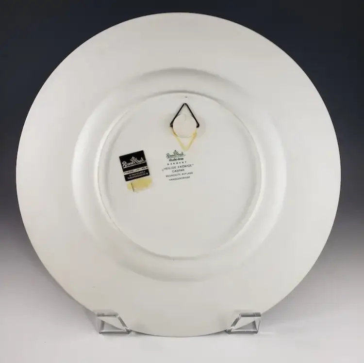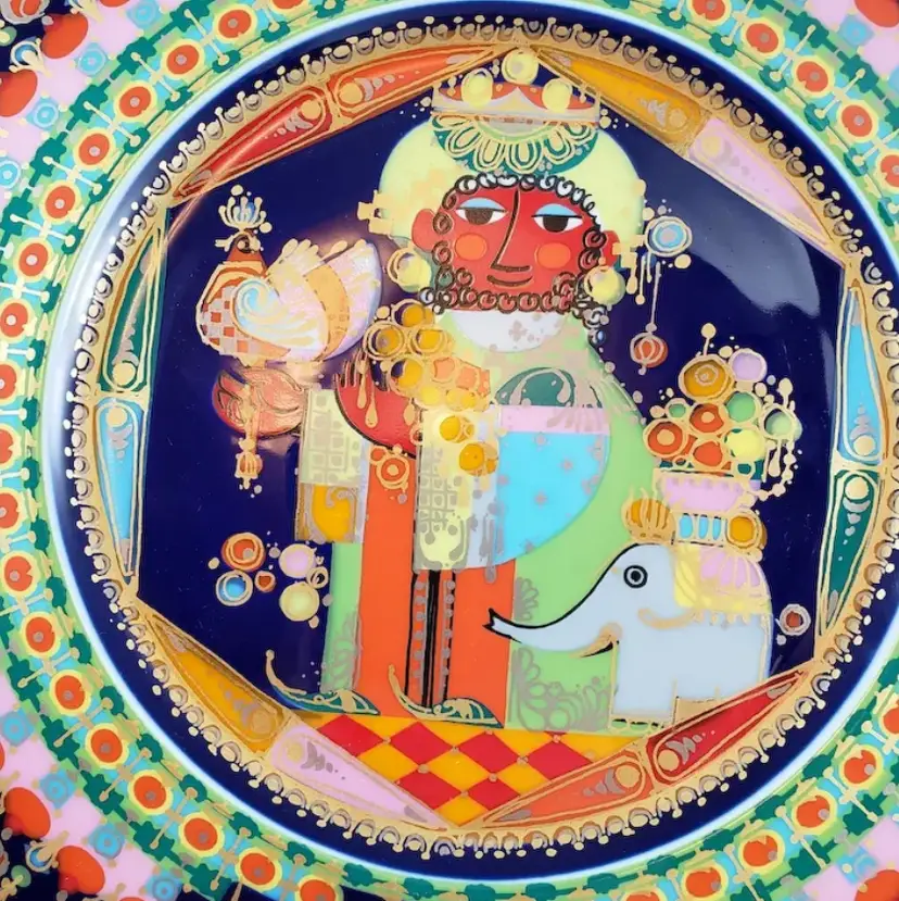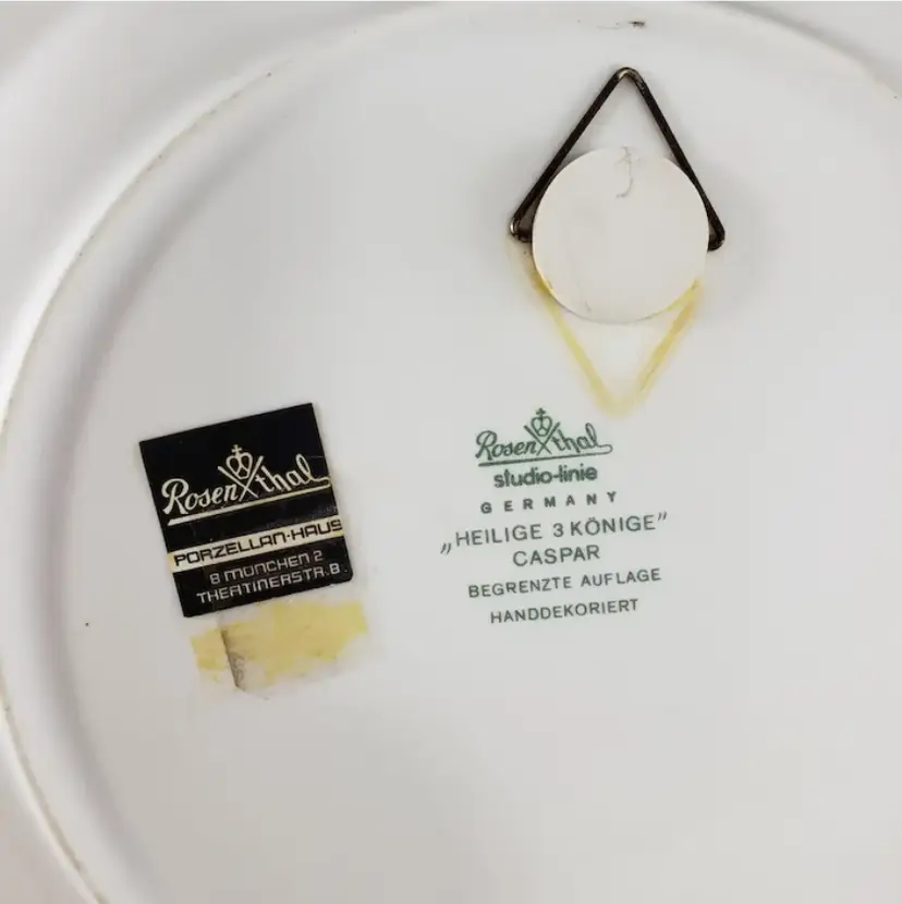 This is Caspar, hand-decorated and one of a series of Christmas plates by Rosenthal. Features Caspar (one of the wise men) traditionally presenting gold to baby Jesus. Lots of gold trim on this series which doesn’t always show well in the photos, it depends on how the light hits it. This plate is decorated with brilliant colors & gold on deep cobalt blue/navy background, it is signed and dated on the front. This plate. It is fine porcelain and incredibly light.