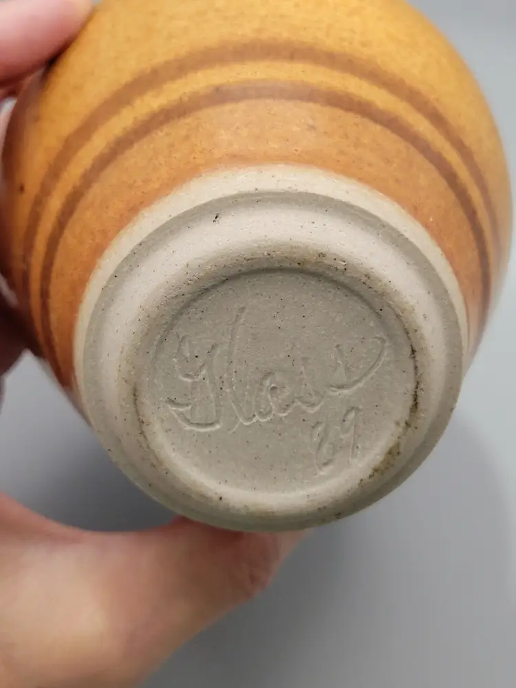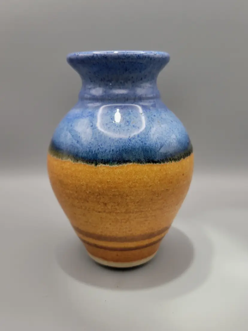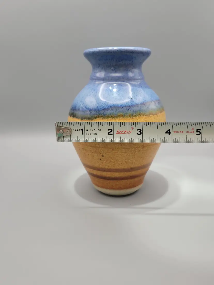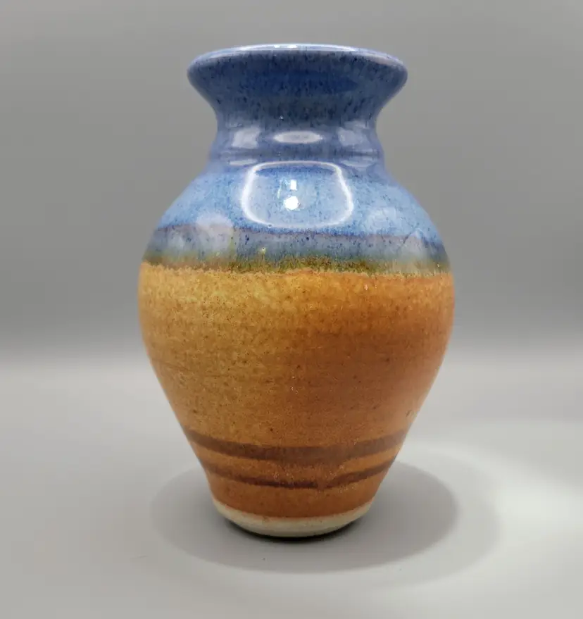 Hand thrown pottery vase by artist Walt Glass (1943-2016) from McQueeney, TX. Great condition, no damage, blue, beige, brown glaze and signed by the artist. Approx 6 inches tall, 3.5 inches at the widest and 1.5 inch opening. Thank you for looking and have a great day!