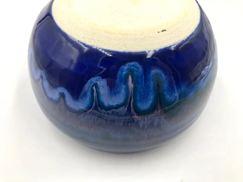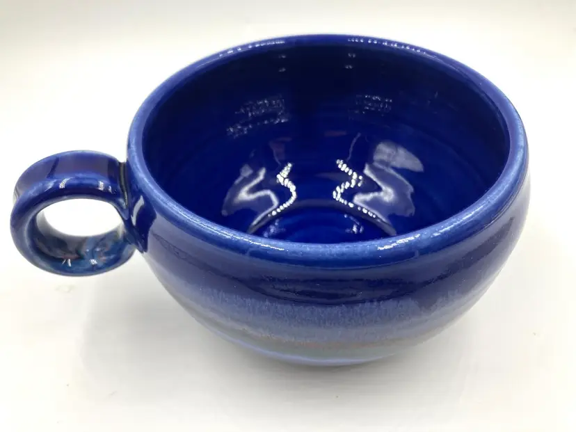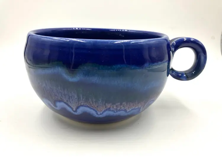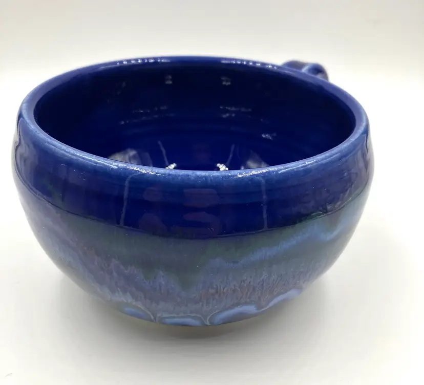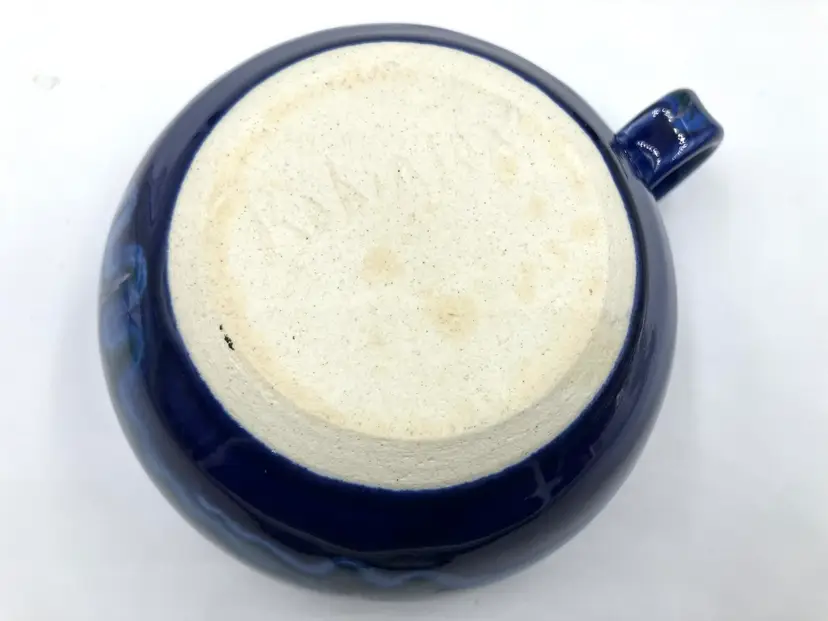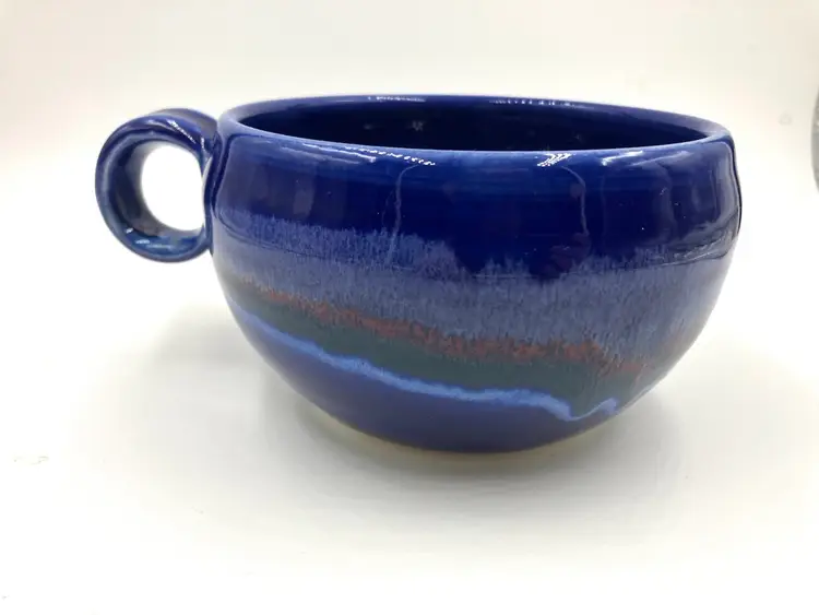 Made by New Hampshire potters Cathy and David Robinson, their unique glaze pattern is stunning. Measures 5.25” diameter and 6.5” with handle.3” tall. Holds 18 oz comfortably below rim. Gorgeous. In excellent condition.