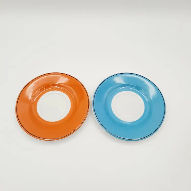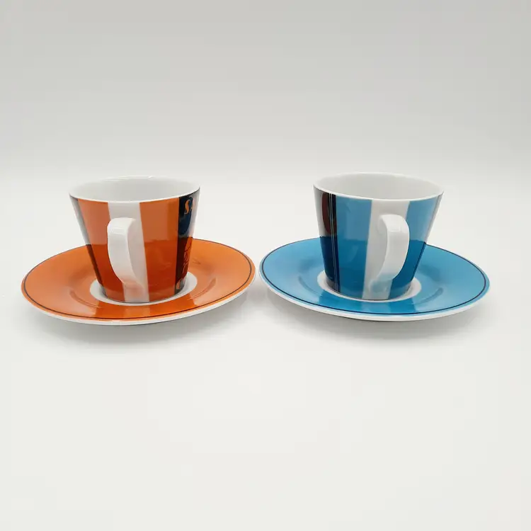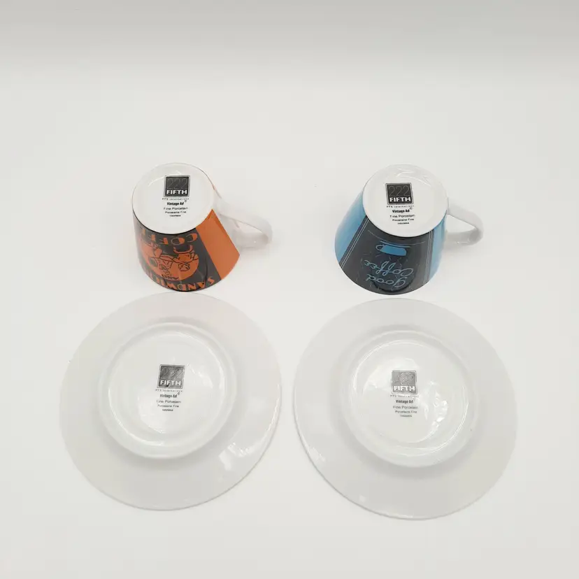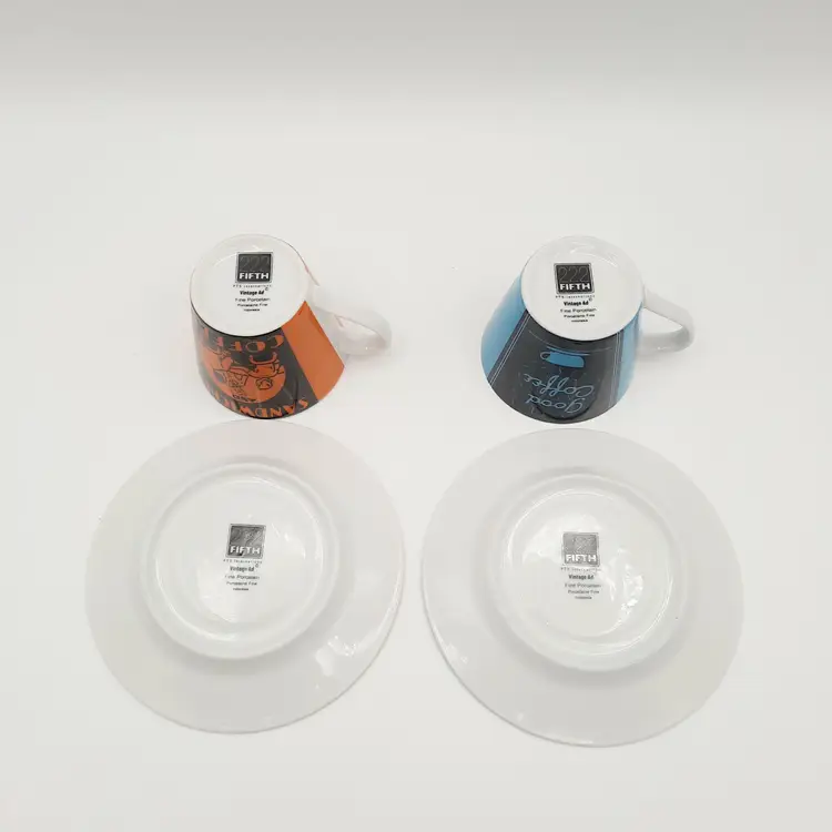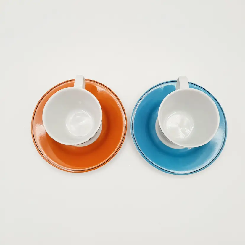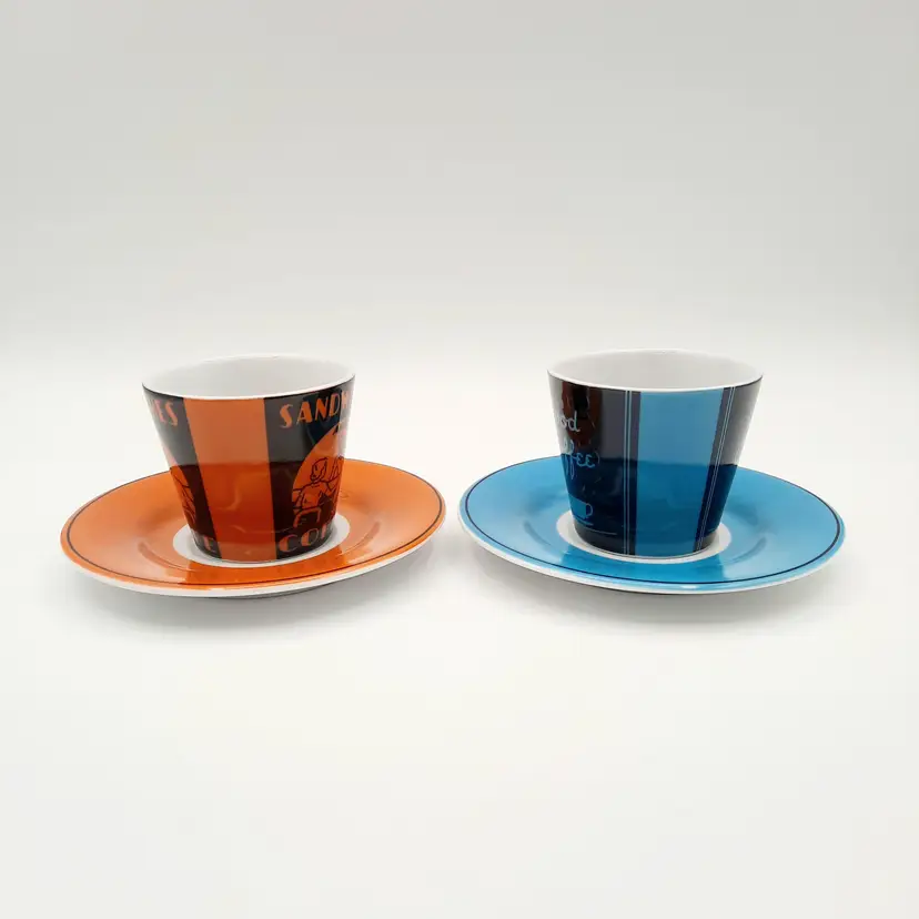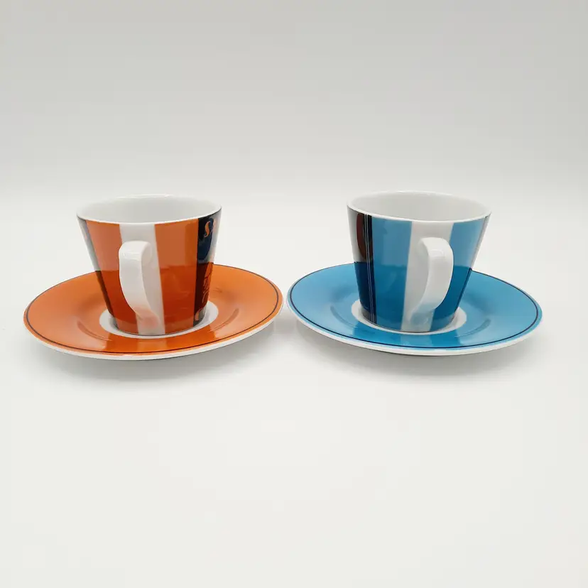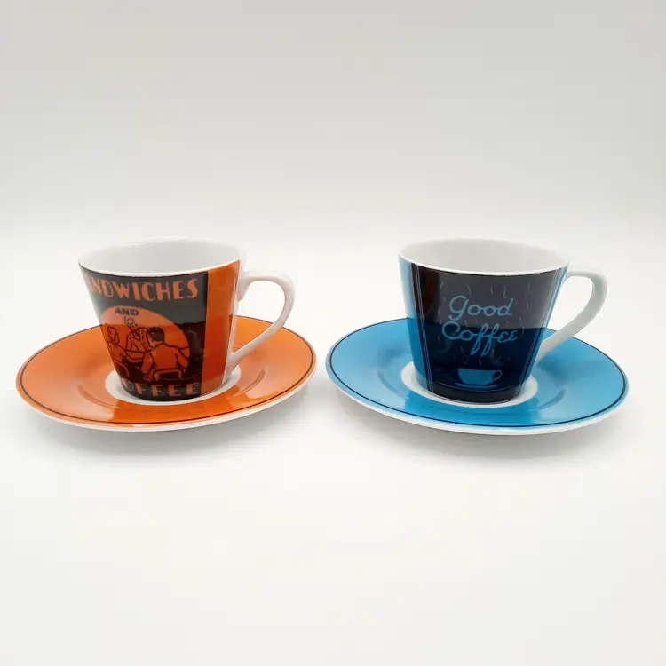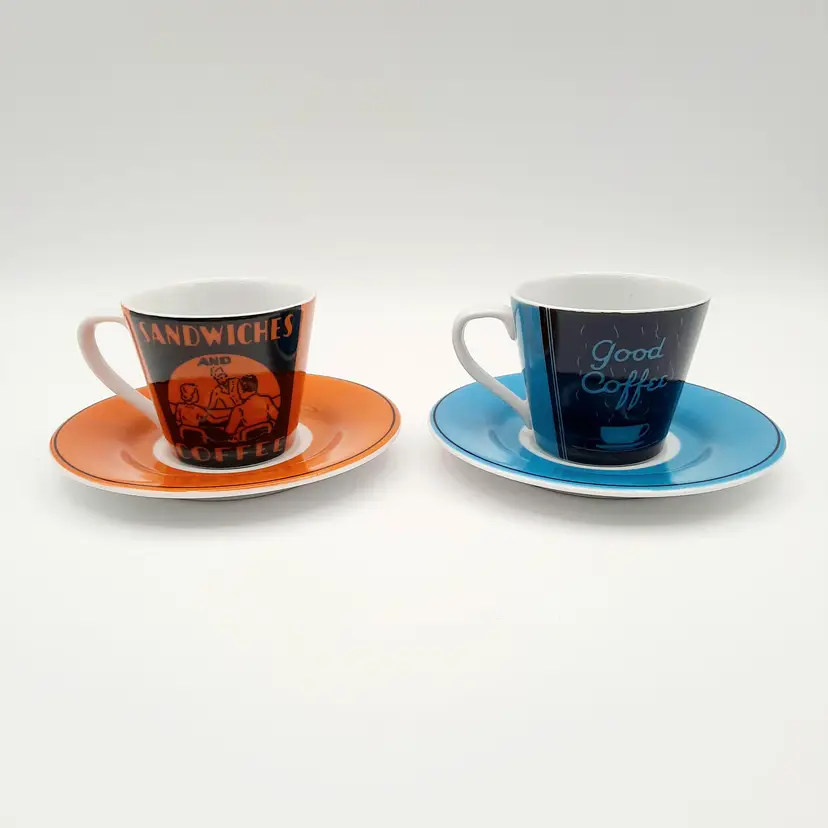 Fun vintage themed espresso cups are in great condition with a bit of wear on saucers.