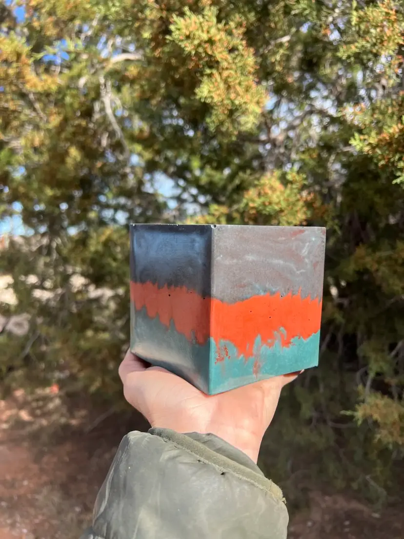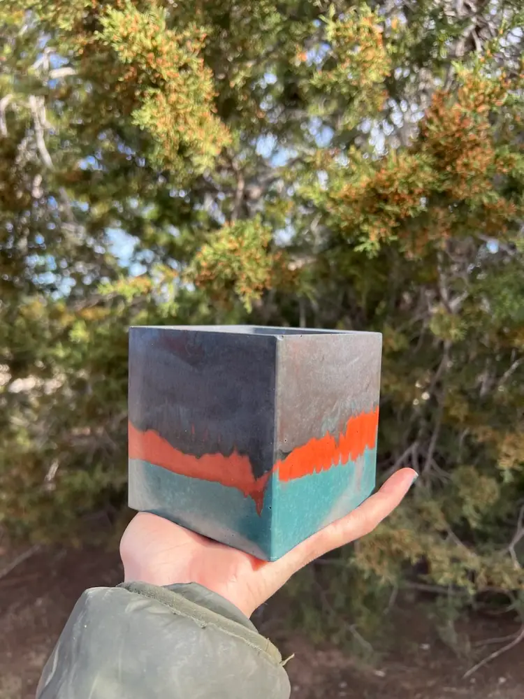 Hand poured concrete square planter using various dye for color. Drainage added upon request.