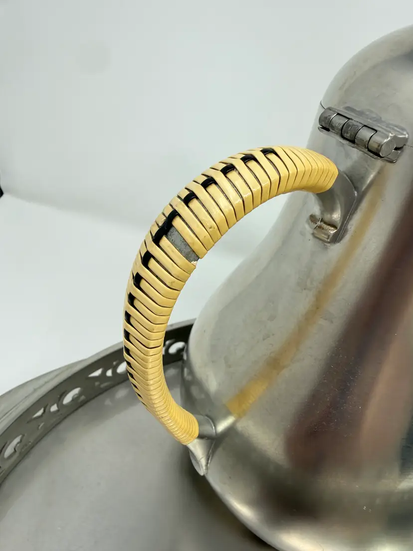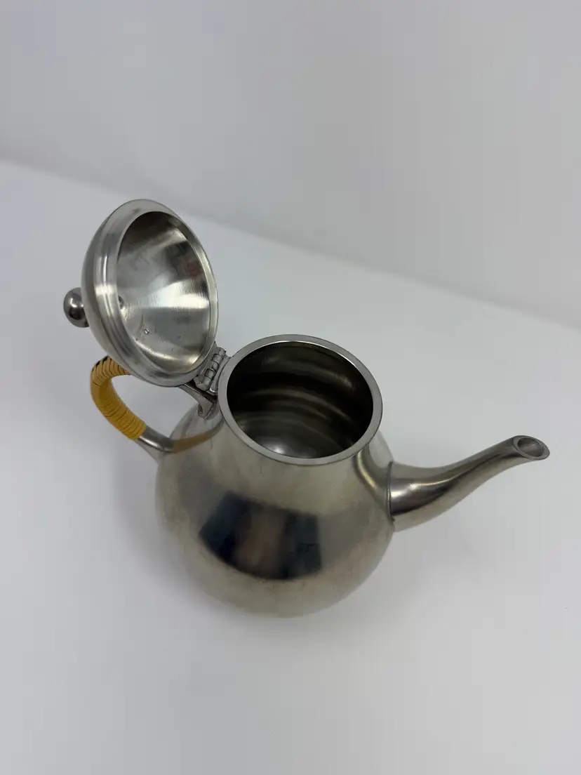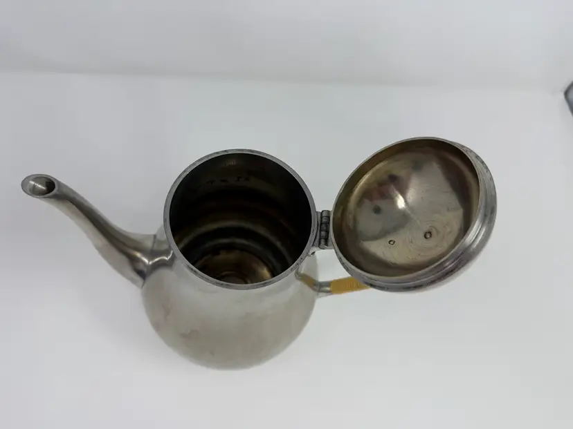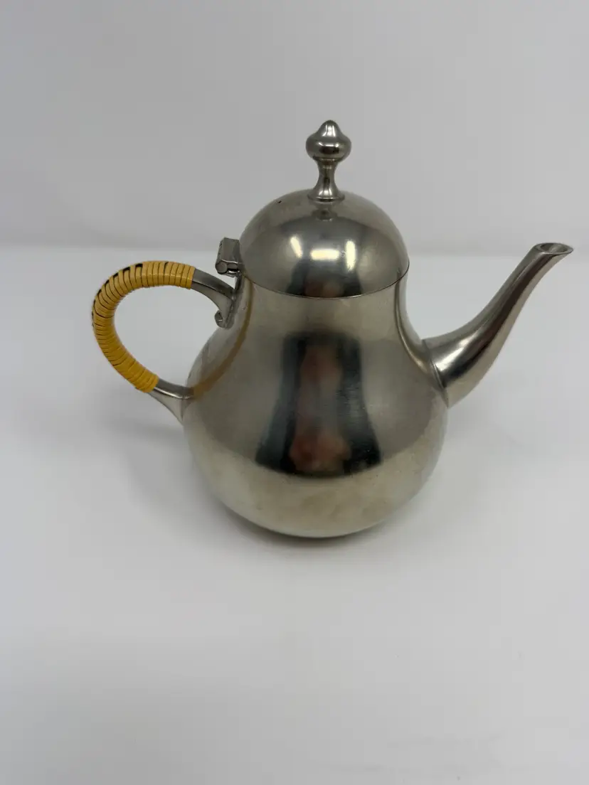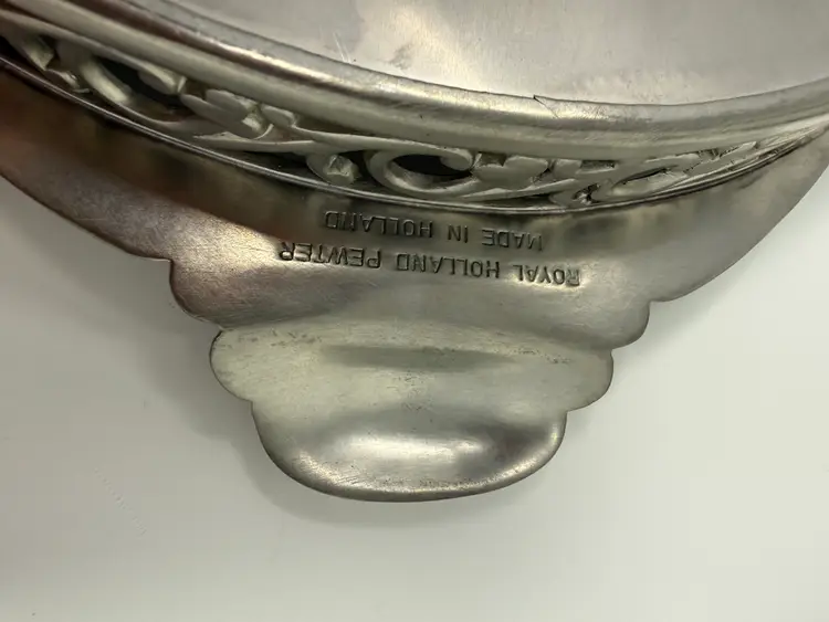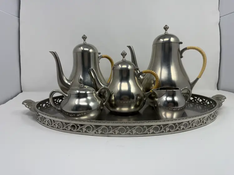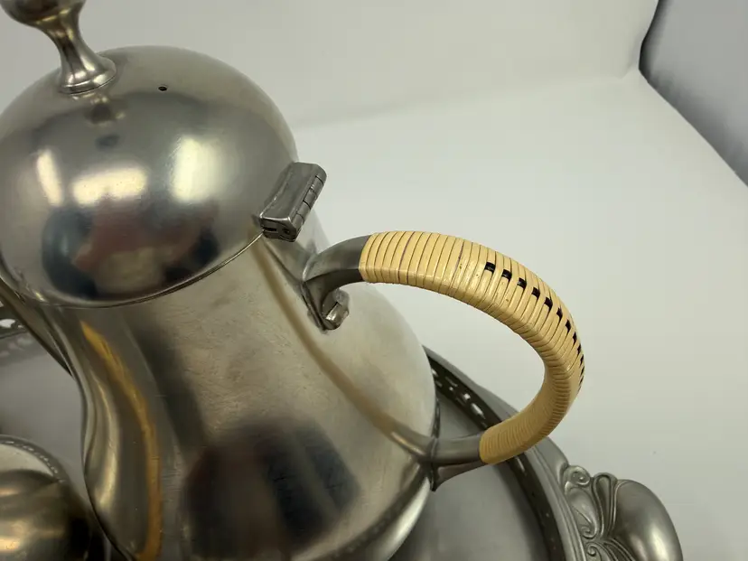 Cream and sugar are Metawa Holland Real Pewter 94%. The tray and other 3 piece are Royal Holland Pewter with wrapped rattan handles. All are made in Holland. All pieces are in excellent condition. The only call out is a small piece of missing rattan on one handle, and a small ding in the rattan in another spot. Tray 22" x 13" Pots 9.5" tall x 9.25" w x 5.5" around; 8.5" x 8" x 5"; 6.25" x 7.5" x 4.75" Sugar 4.25" tall, 5.5" handle to handle, 4" round Creamer 3" tall, 3.75" handle to spout, 3" round