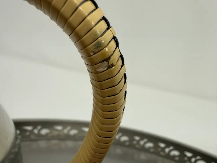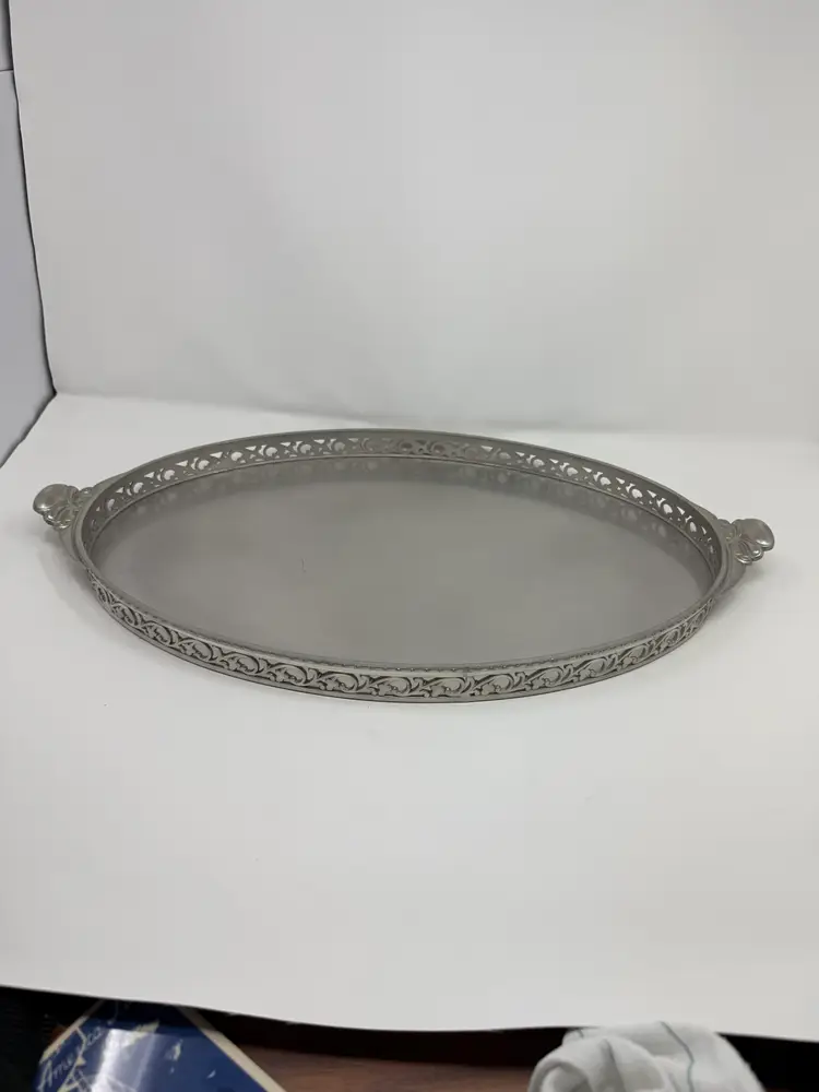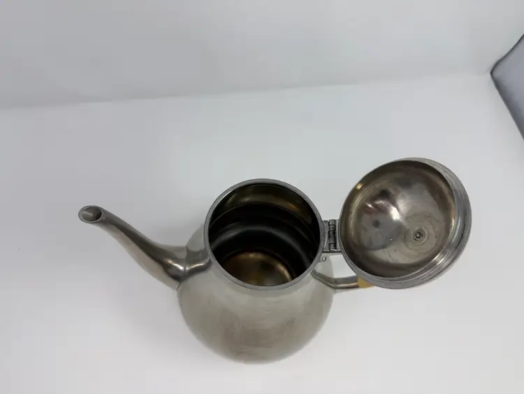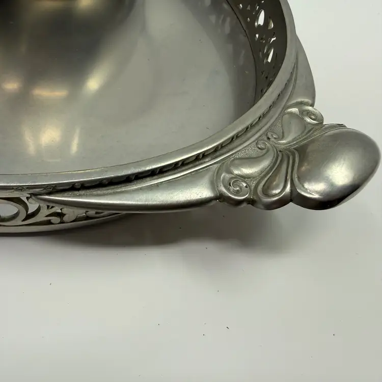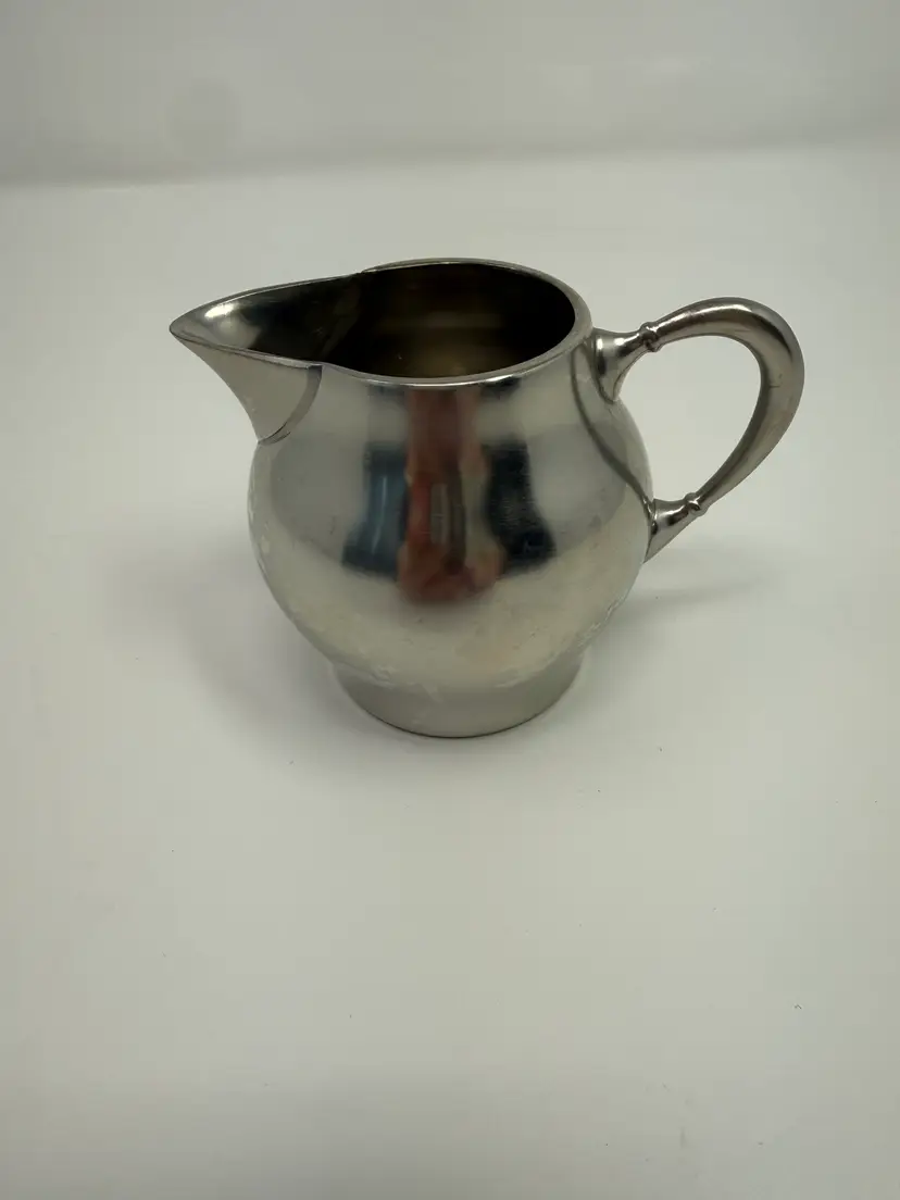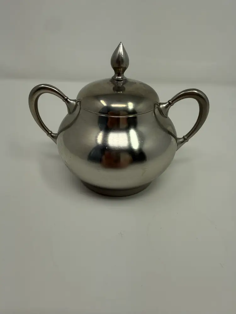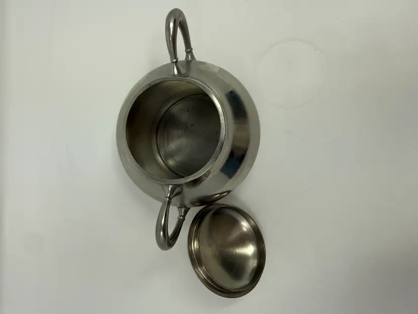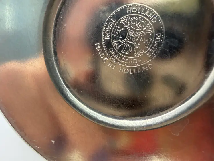 Cream and sugar are Metawa Holland Real Pewter 94%. The tray and other 3 piece are Royal Holland Pewter with wrapped rattan handles. All are made in Holland. All pieces are in excellent condition. The only call out is a small piece of missing rattan on one handle, and a small ding in the rattan in another spot. Tray 22" x 13" Pots 9.5" tall x 9.25" w x 5.5" around; 8.5" x 8" x 5"; 6.25" x 7.5" x 4.75" Sugar 4.25" tall, 5.5" handle to handle, 4" round Creamer 3" tall, 3.75" handle to spout, 3" round