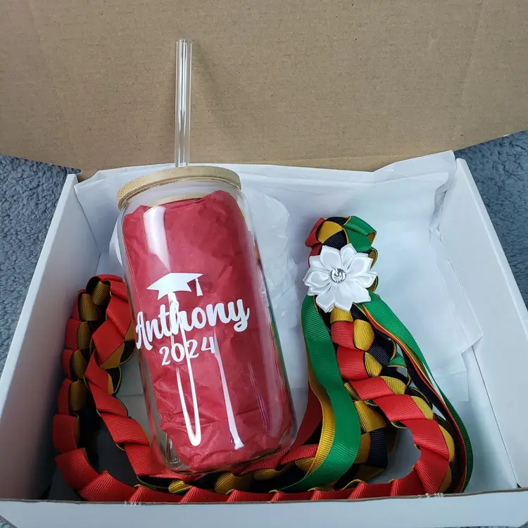 Graduation 4-Ribbon Lei and Personalize Bamboo Glass Tumbler Gift Box Set. Grad label, box, tissue paper, and ribbon tie in a bow. Message me with Name. Photo will be shared for your approval.