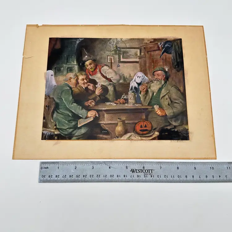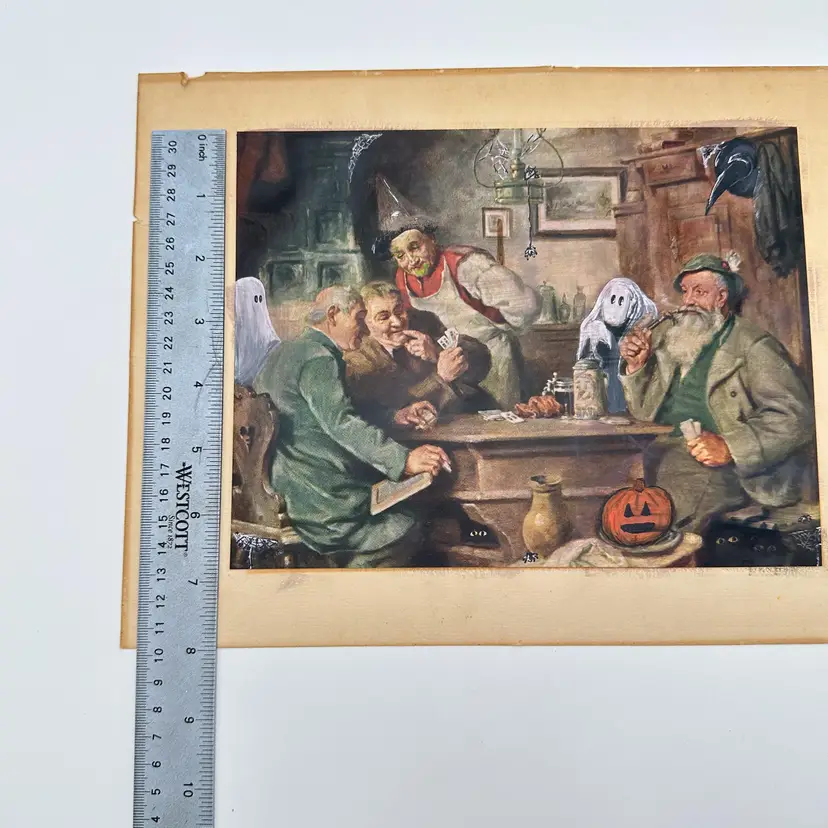 Vintage print altered for Halloween Acrylic paints Added ghosts, spiders, cats, pumpkin, witch hats, etc. Approximately 9" x 7" No frame included See replay of Art Therapy Thursday Live 8/29/24 near the end to see me start this project.