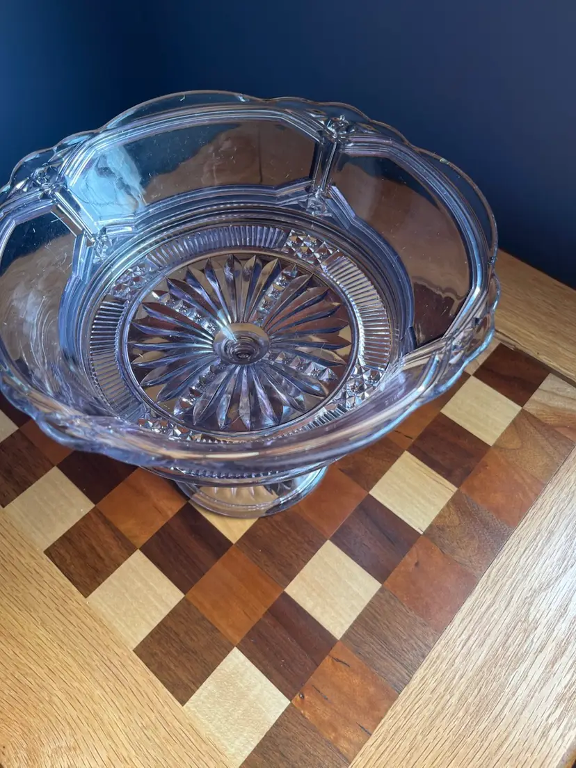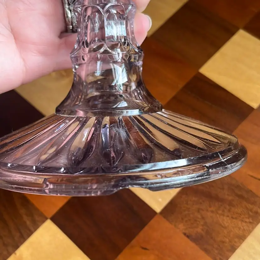 Purple/amethyst glass compote 8 inches tall 9 inch diameter small chip at bottom of base