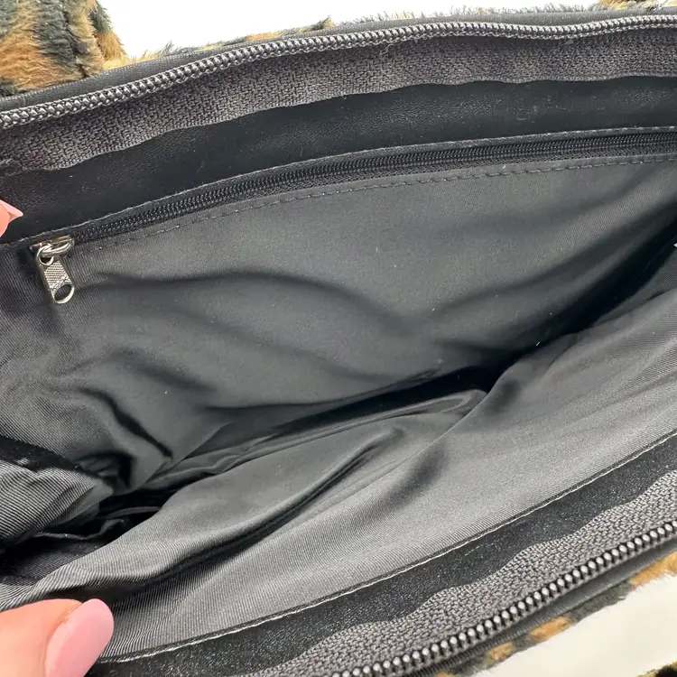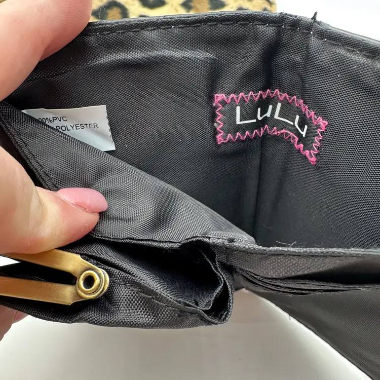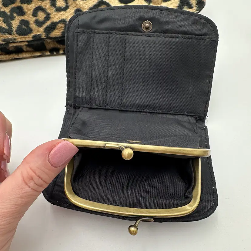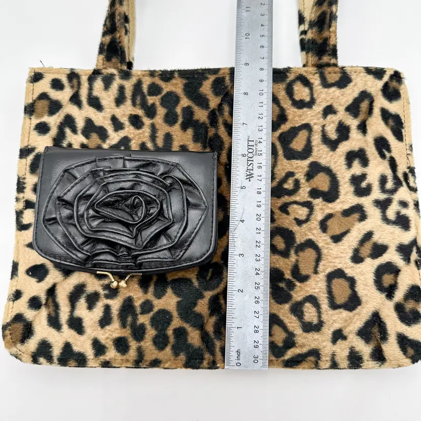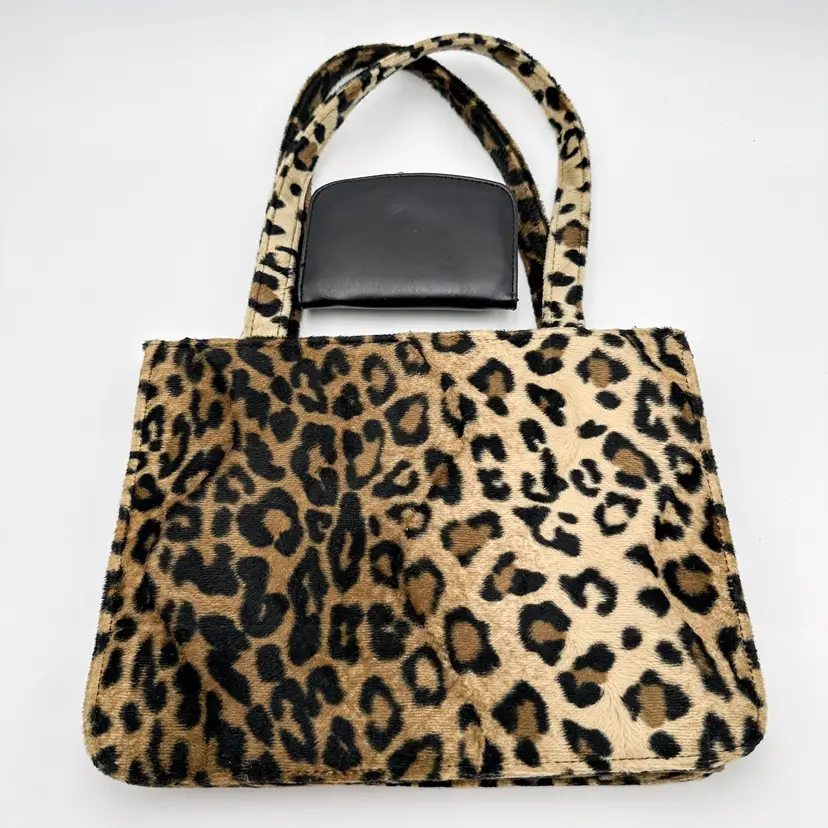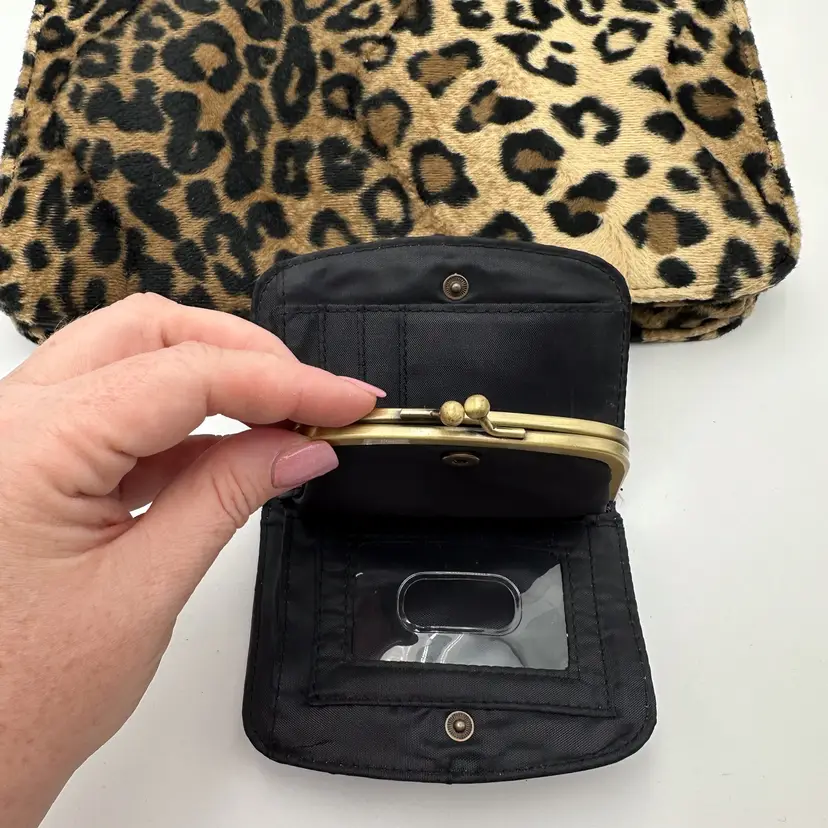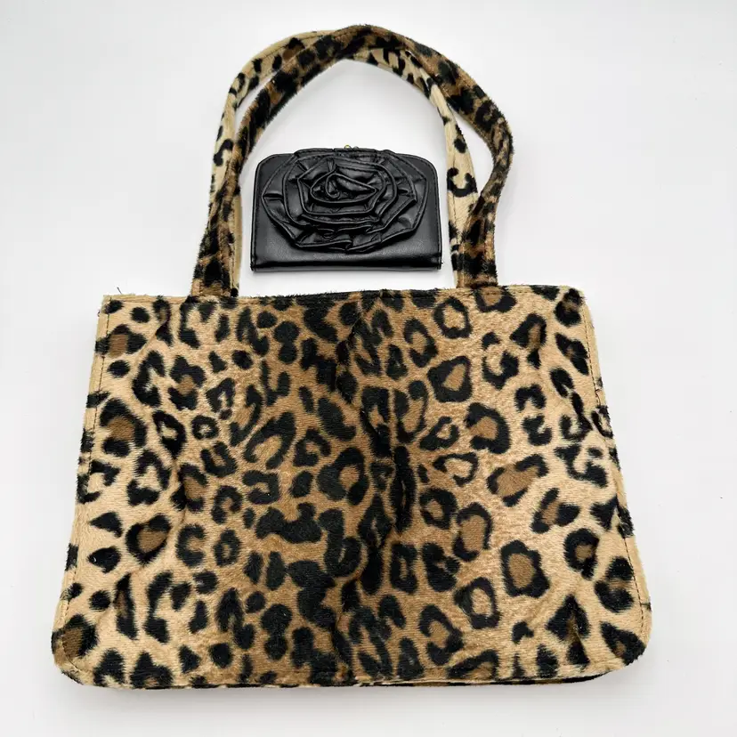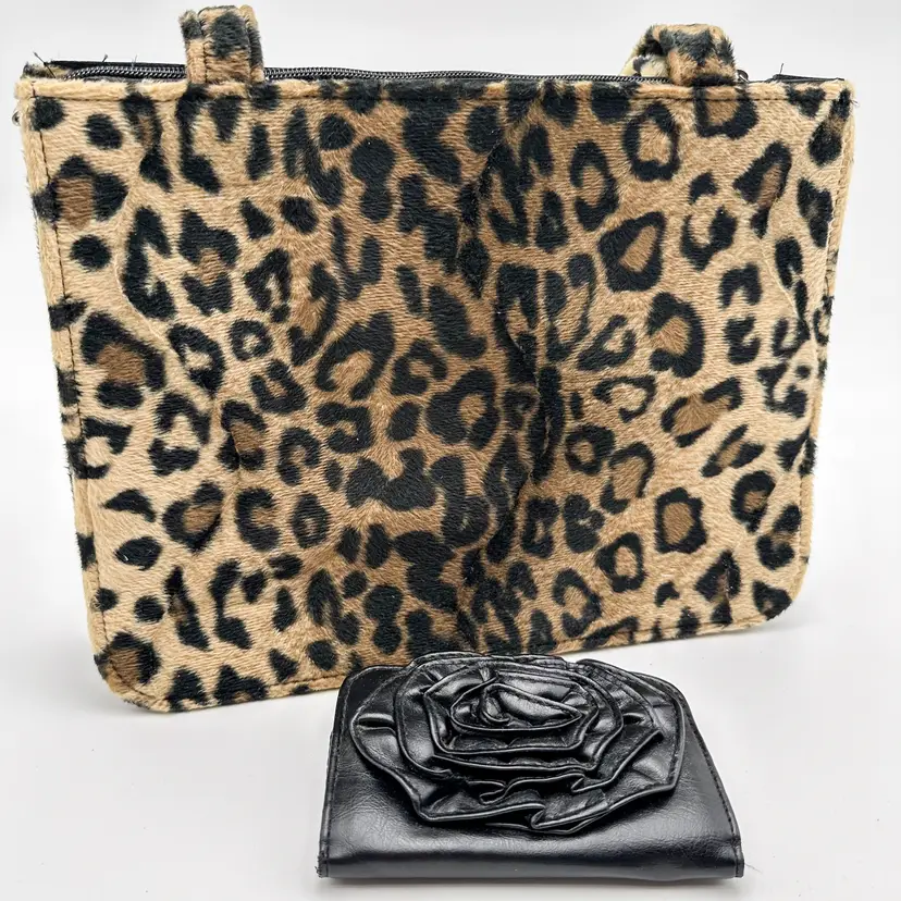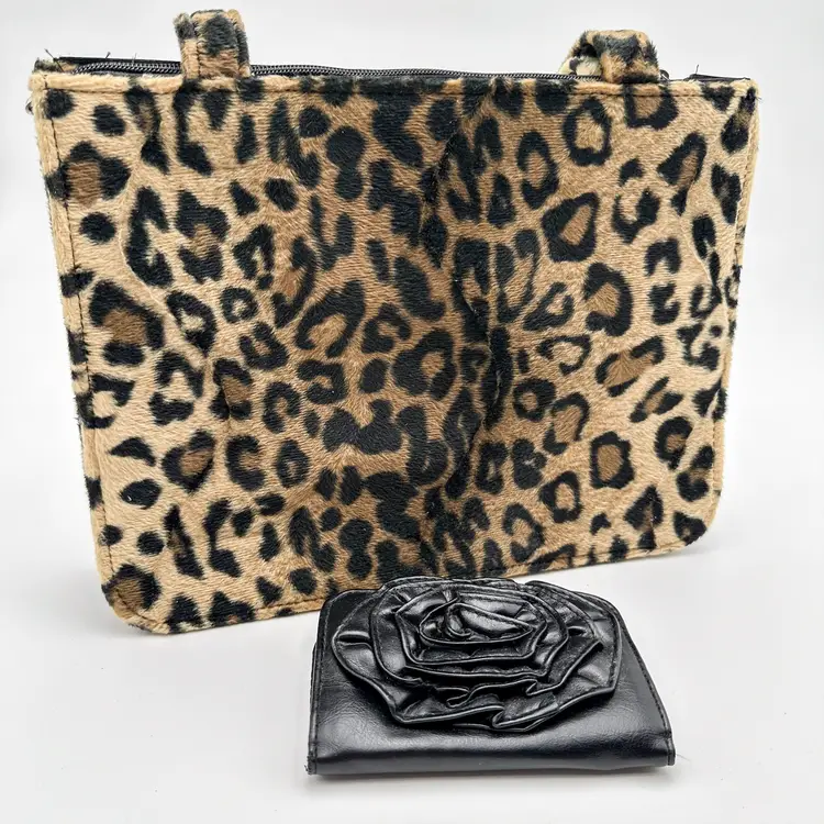 Purse is unbranded, plush, furry exterior fabric in leopard print, 12" x 9" Lulu black faux leather wallet, gold tone hardware, has writing on coin compartment interior, 5" x 3" Pre-owned, very good condition, minimal signs of wear, see all photos