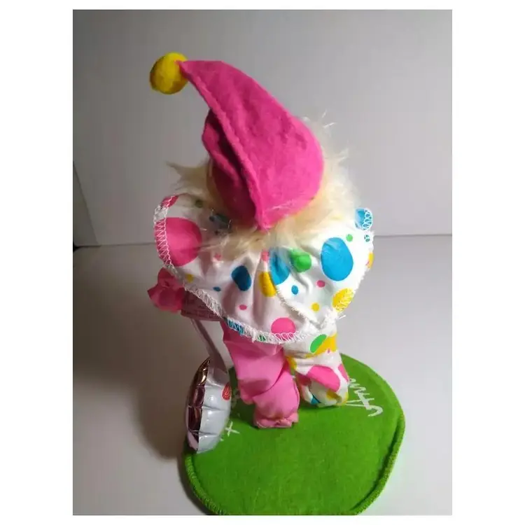 Introducing the Annalee 8" Pink Circus Clown doll, manufactured in the United States in 1990. This vintage doll features a blonde hair color, blue eye color, and a girl doll gender. The doll is made of cloth material and is a part of the Annalee Mobilitie Dolls product line. This single unit doll comes with a balloon and is perfect for any occasion. The doll's features include a vintage item and it is an original, licensed reproduction. The Annalee Circus Clown doll is a must-have for collectors and doll enthusiasts alike.