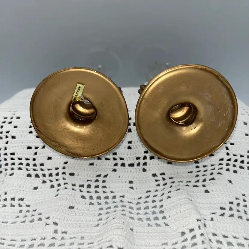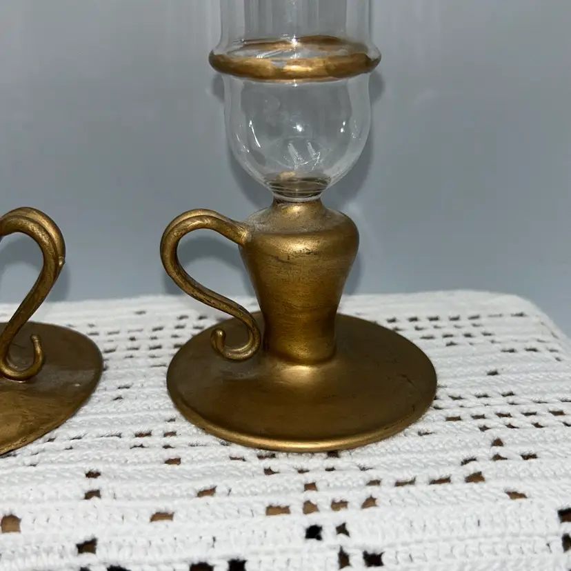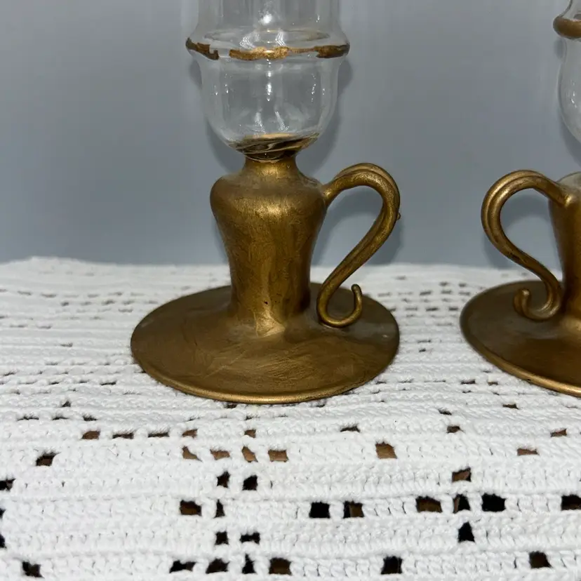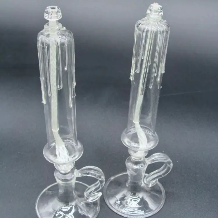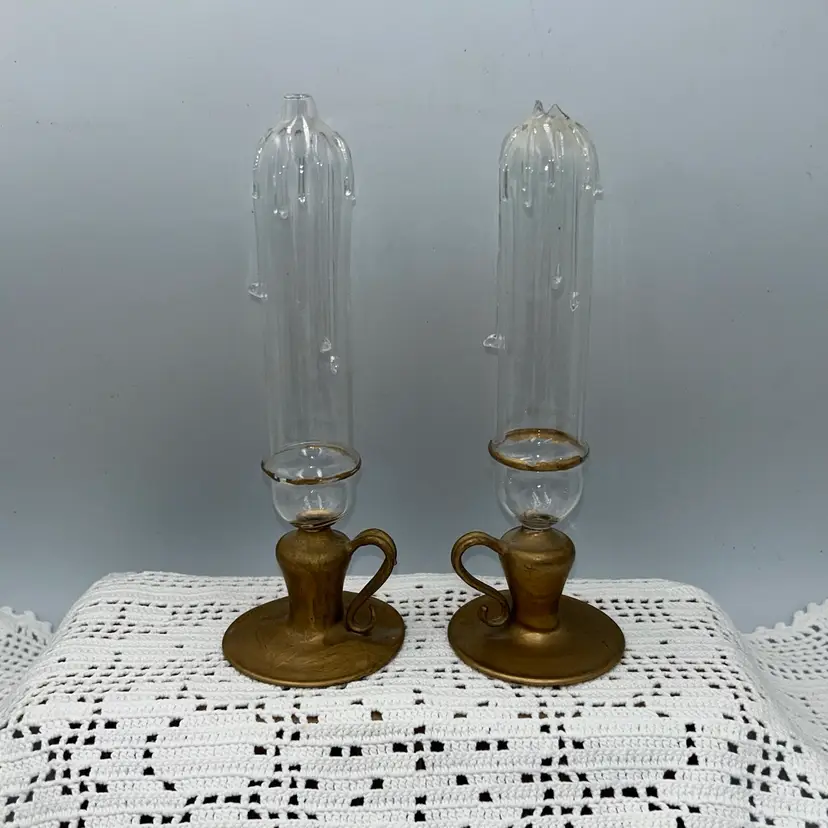 These are all one piece. They feature a glass chimney to protect the flame from drafts.The glass has decorative drips, resembling melted wax. The base is made also made of glass, these have been painted. They are designed in a vintage or Victorian style. 8” tall, base is 2.6 in diameter, oil lamp is 6” tall, and approximately 1” in diameter. Very tip of one is chipped. Last photo shows a set in original condition, for reference.
