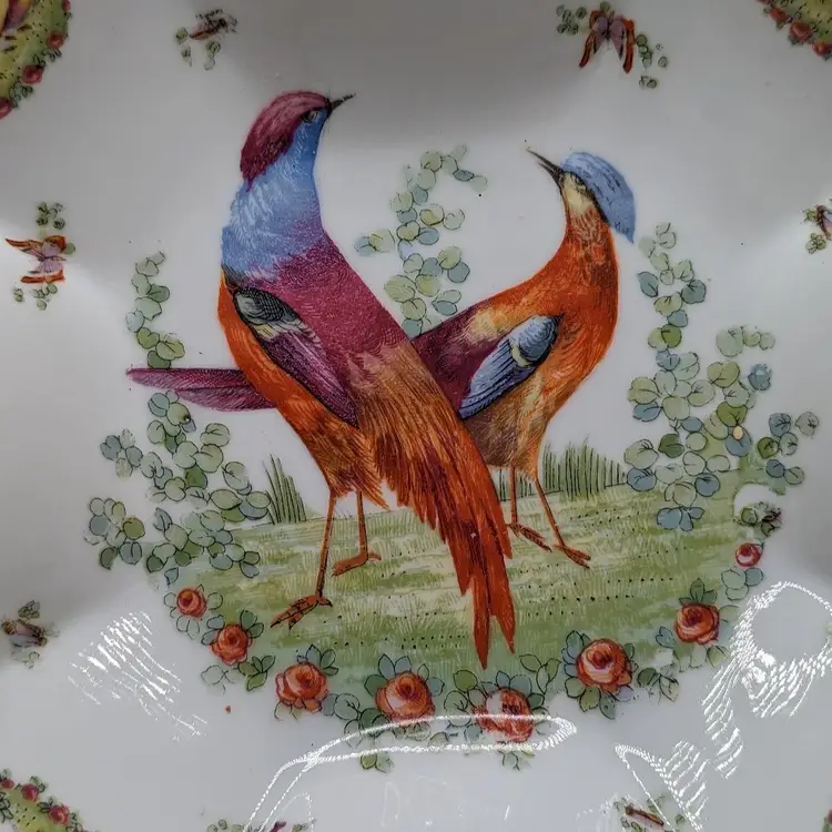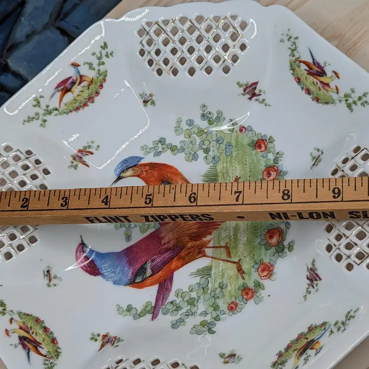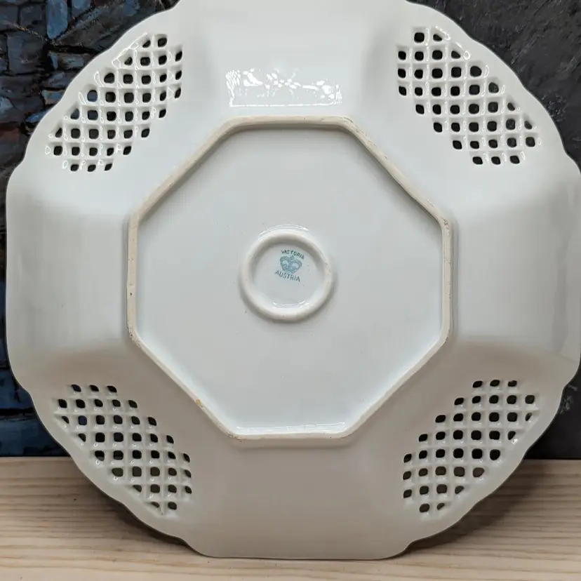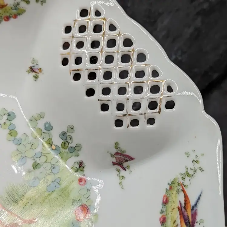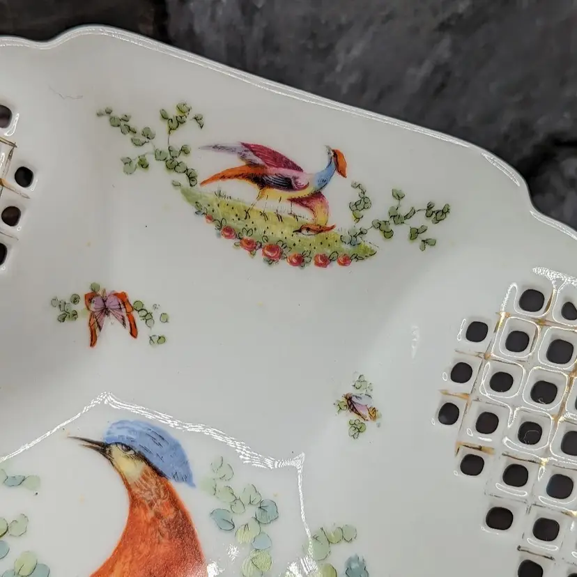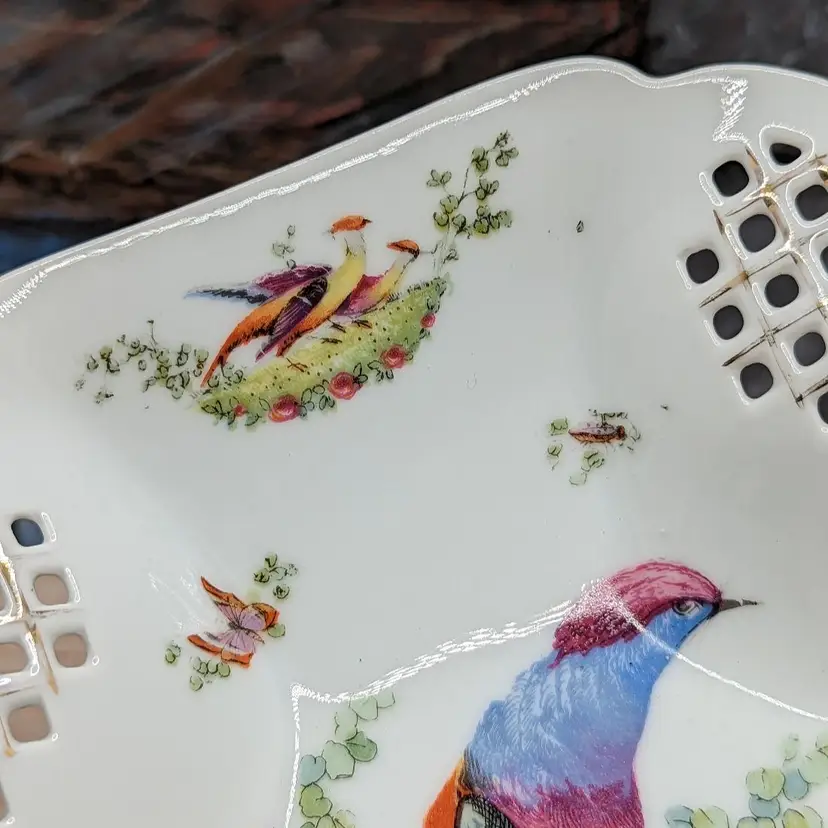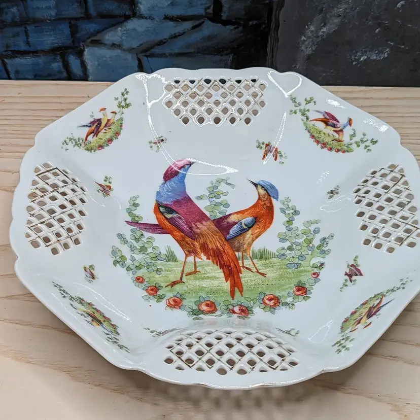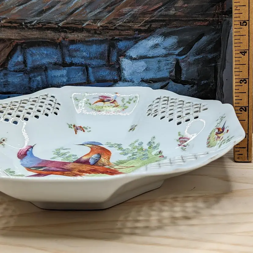 Victorian Pheasants Birds Antique Victoria Austria Crown Mark Pierced Serving Bowl Birds on Grass Gold Gilt 1904-1918 Victorian Pheasants Birds Looks to be hand painted . It measures 10in wide and 1 3/4in tall. Very Very good + condition no chips or cracks ora little gold paint loss but beautiful for its age. please check the photos for details. Comes from a smoke free home. We do have cats.
