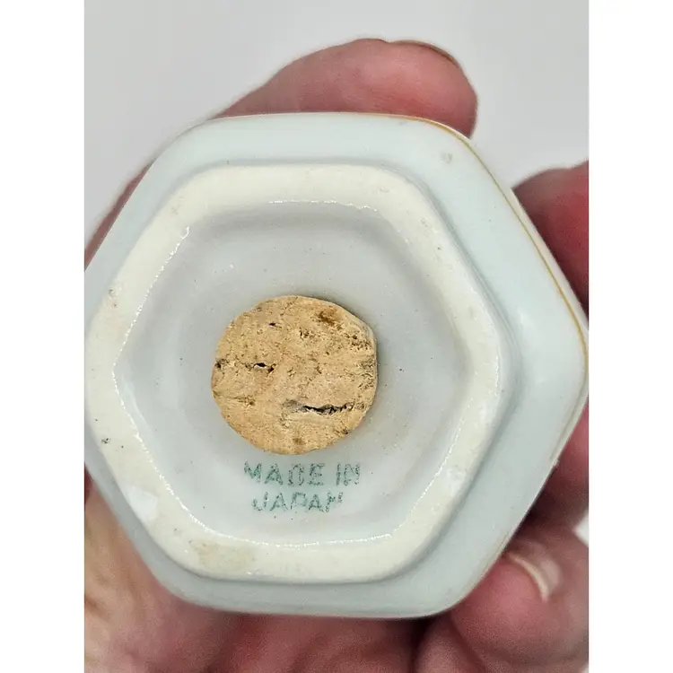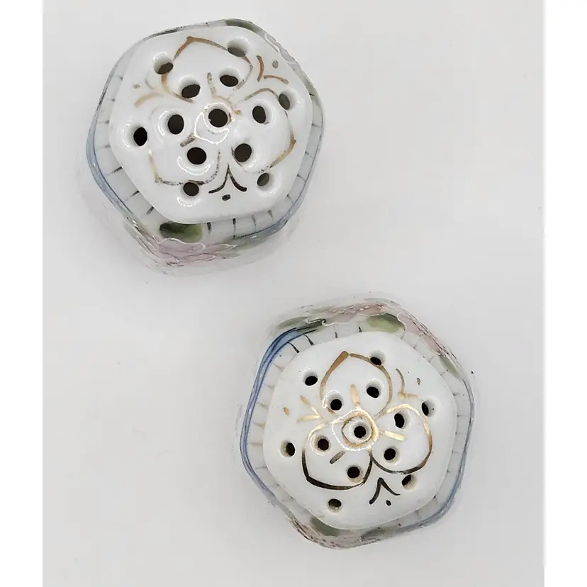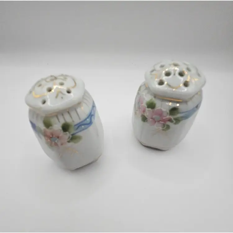 Very attractive salt and pepper shakers, approximately 2.25" tall. Very good condition for age, no cracks or chips, paint and gold trim looks good.