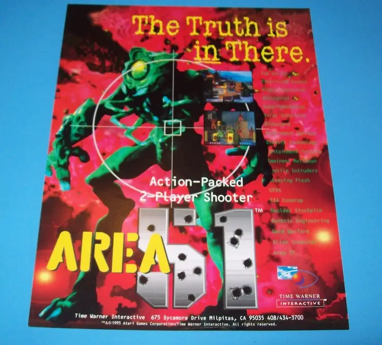 Arcade: Flyer Theme: Aliens Modified Item: No Country/Region of Manufacture: United States Original/Reproduction: Original Year: 1995 Game Title: Area 51 Brand: Atari