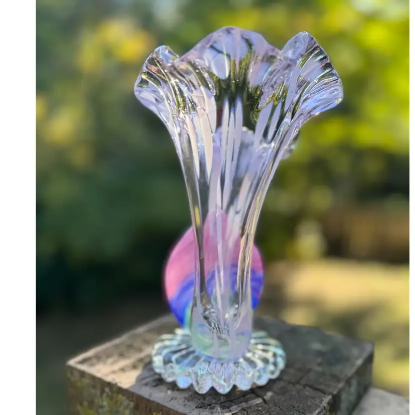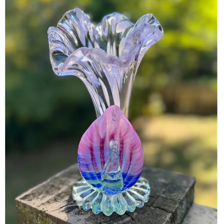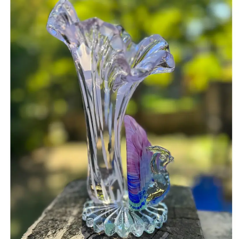 Beautiful art glass vase, with swirling pinks and white. With applied vibrant colored glass peacock. Excellent condition and measures about 7 1/2 inches tall.