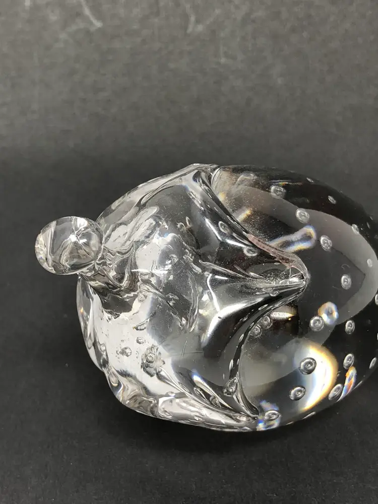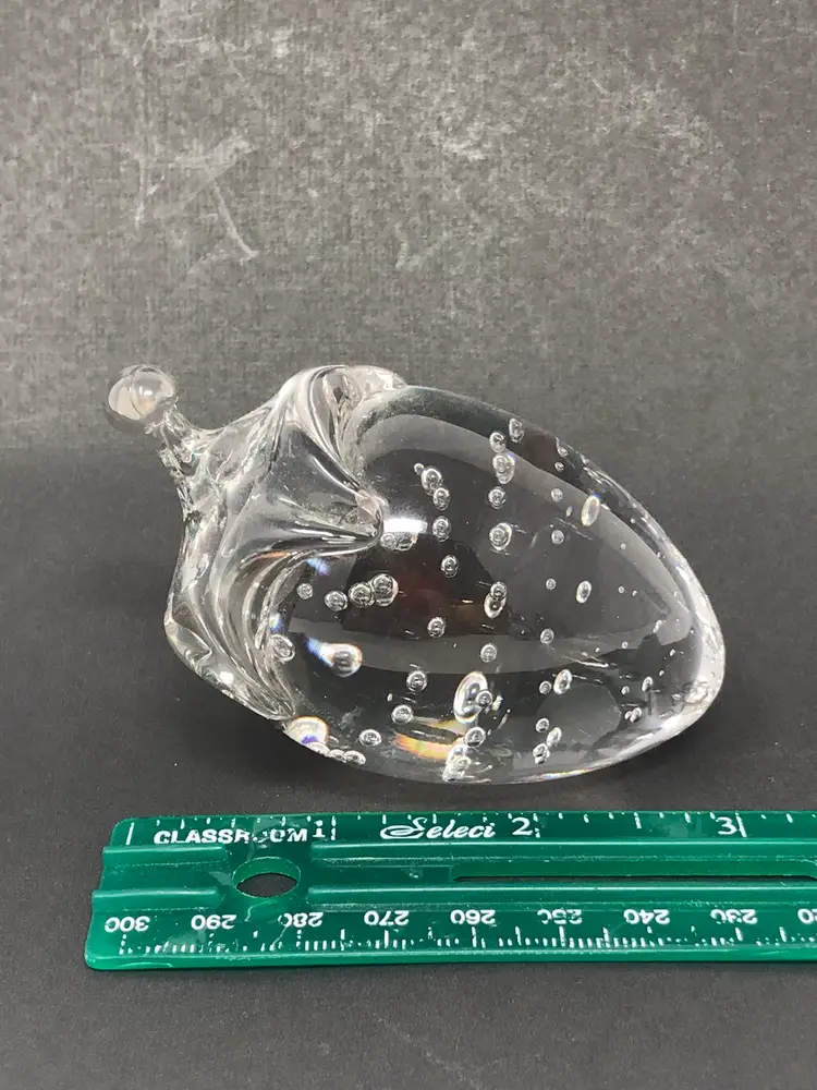 3 1/2" tall pear paperweight with controlled bubbles and applied stem and leaf. No labels or markings. No chips or cracks