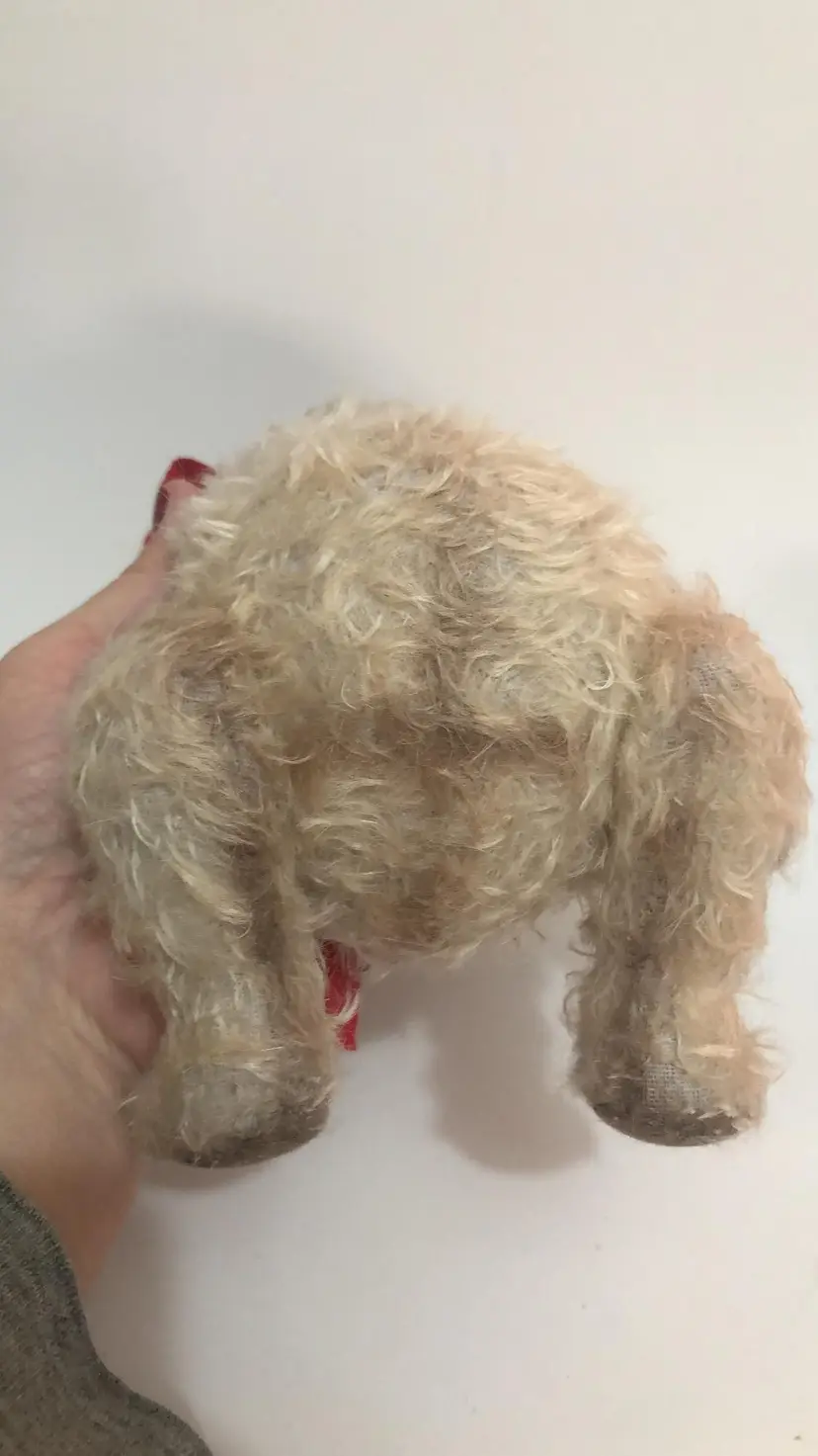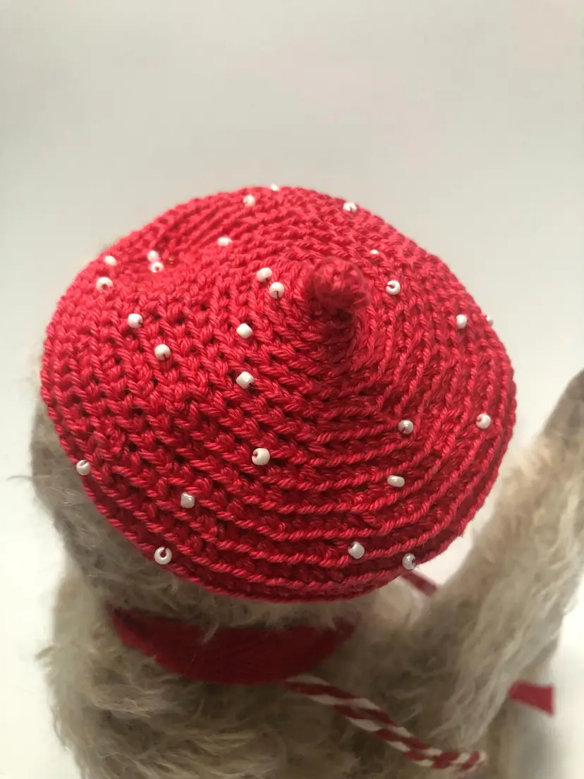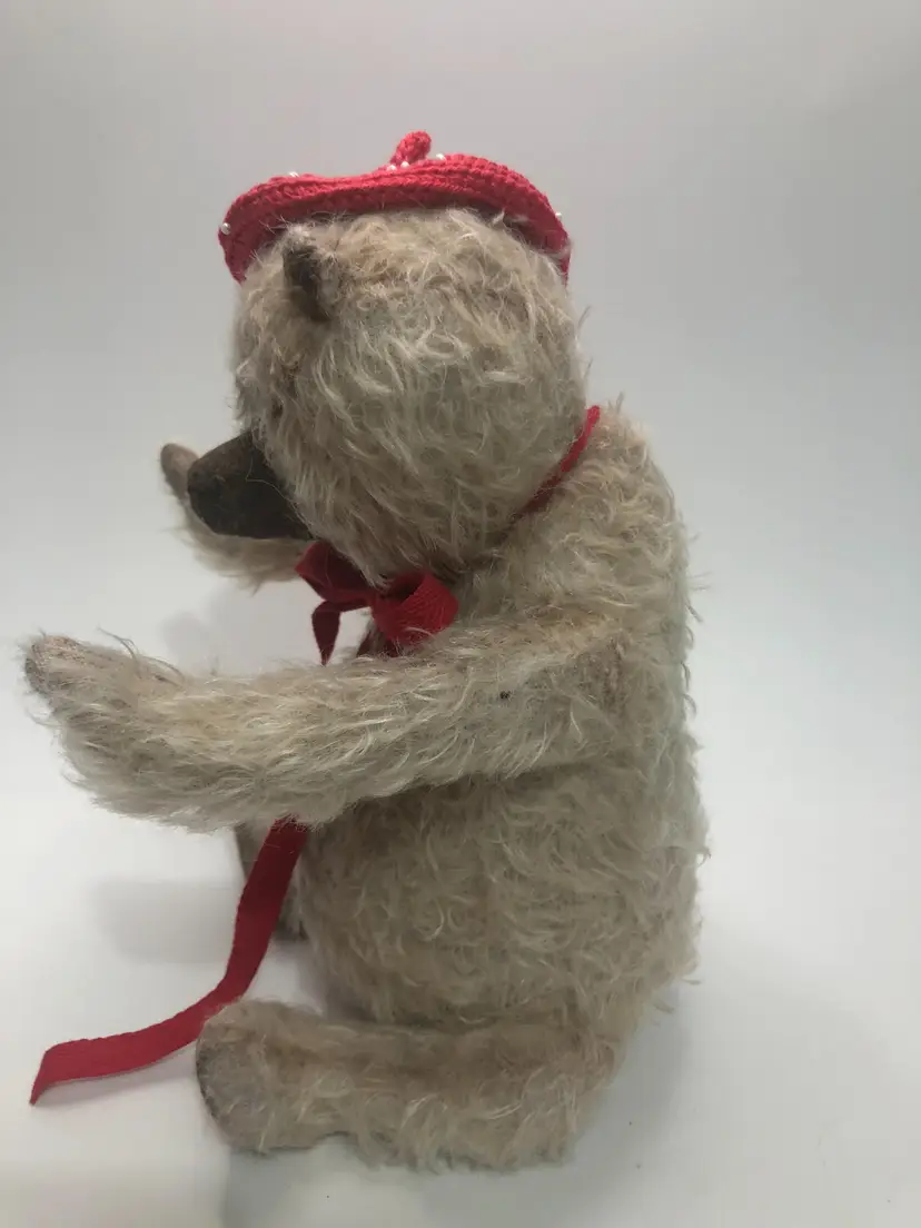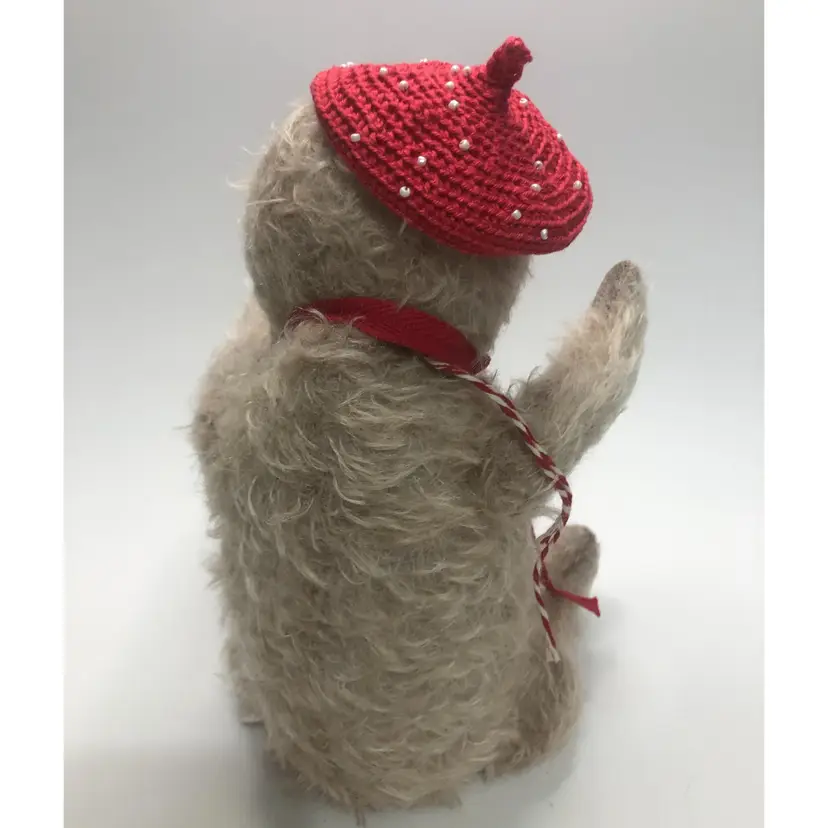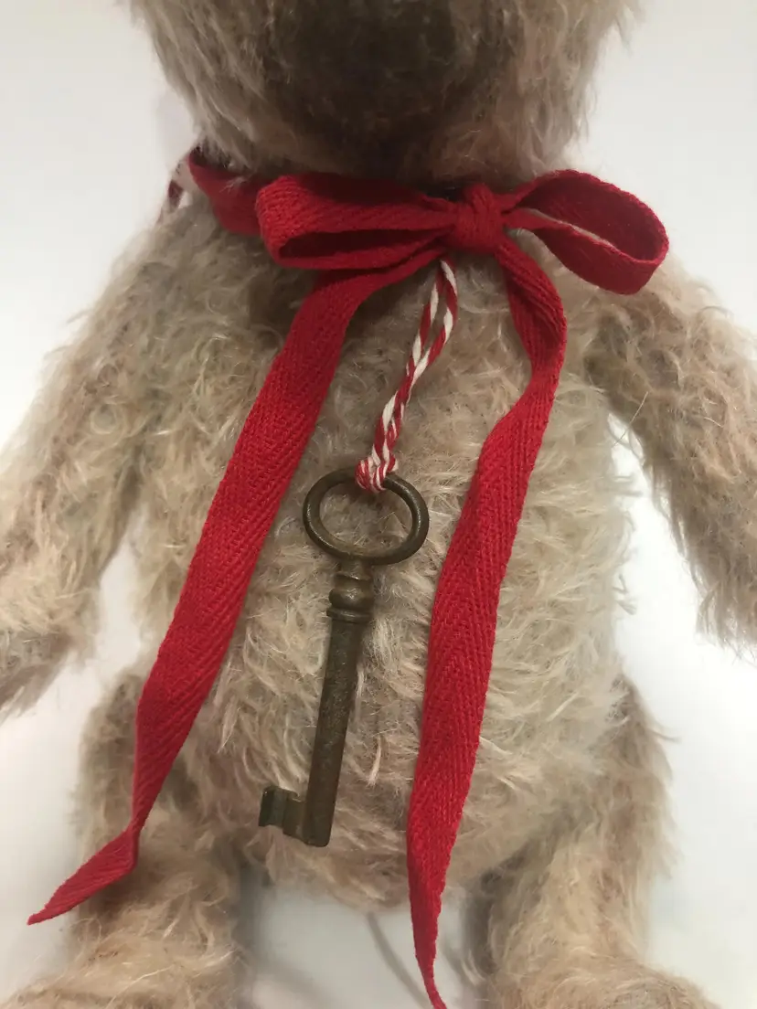Artisan handmade One of a Kind Teddy Bear. I cannot identify the maker but he is very well done. Weighted belly, black glass eyes. He also has brown stitching in his left ear and red beret decorated with white seed beads. Red cotton bow around his neck along with a vintage metal skeleton key. About 11" tall. Most likely made in Ukraine or Russia. Not intended or children.