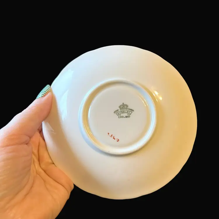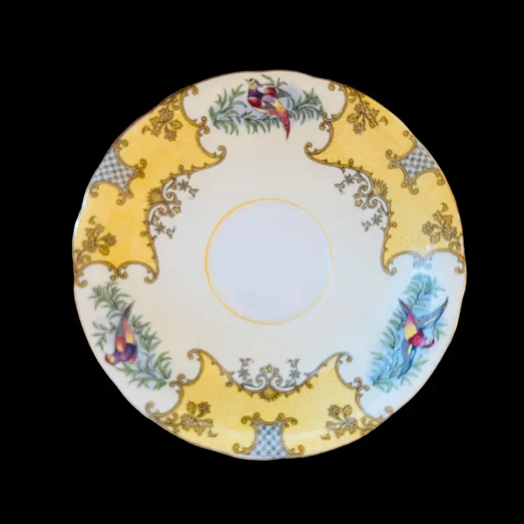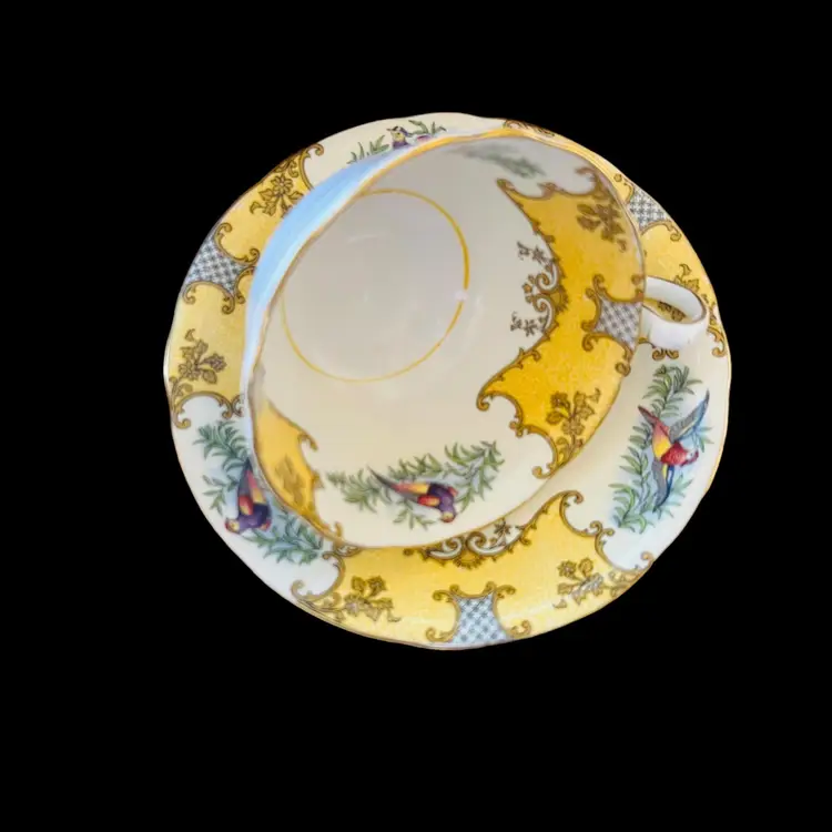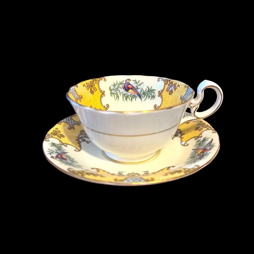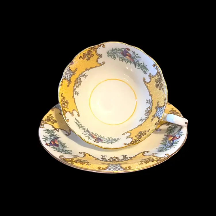 This beautiful cup and saucer set was made by Aynsley in England. Both pieces are white with ornate gold and yellow scrolls. In between is a colorful bird perched on a branch. Both the tea cup and saucer have a yellow ring in the center. Both pieces are marked, "Aynsley, England, Bone China, C456" below a crown.