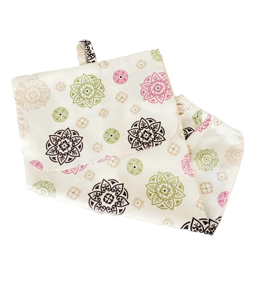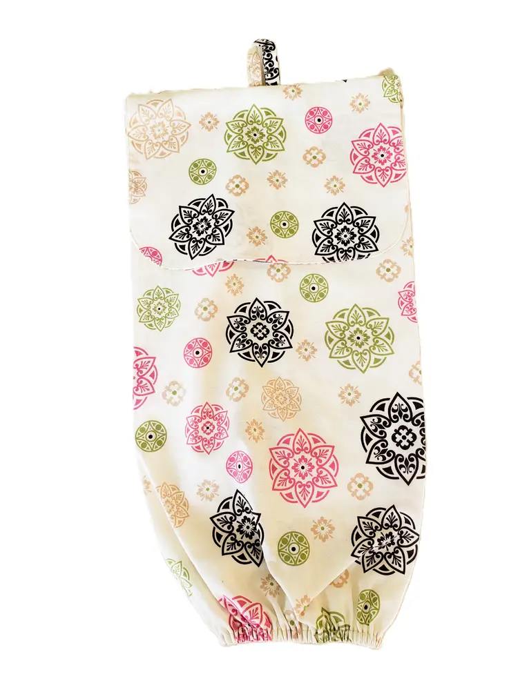 This one is made of a pretty cotton fabric. It is tan with green, pink, dark brown, and beige medallions. It has a loop for hanging. This will go with almost any color decor.