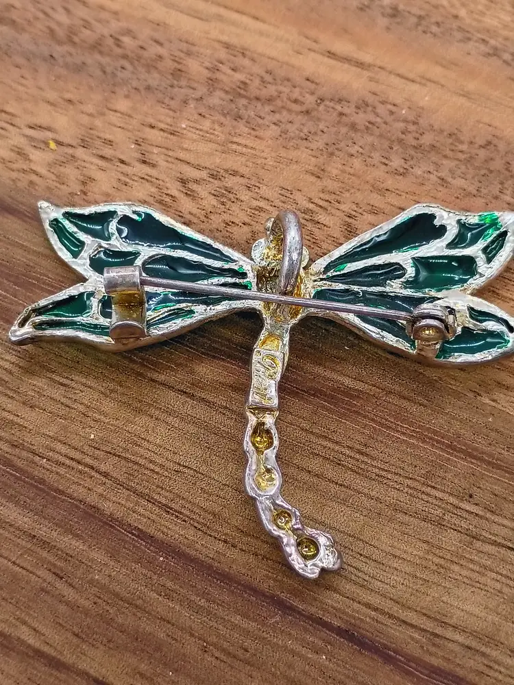 BEST Gold Tone with Black Rhinestone and Green Glass Dragonfly Brooch Pendant. The wings are open filigree with glass enamel in a deep green . This is 1.5 inches across the wing span and 2 inches from head to tail. This is preowned, no damage to glass enamel in the wings, Rhinestone eyes intact, no tarnish or oxidation to metal., Pin is secure and functions normally this also has ring for wearing as a pendant. Excellent condition. Ships USPS