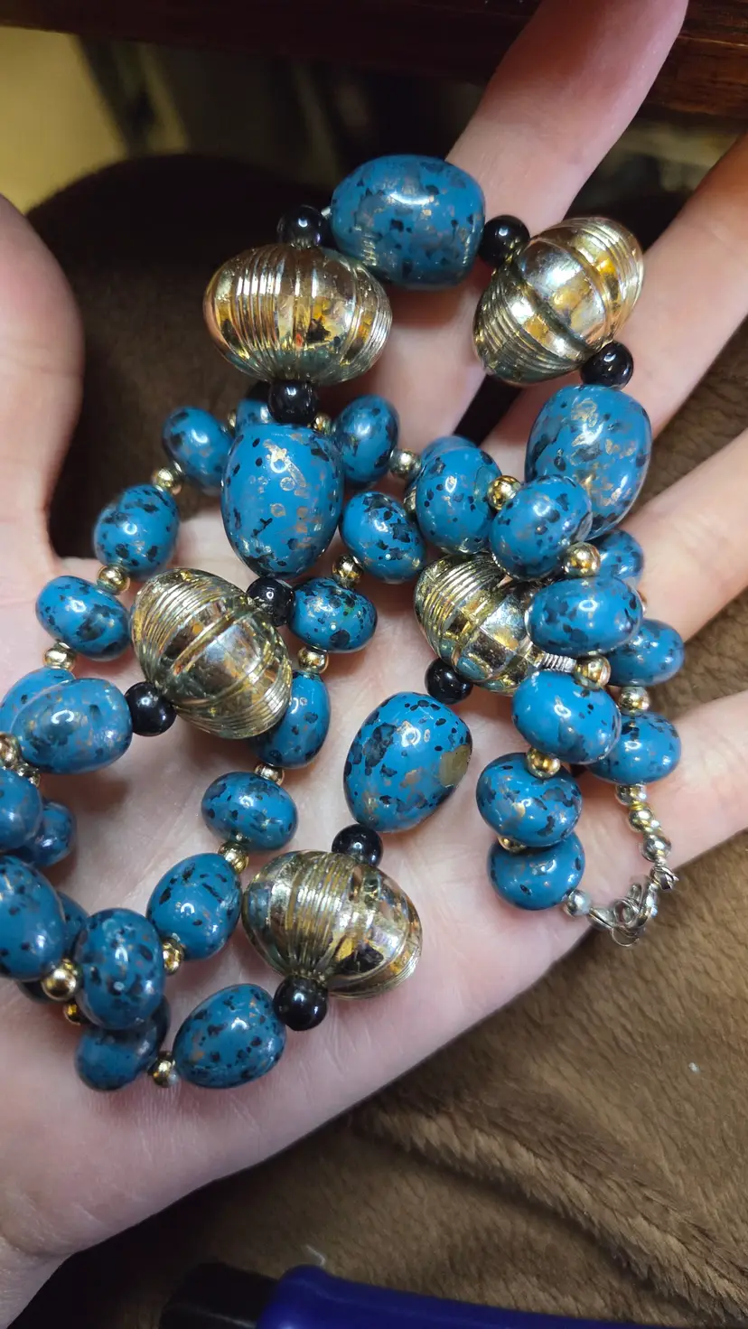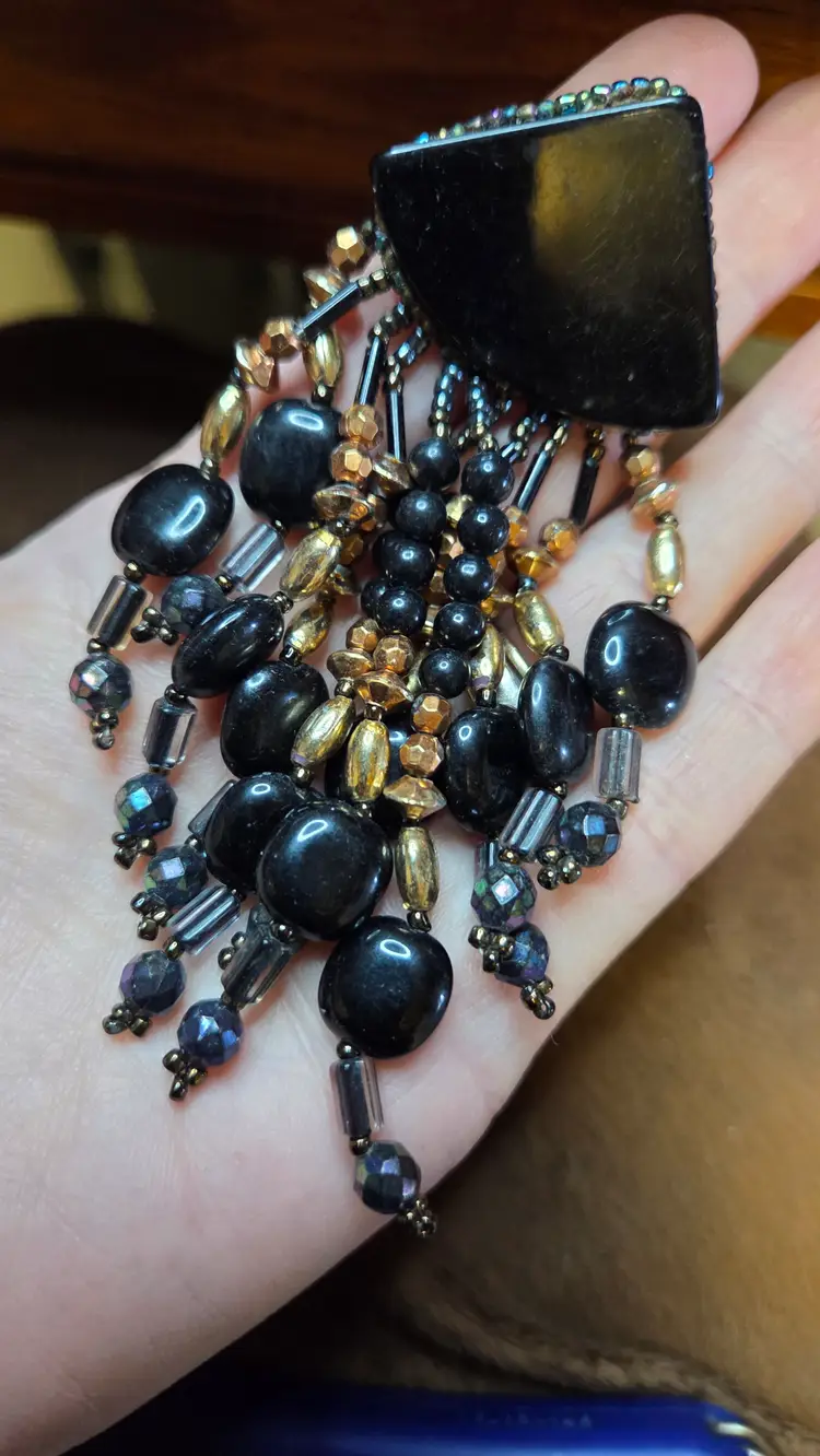 This gal is made with a black seed bead beak. Her head and body are made from a necklace purchased from @orangehoundstidios. She has amazing things...check her out! The beads have a stormy mixture of blue and gray but a little gold shines through to remind us that even on the cloudiest days...the sun always comes out eventually. Her tailfeathers came from a bead harvested from an earring that needed to see new life ๐คฃ