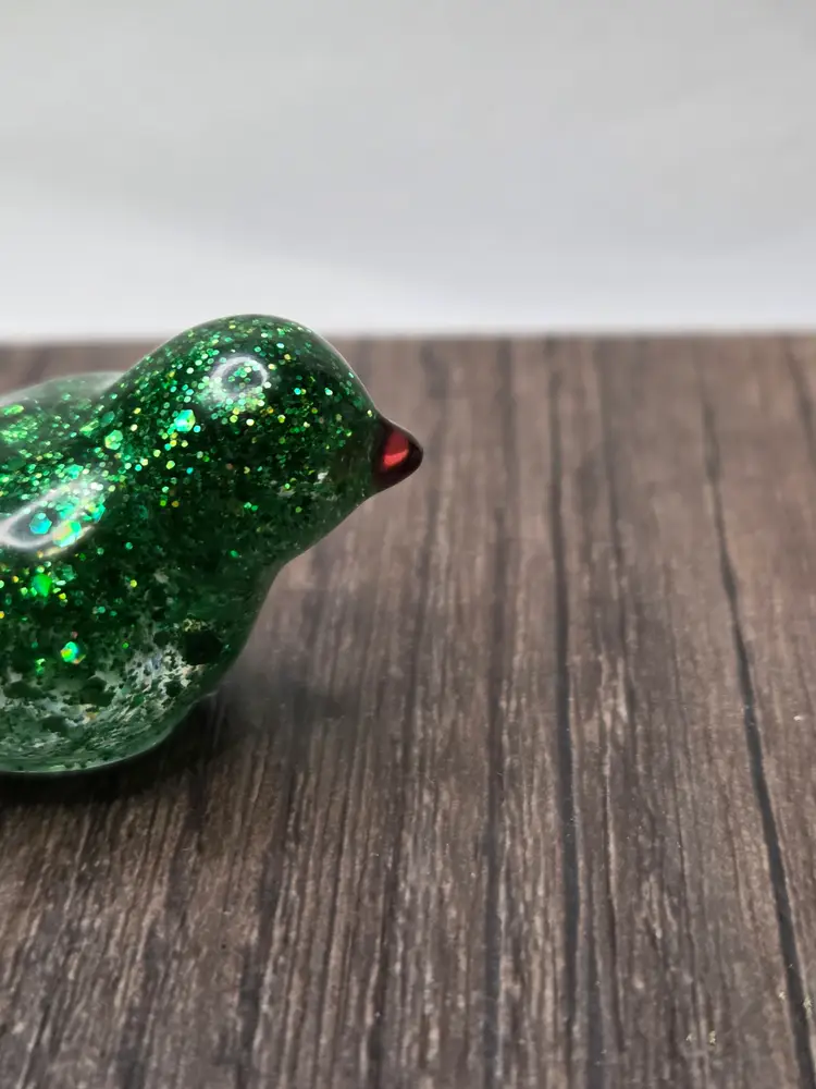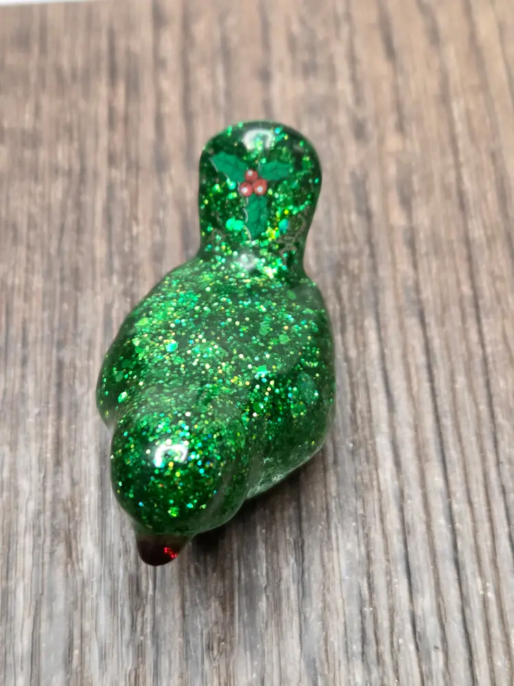 She is made with a dollop of red resin for her beak, a holly nail art sticker for her tailfeather and her body is a sparkley mix of resin and chunky green glitter.