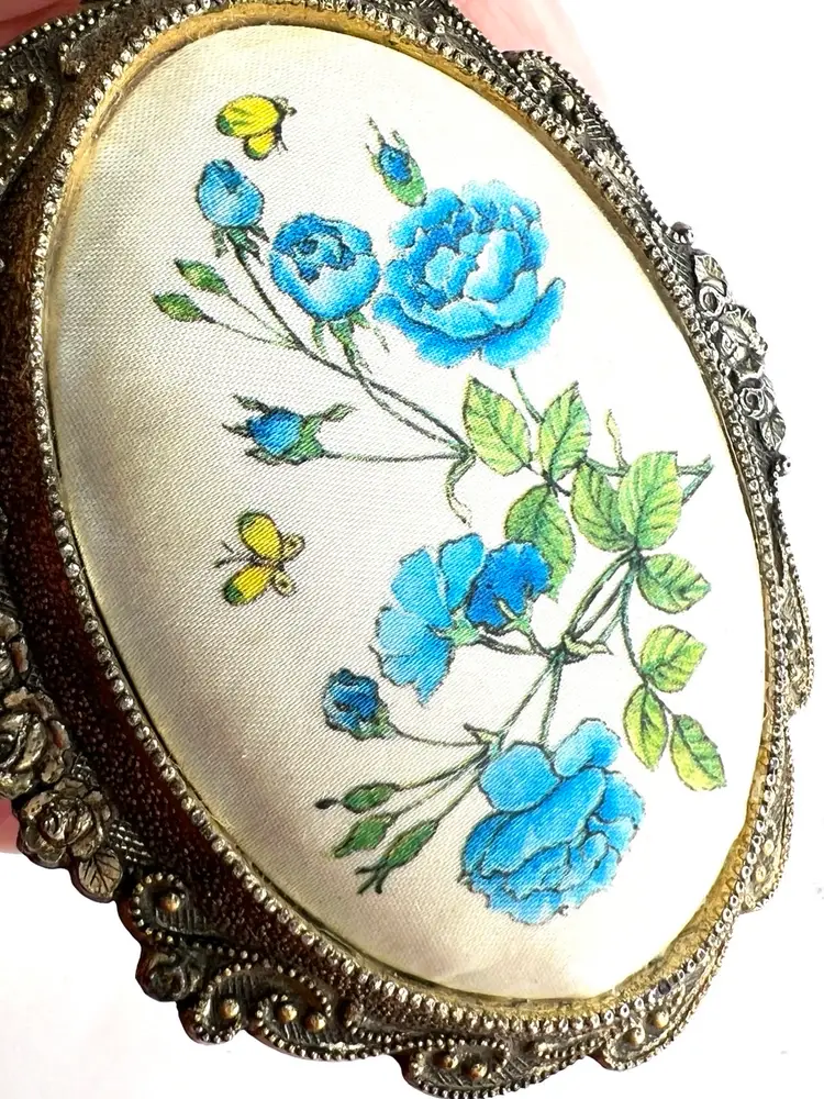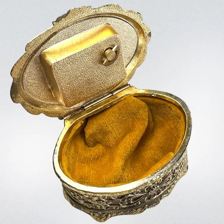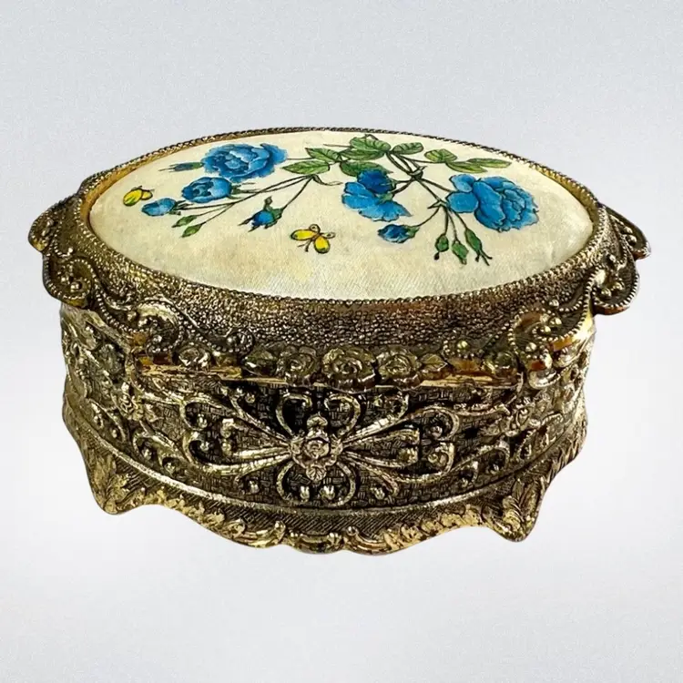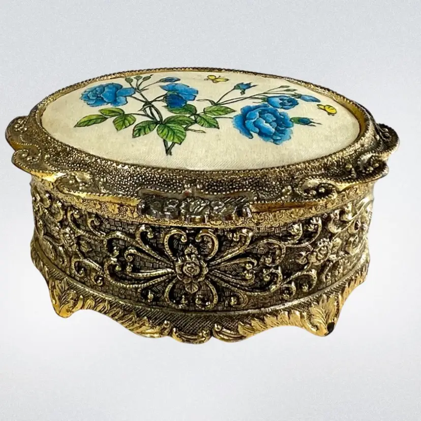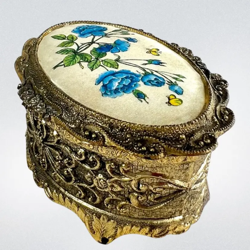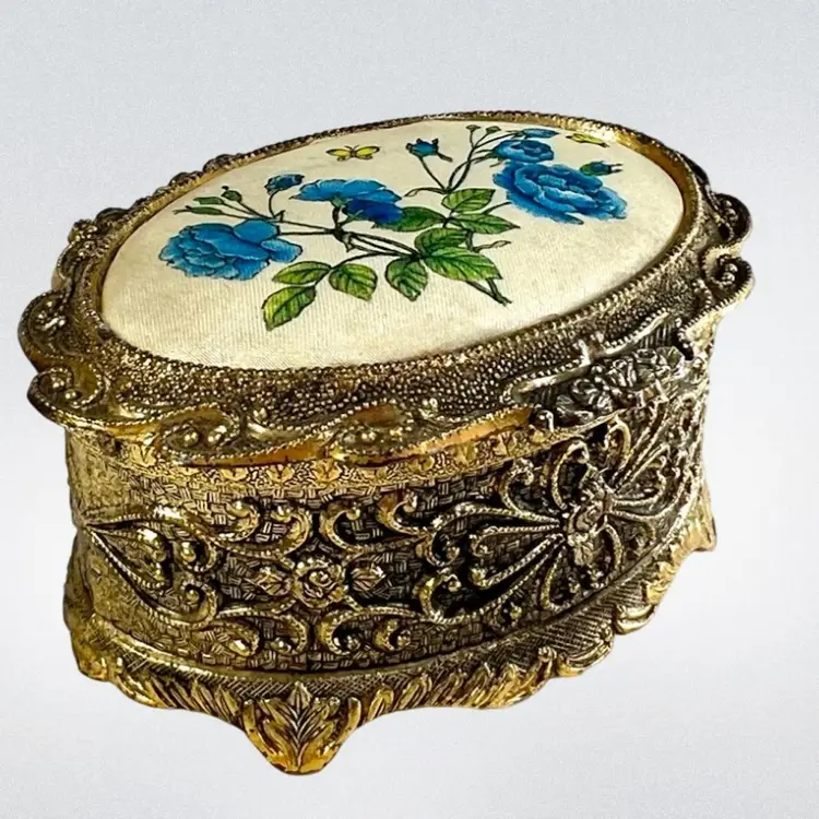 Please watch video with sound on 🔉 Blue Floral Music Jewelry Trinket Box Plays "We've Only Just Begun”, a popular song from 1970s sung by The Carpenters Warm Gold-tone Finish Golden yellow fabric interior Embossed “Japan” On Bottom Great Working Condition with quality Sankyo musical mechanism We cleaned & oiled the mechanism Open Lid to Wind & Play Close Lid to Stop Weighs 8 ounces 3-1/4” x 2-1/2” x 1-3/4” Condition: Plays beautifully, slight metal patina, see last 2 photos for spot on foot, floral top vintage aging look but no rips