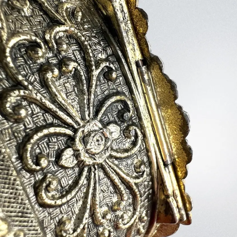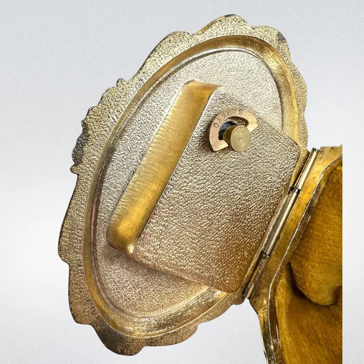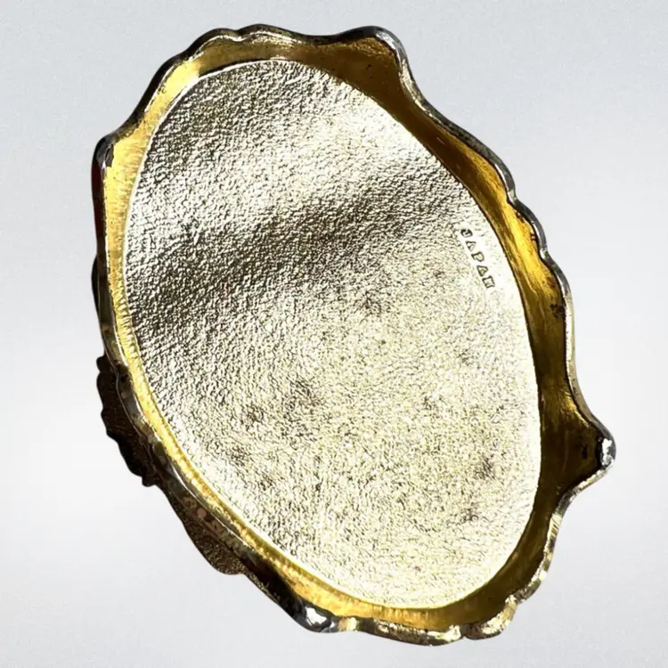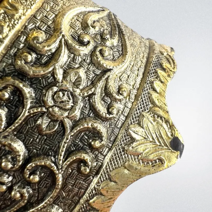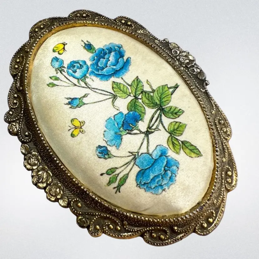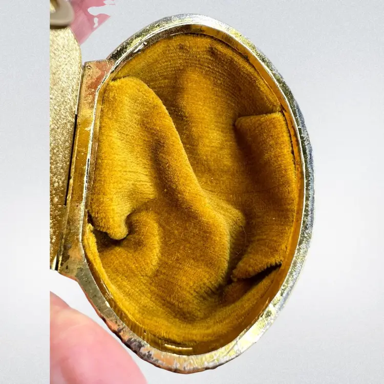 Please watch video with sound on 🔉 Blue Floral Music Jewelry Trinket Box Plays "We've Only Just Begun”, a popular song from 1970s sung by The Carpenters Warm Gold-tone Finish Golden yellow fabric interior Embossed “Japan” On Bottom Great Working Condition with quality Sankyo musical mechanism We cleaned & oiled the mechanism Open Lid to Wind & Play Close Lid to Stop Weighs 8 ounces 3-1/4” x 2-1/2” x 1-3/4” Condition: Plays beautifully, slight metal patina, see last 2 photos for spot on foot, floral top vintage aging look but no rips