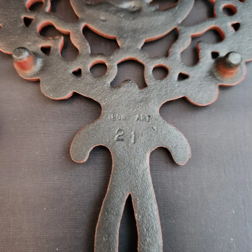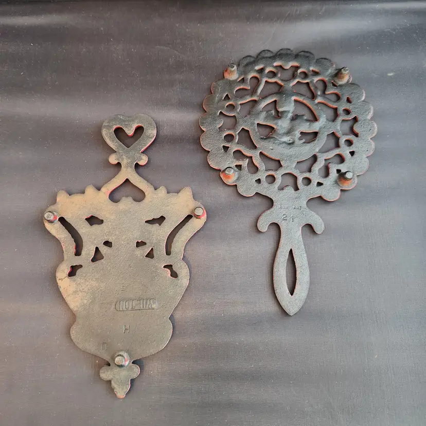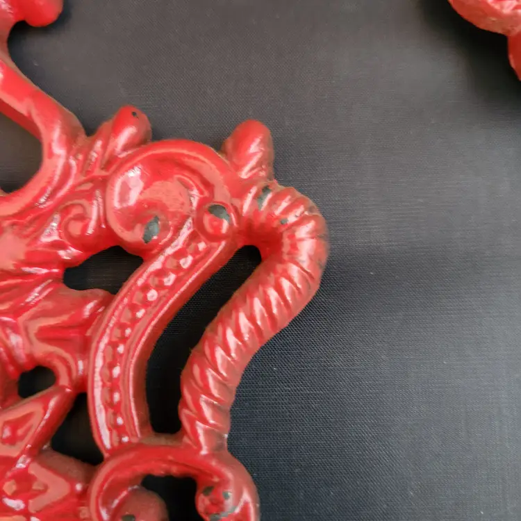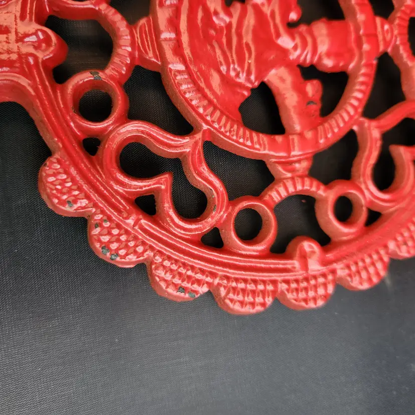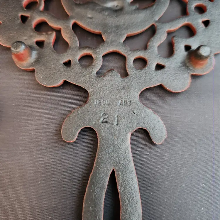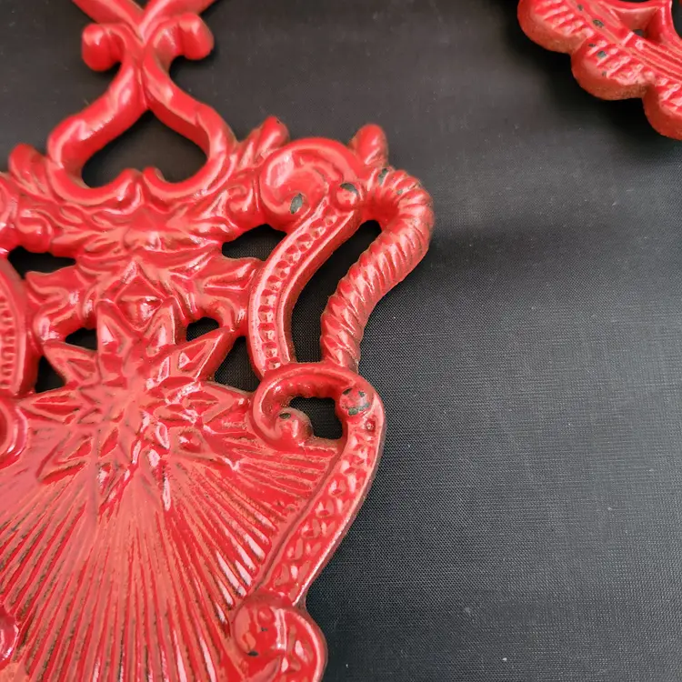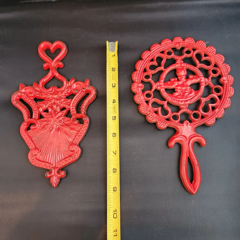 These are a set of 2 cast iron Pennsylvania Dutch folk art footed trivets. These are made to do double duty as wall art and table trivets. These are in red enamel which is harder to find.