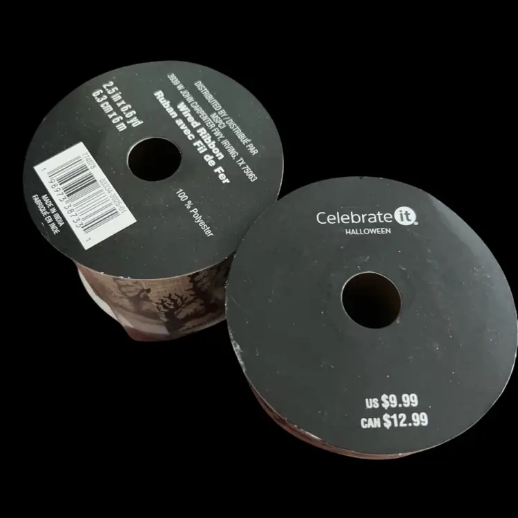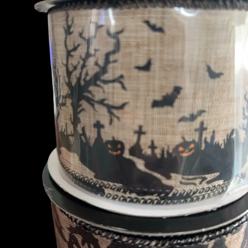 Two full rolls they measure 2 1/2“ x 6.6 yards, 100% polyester. Flying bats 🦇 and spooky cemetery scene!